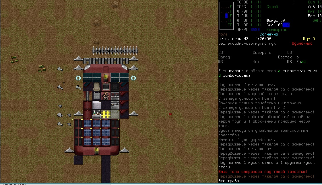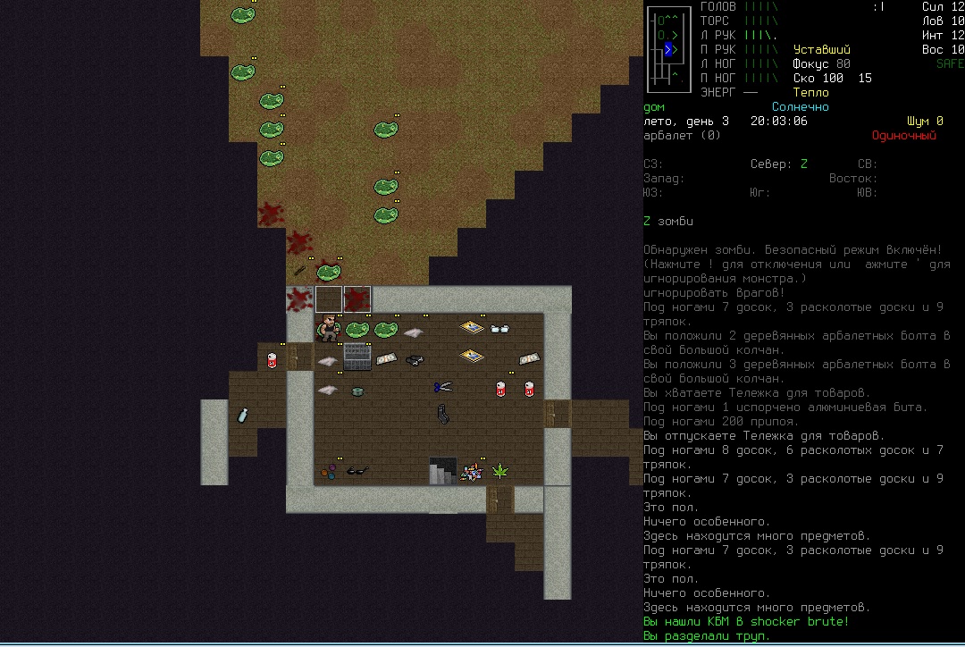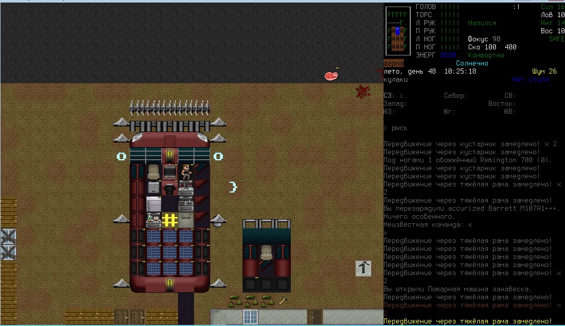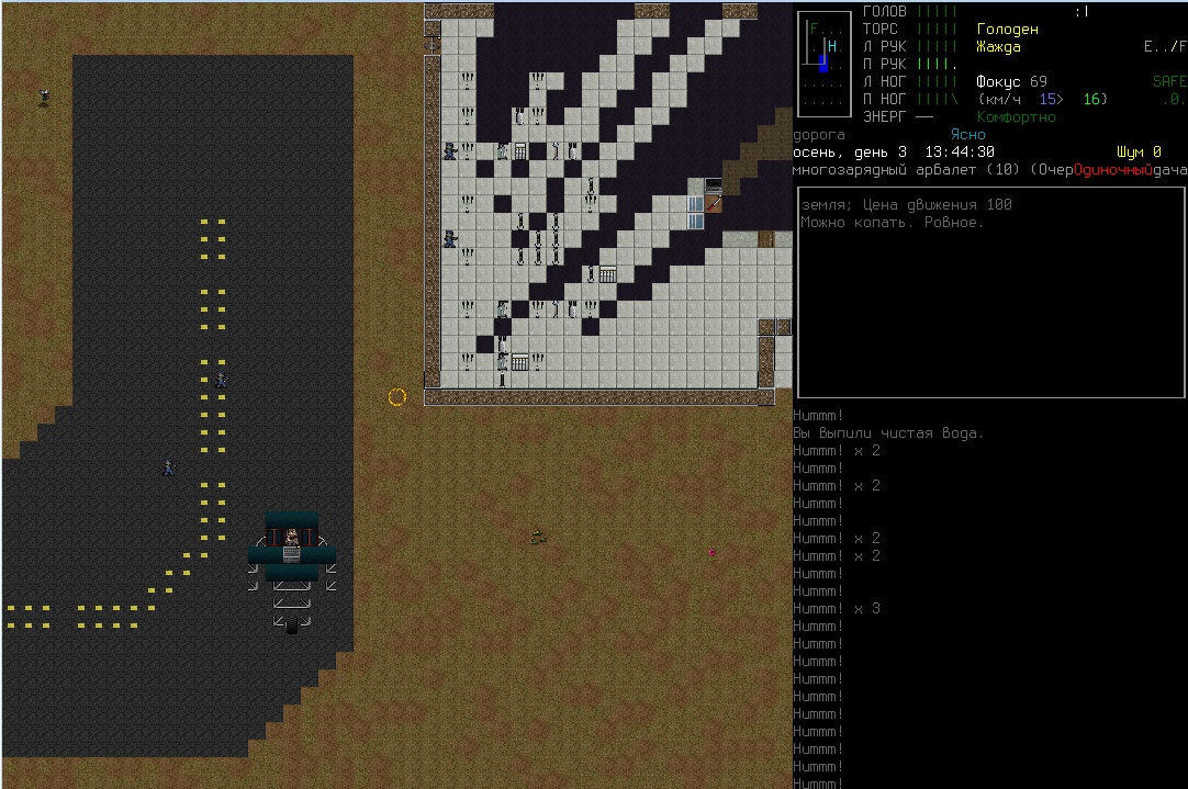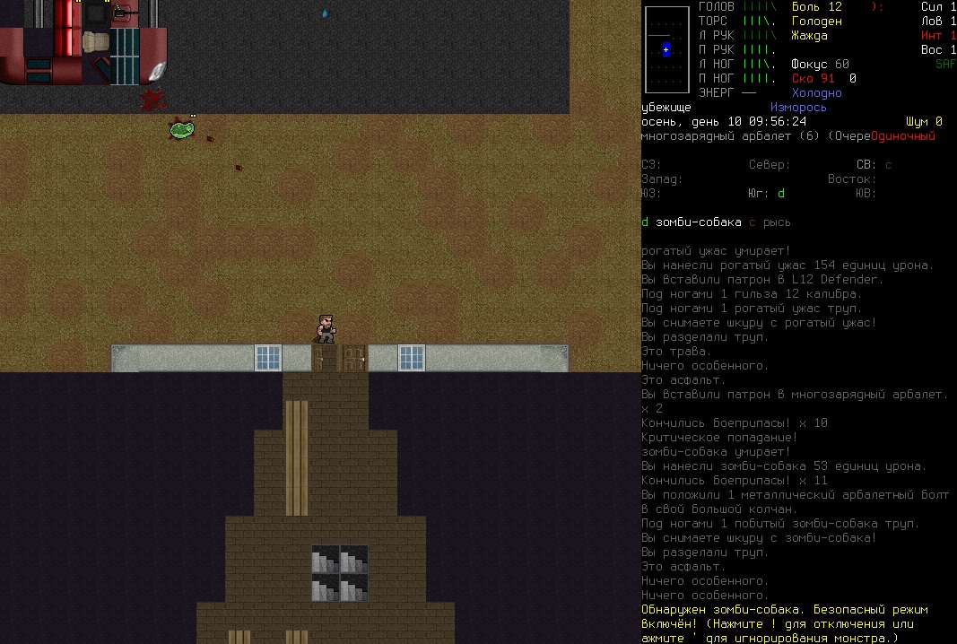 Качнул луки, как же это круто когда стрелы делаются буквально из говна и палок. Кончились- залез в окно и разбил мебель на аммо лол. Хотел соседа увести в новое место жить а этот говнюк по дороге что-то не поделил с муравьем, в итоге они его загрызли, с тела снял помятый арбалет и немного болтов, ваншотит собак и мелких грызунов, снимает по 15-50, охренеть. Нашел книгу, что-то там с луками связано, может найду там рецепты для болтов, кто знает. Поясните за скорость и за скованность, что-то не разберусь никак, то медленно на меня набегают, то быстро так окружают. Не могу по скелетам попасть, по собакам в частности. Вот решил устроить бойню у военного лагеря, не далеко нашел ферму, вокруг все заминировано, капканы и ямы, хорошо что заметил а то хана. Внутри много кроватей и записки выживших, видимо все таки их поимели, на огороде отожрался от пуза еще.