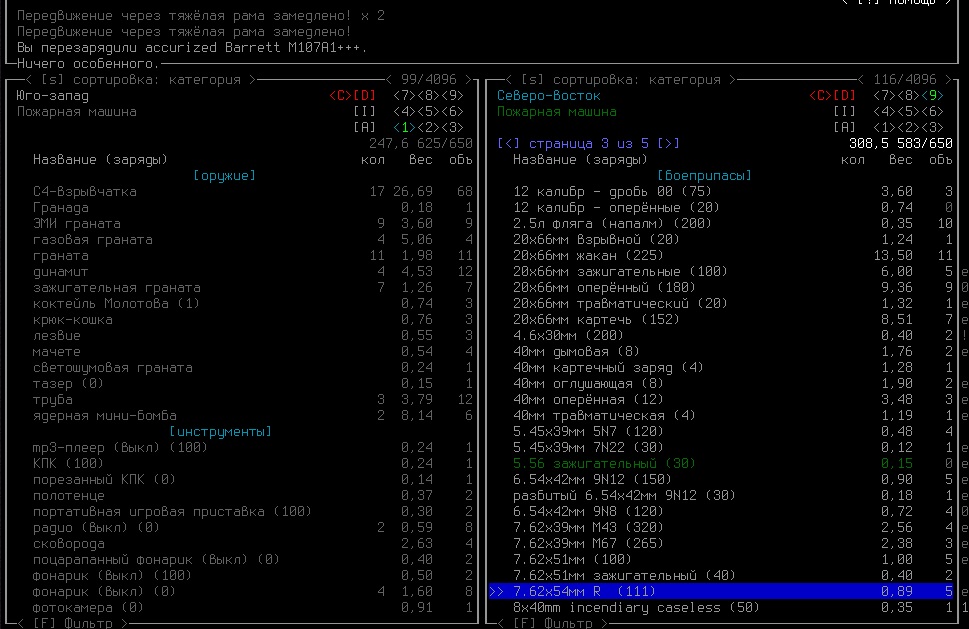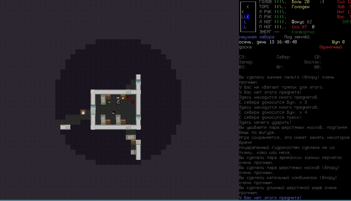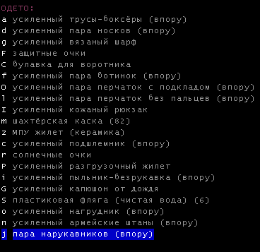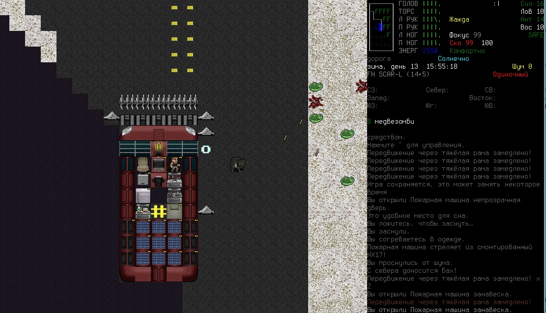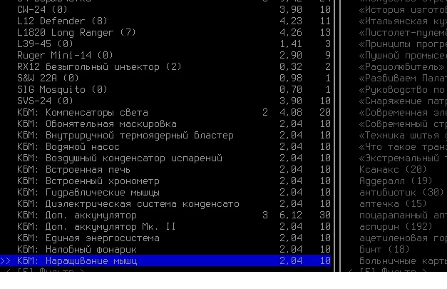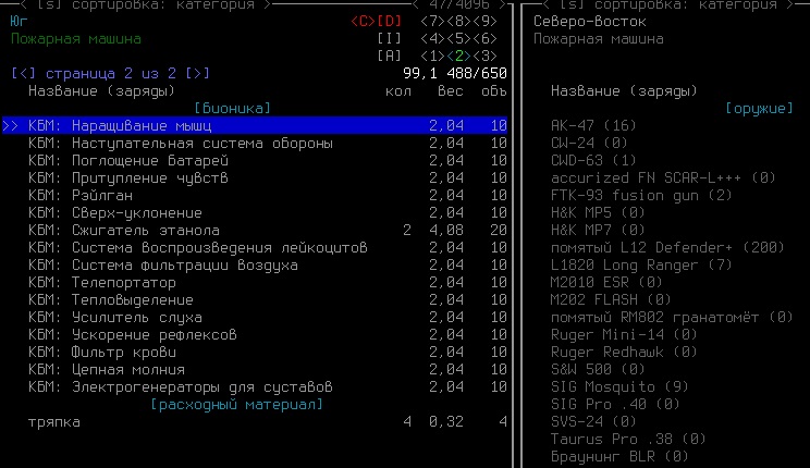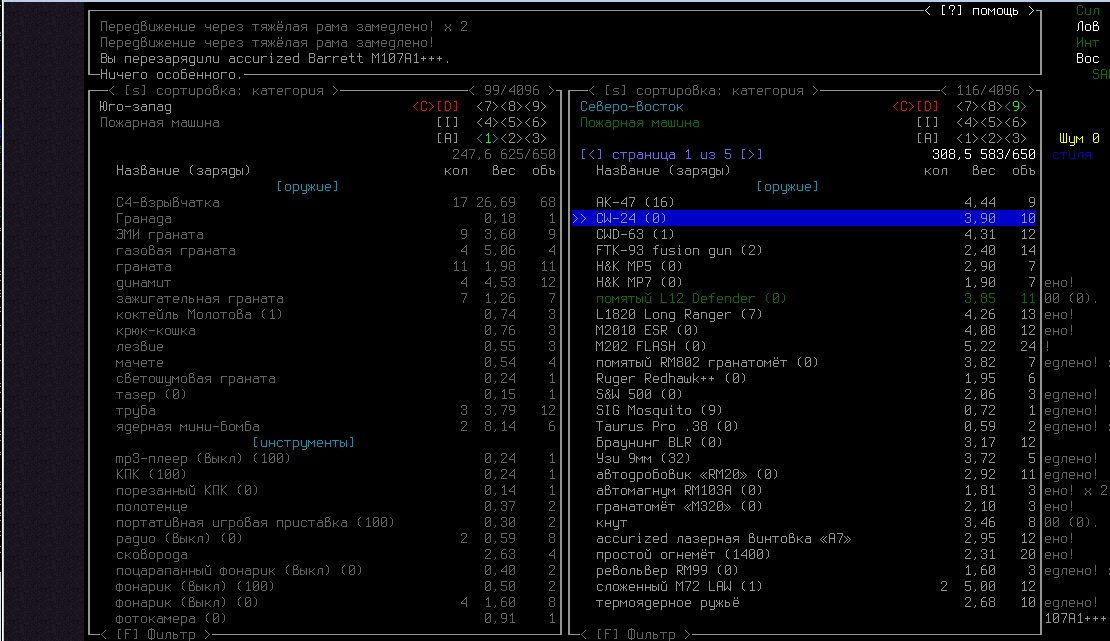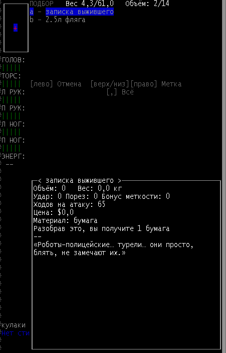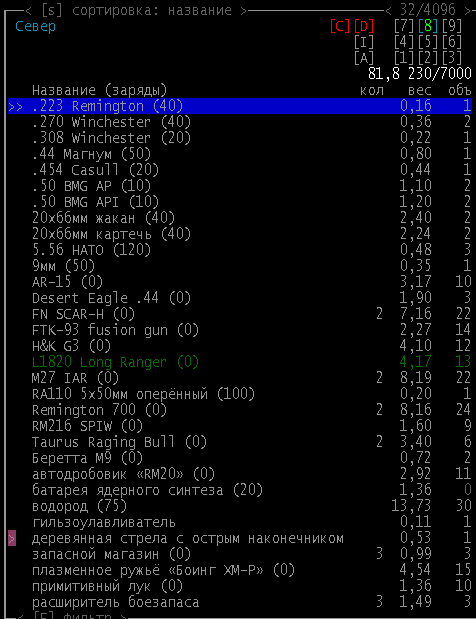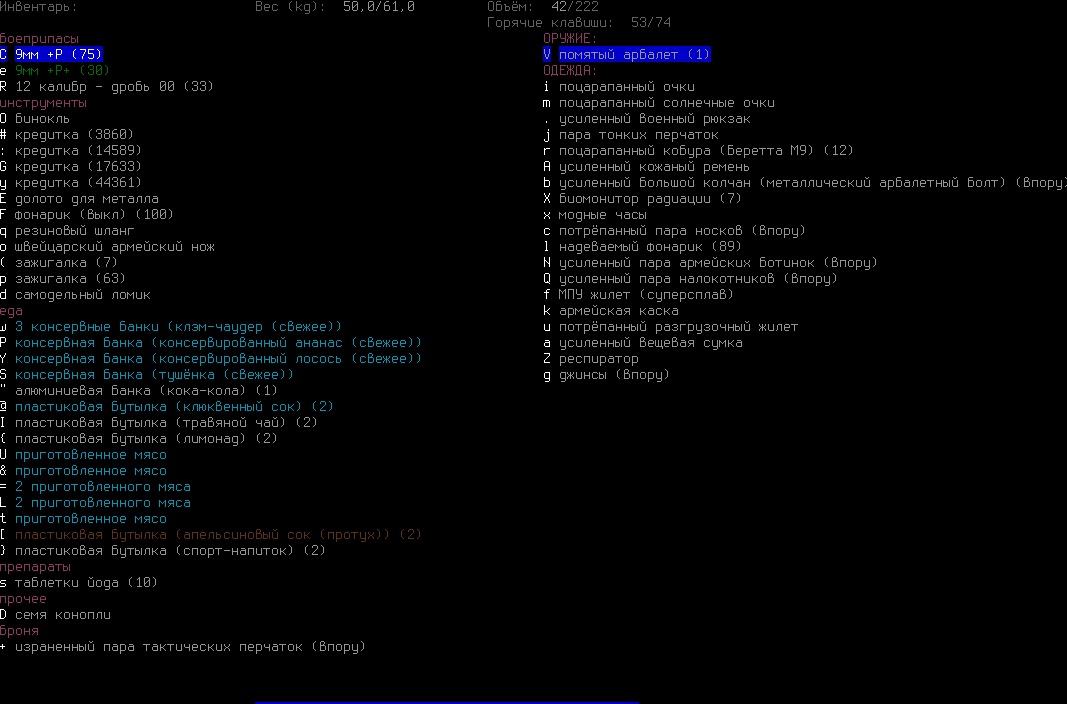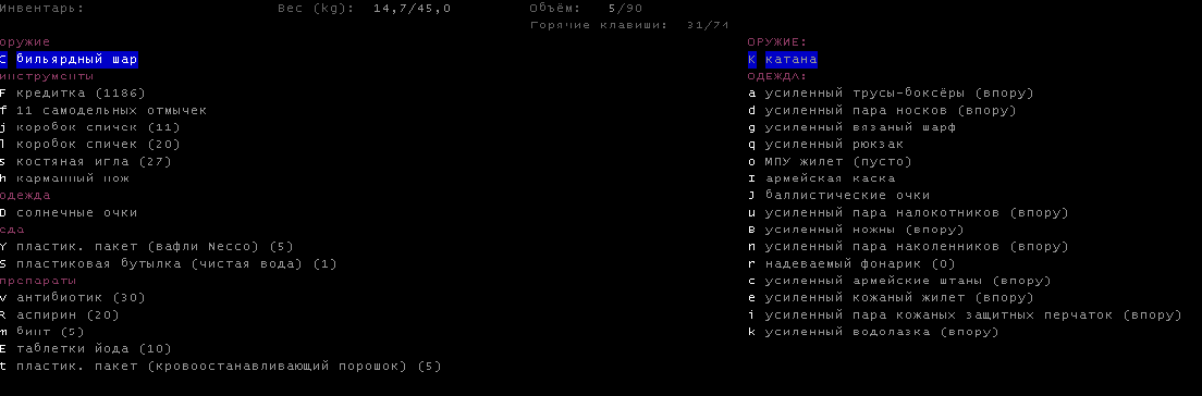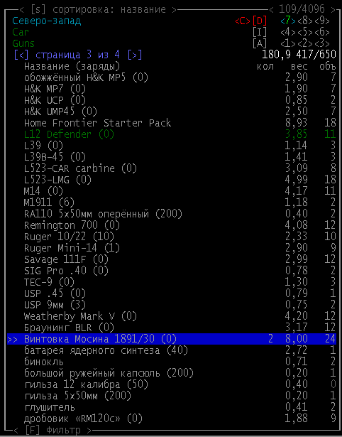 >>1619 Удобрения же вроде крафтить можно. Фургон бы броней какой-никакой обмазал, на всякий случай. Я решил немного отдохнуть в жилом комплексе и разобраться с шмотом, потестировал новый лук с метал. стрелами, арбалет пока отложил. Тут заметил то, о чем не подозревал за все время игры, блять!1 Теперь то все по полочкам расставлю.