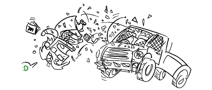 >>1603 Я вот сейчас ехал на таком >>1550 транспорте, 80 км-ч. И впереди робот-курица. Залп и нет меня. В следующий раз попробую перенести управление подальше от лобовой части.