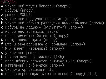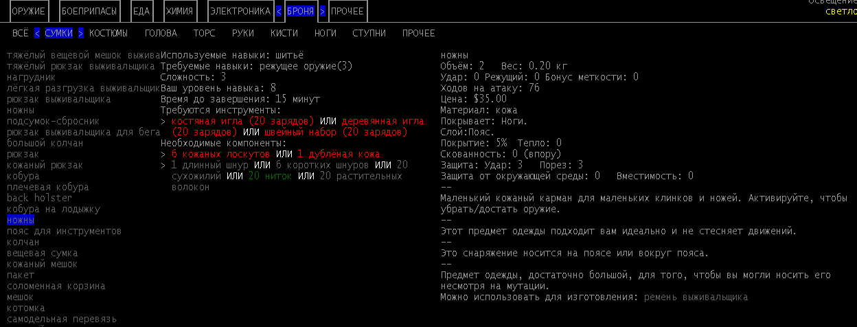 Насчёт шмота: если почитаешь книги по шитью и выживанию, то сможешь крафтить одежду выживальщика, там просто куча вариантов и все очень крутые. Разные рюкзаки, жилеты, плащи, комбинезоны и.т.д. Все очень крепкие и вместительные.