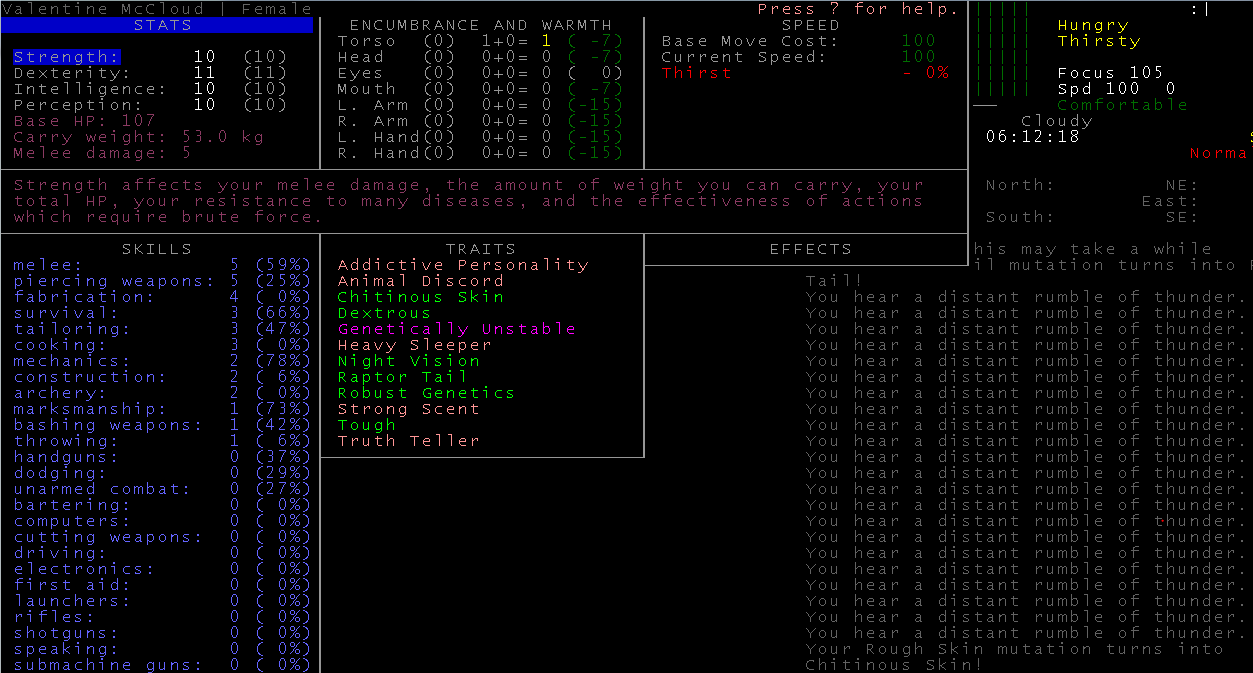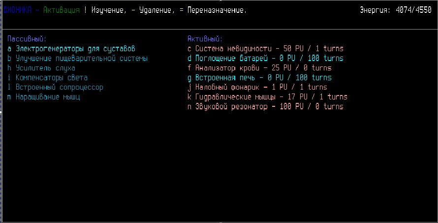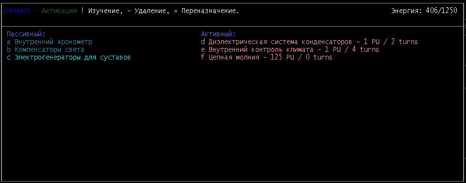 >>768 Да, некоторые мутации теперь можно активировать. При использовании увеличивается голод, жажда или усталость. В зависимости от мутации. Но таких немного, можно активировать когти, хвосты, крылья и в ветке грибных мутаций вроде что-то было.