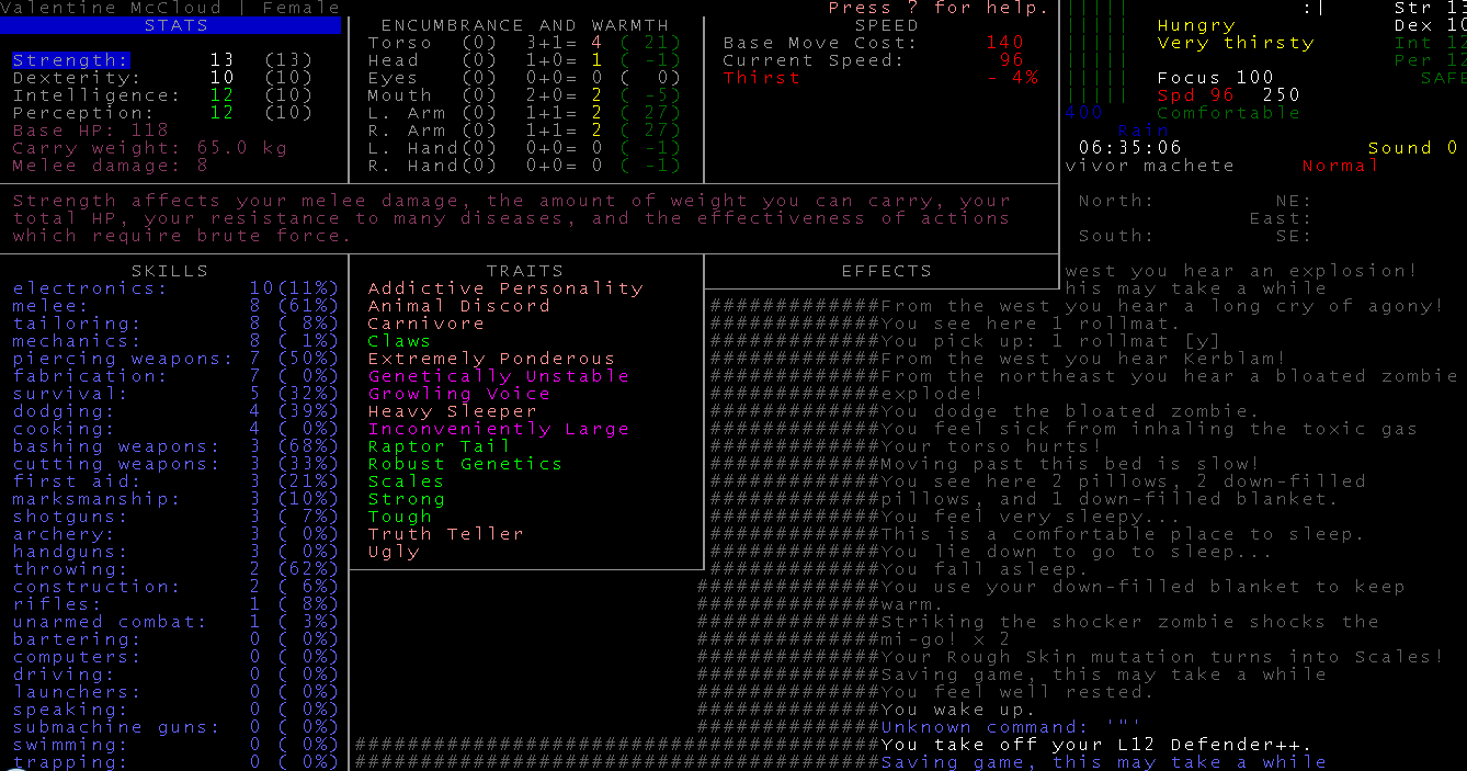 Ох уж эти эксперименталочки. Пикрелейтед перенес сейв в новую версию 2610, а там поломали систему голода, жажды и усталости, в итоге после восьмичасового сна я сдыхаю от жажды, голода и дикой усталости.