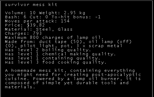 Полгода прошло, перс превращается в рептилоида-слоупока, пришлость перейти на кочевой образ жизни. Алсо, survivor mess kit - совершенно незаменимая вещь, можно спокойно забыть про батарейки, аккумуляторы, залил масла и все. Да и в последних билдах крафт масла для ламп существенно упростили.