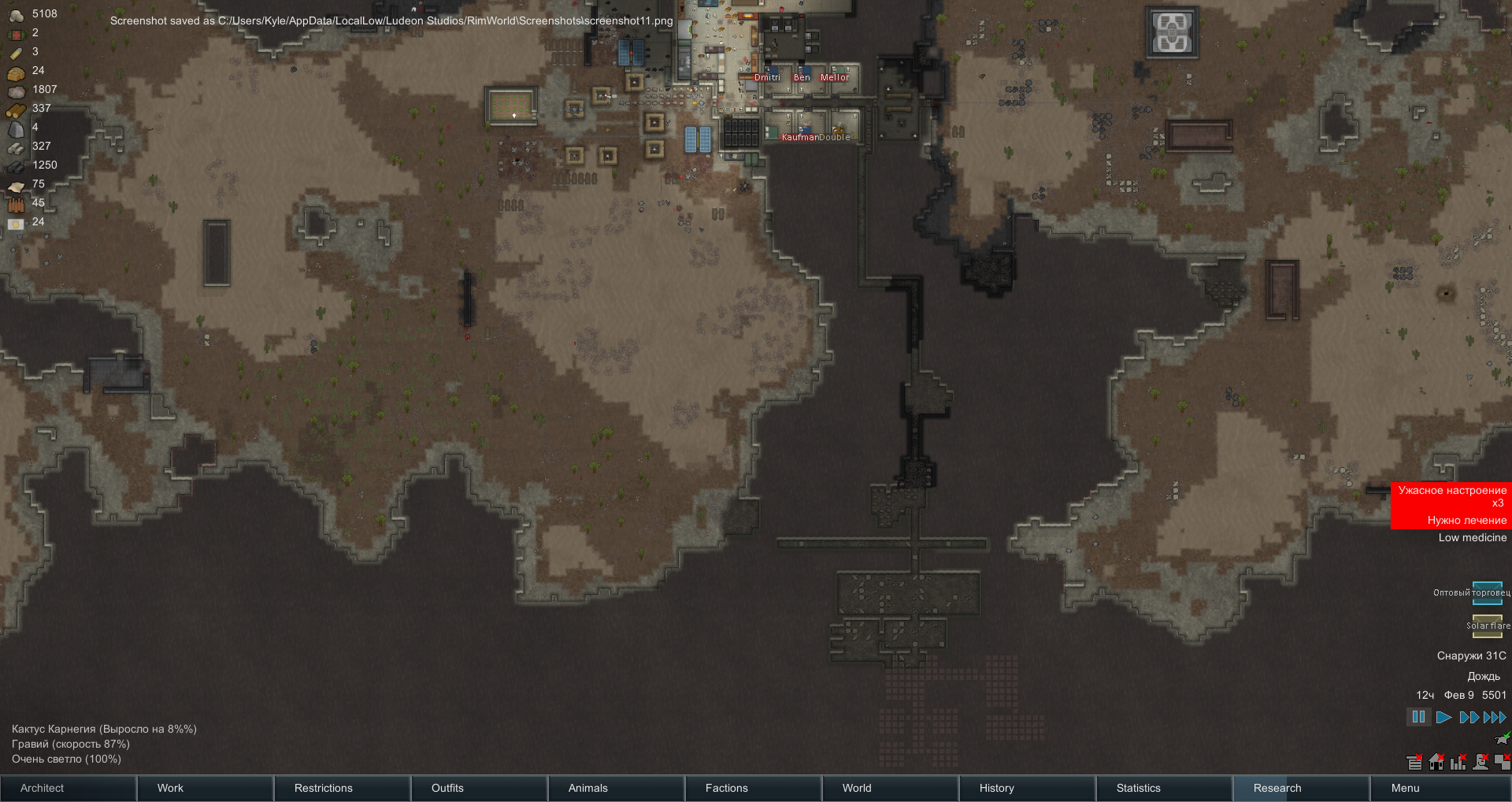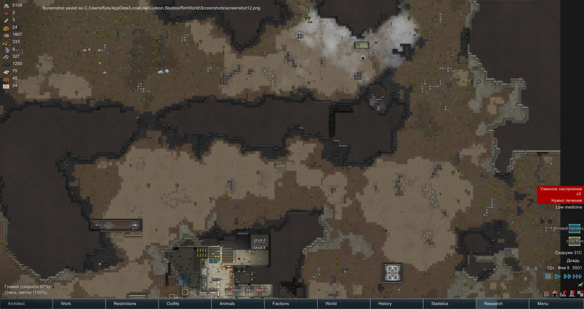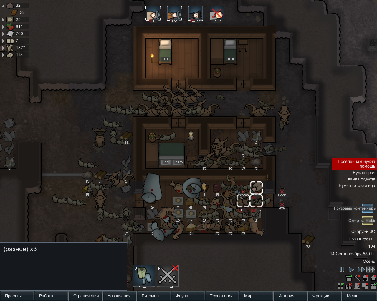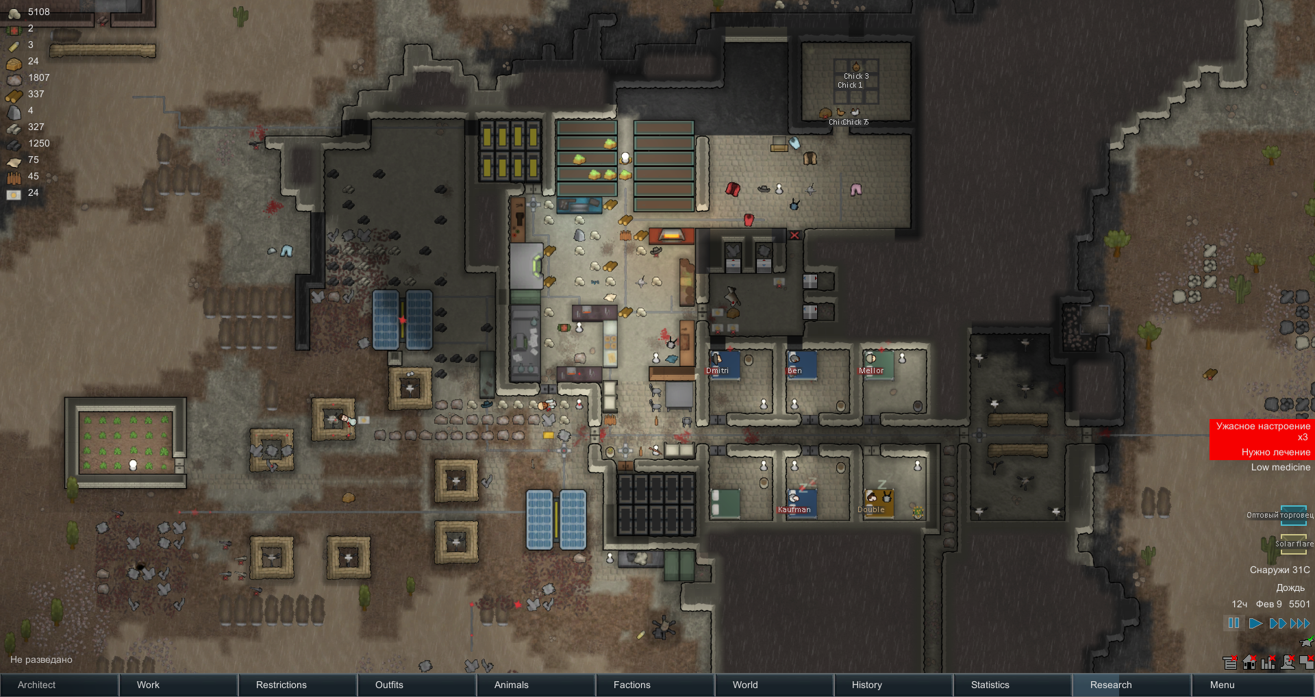 Это официальный тред игры? Моей колонии видимо приходит пиздец. 1й пик. Текущее состояние, все основные ранены и серьезно, хуевое настроение на грани стресса и срыва. Это после боя с рейдерами, который высадились прямо на базу во время солнечной вспышки. Турели не работали, а основной стрелок был обстрелян и еще и заболел и валялся в госпитале. Я его конечно поставил в строй, но он был слабее и косил. Бойня с рейдерами была в открытую и почти все участвующие получили ранения. Чудо, что никто не откинулся в этот раз. Рейдеры успели сломать 3 из 5ти солнечных батарей, на которых держалось энергоснабжение базы (еще есть два ветровика и две геотермалки, конечно, но именно с тем, что было база медленно накапливала энергию, а теперь будет уходить в минус). Теперь придется видимо все вырубать и экономить, чтобы не остаться без света в же первый день. 2й пик. А началось все с посадки враждебного корабля в ебенях до которого я все не мог дотянуться. Отрядил снайпера, думал сагрю их на мою оборону, но они дали ему пизды и остались на месте. Потерял одного мобильного юнита только зря. Начал копать пещеры рядом, чтобы настроить там турелей и хоть как-то попытаться их отстрелять. 3й пик. Немного не успел до постройки новой базы и переезда туда в горы, где только один вход был бы и куда нападения всяких копальщиков ебаных (которых я кое как пережил уже 4 штуки) были бы менее болезненными. В центре карты конечно удобно до всего добираться, но я слишком открыт для атак и страдаю каждый раз, когда появляются копальщики (а кроме них, пидаров, никто и не появляется в последнее время) и это не удобно. И так уже потерял двух из первых трех колонистов, которые были хороши и полезны. Сейчас численность 4, но из них полезны в чем-то нормальном только двое и даже среди них никто не умеет в общение и новых людей я приманить к себе не могу. Вообщем, все сходят с ума потихоньку. Основные деятельные персонажи выведены из строя и как бороться с инопланетянами не понятно. Похоже, что это конец, ну либо начало сложного трайхарда.