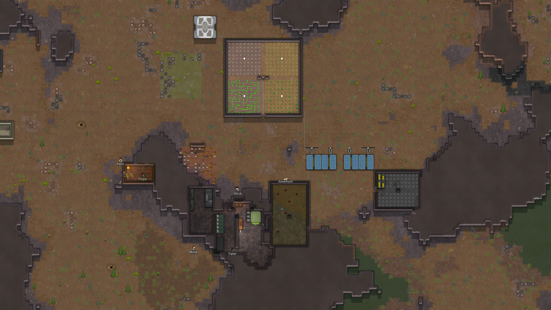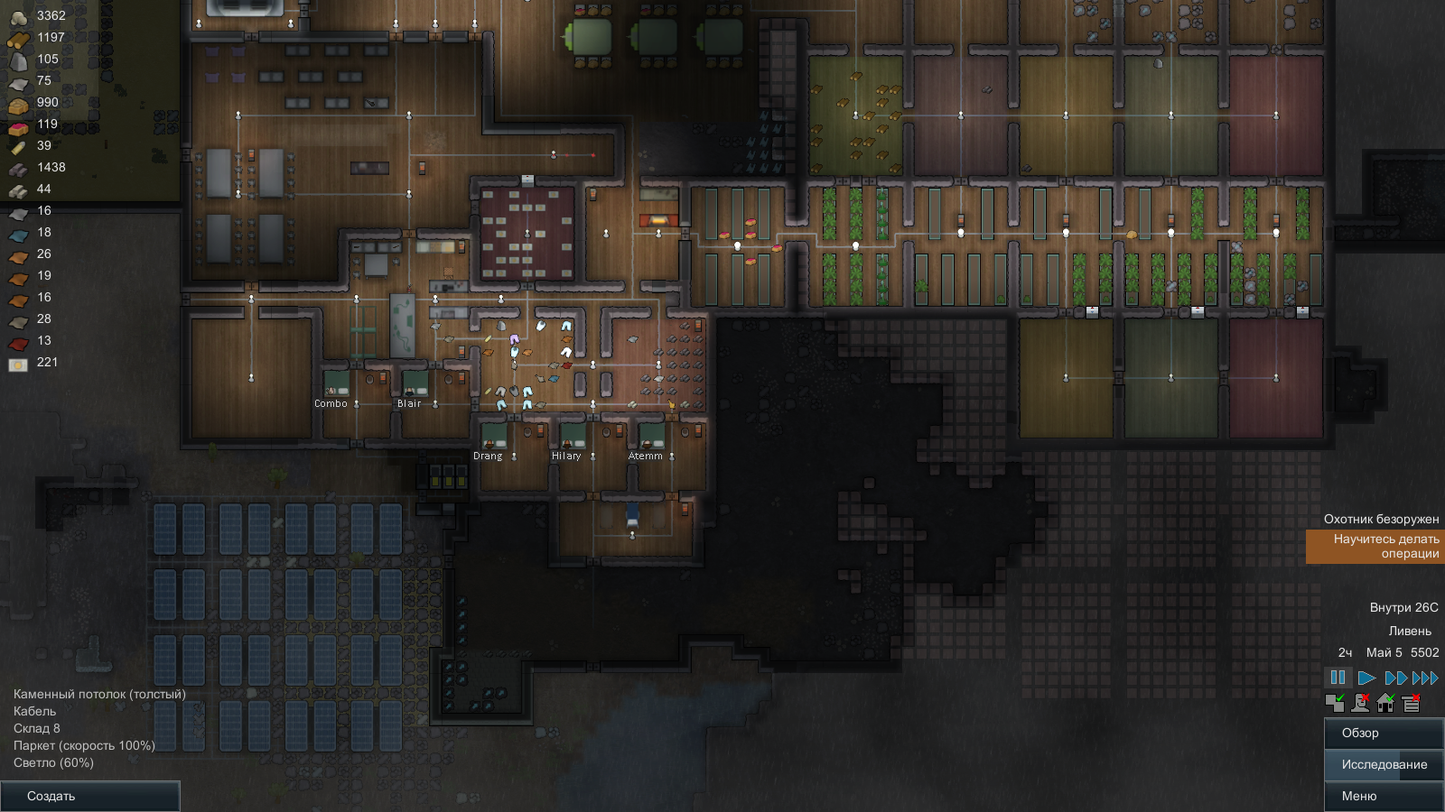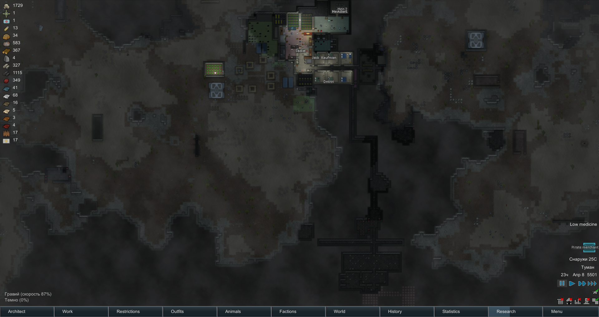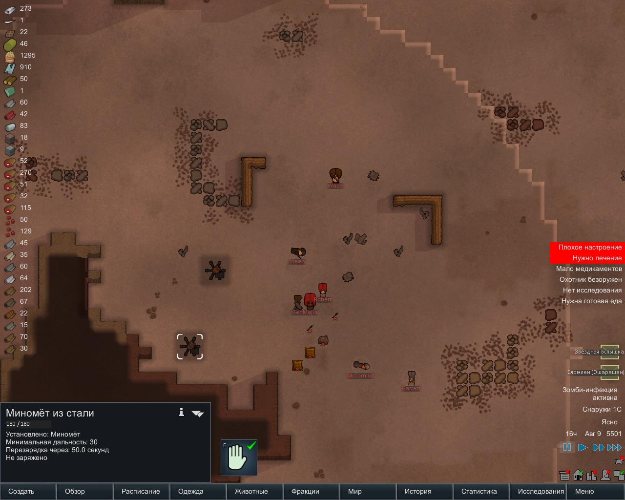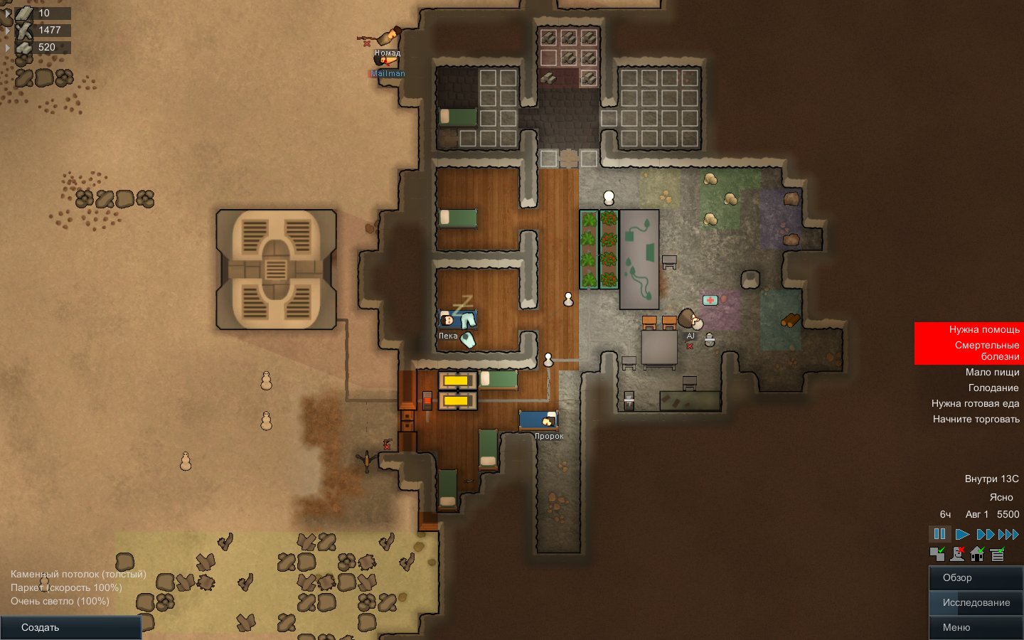 Это официальный тред игры? Моей колонии видимо приходит пиздец. 1й пик. Текущее состояние, все основные ранены и серьезно, хуевое настроение на грани стресса и срыва. Это после боя с рейдерами, который высадились прямо на базу во время солнечной вспышки. Турели не работали, а основной стрелок был обстрелян и еще и заболел и валялся в госпитале. Я его конечно поставил в строй, но он был слабее и косил. Бойня с рейдерами была в открытую и почти все участвующие получили ранения. Чудо, что никто не откинулся в этот раз. Рейдеры успели сломать 3 из 5ти солнечных батарей, на которых держалось энергоснабжение базы (еще есть два ветровика и две геотермалки, конечно, но именно с тем, что было база медленно накапливала энергию, а теперь будет уходить в минус). Теперь придется видимо все вырубать и экономить, чтобы не остаться без света в же первый день. 2й пик. А началось все с посадки враждебного корабля в ебенях до которого я все не мог дотянуться. Отрядил снайпера, думал сагрю их на мою оборону, но они дали ему пизды и остались на месте. Потерял одного мобильного юнита только зря. Начал копать пещеры рядом, чтобы настроить там турелей и хоть как-то попытаться их отстрелять. 3й пик. Немного не успел до постройки новой базы и переезда туда в горы, где только один вход был бы и куда нападения всяких копальщиков ебаных (которых я кое как пережил уже 4 штуки) были бы менее болезненными. В центре карты конечно удобно до всего добираться, но я слишком открыт для атак и страдаю каждый раз, когда появляются копальщики (а кроме них, пидаров, никто и не появляется в последнее время) и это не удобно. И так уже потерял двух из первых трех колонистов, которые были хороши и полезны. Сейчас численность 4, но из них полезны в чем-то нормальном только двое и даже среди них никто не умеет в общение и новых людей я приманить к себе не могу. Вообщем, все сходят с ума потихоньку. Основные деятельные персонажи выведены из строя и как бороться с инопланетянами не понятно. Похоже, что это конец, ну либо начало сложного трайхарда.