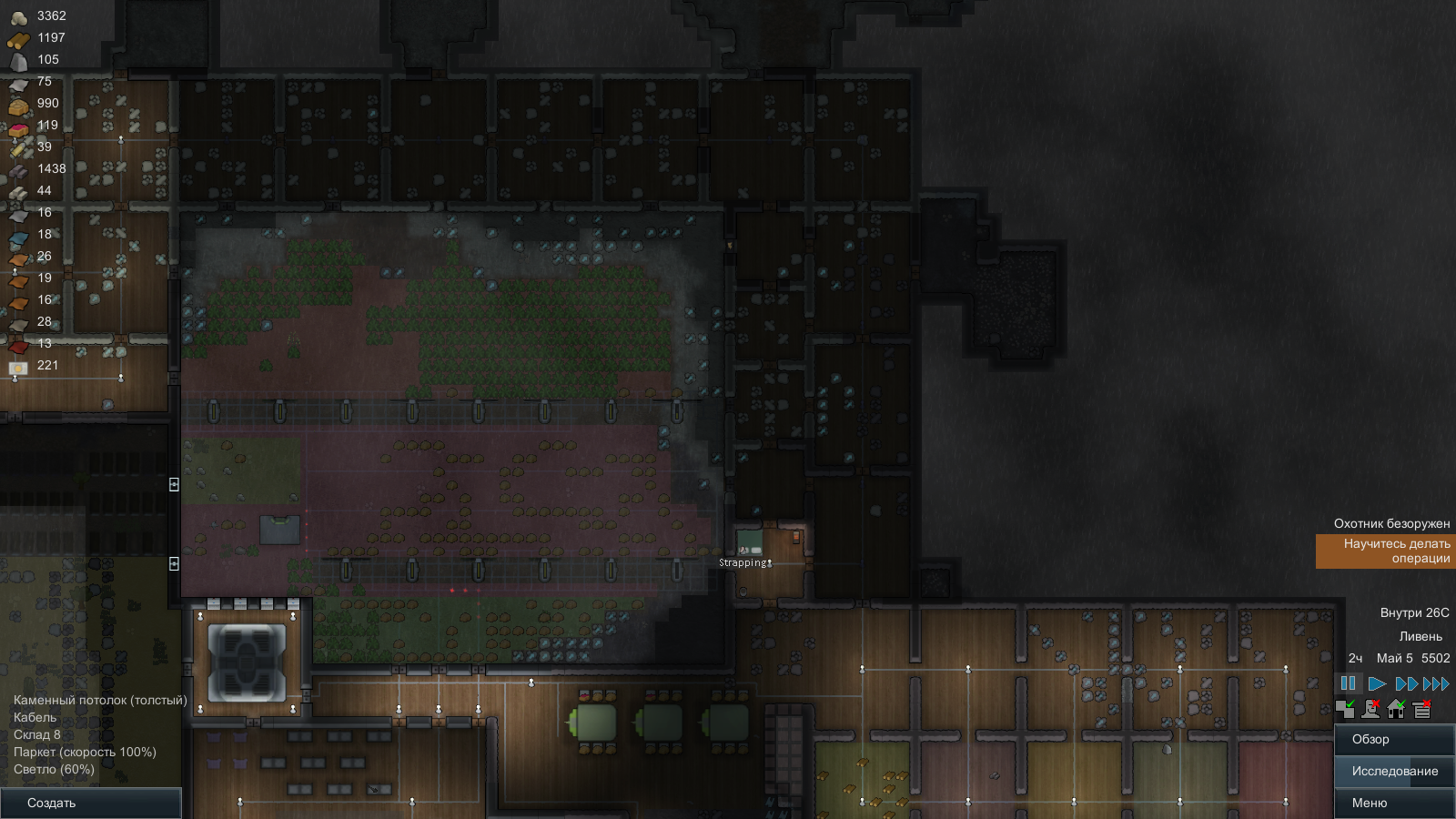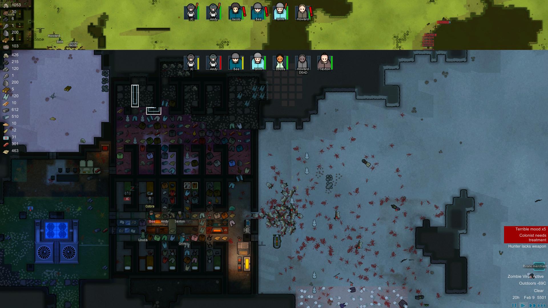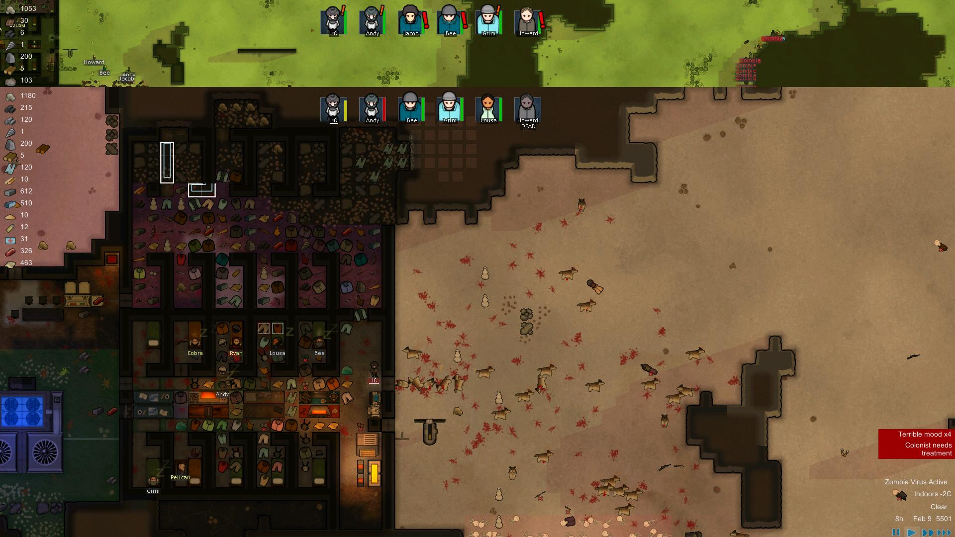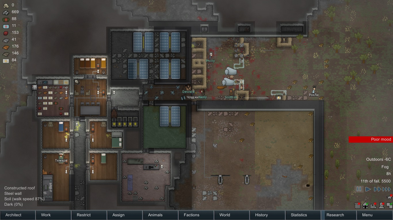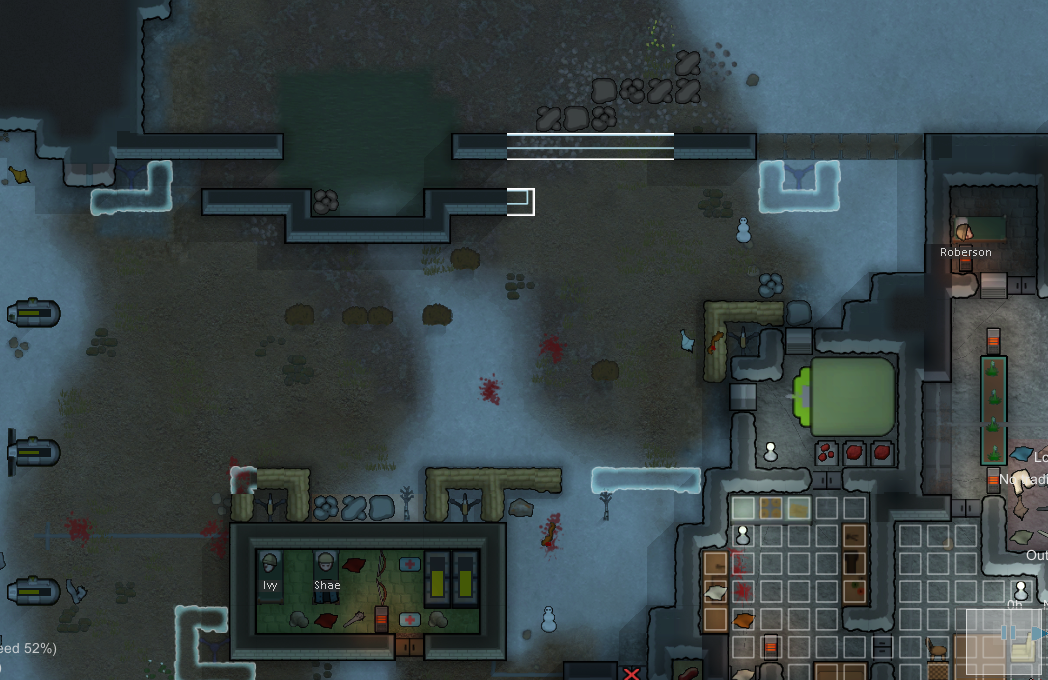 Это официальный тред игры? Моей колонии видимо приходит пиздец. 1й пик. Текущее состояние, все основные ранены и серьезно, хуевое настроение на грани стресса и срыва. Это после боя с рейдерами, который высадились прямо на базу во время солнечной вспышки. Турели не работали, а основной стрелок был обстрелян и еще и заболел и валялся в госпитале. Я его конечно поставил в строй, но он был слабее и косил. Бойня с рейдерами была в открытую и почти все участвующие получили ранения. Чудо, что никто не откинулся в этот раз. Рейдеры успели сломать 3 из 5ти солнечных батарей, на которых держалось энергоснабжение базы (еще есть два ветровика и две геотермалки, конечно, но именно с тем, что было база медленно накапливала энергию, а теперь будет уходить в минус). Теперь придется видимо все вырубать и экономить, чтобы не остаться без света в же первый день. 2й пик. А началось все с посадки враждебного корабля в ебенях до которого я все не мог дотянуться. Отрядил снайпера, думал сагрю их на мою оборону, но они дали ему пизды и остались на месте. Потерял одного мобильного юнита только зря. Начал копать пещеры рядом, чтобы настроить там турелей и хоть как-то попытаться их отстрелять. 3й пик. Немного не успел до постройки новой базы и переезда туда в горы, где только один вход был бы и куда нападения всяких копальщиков ебаных (которых я кое как пережил уже 4 штуки) были бы менее болезненными. В центре карты конечно удобно до всего добираться, но я слишком открыт для атак и страдаю каждый раз, когда появляются копальщики (а кроме них, пидаров, никто и не появляется в последнее время) и это не удобно. И так уже потерял двух из первых трех колонистов, которые были хороши и полезны. Сейчас численность 4, но из них полезны в чем-то нормальном только двое и даже среди них никто не умеет в общение и новых людей я приманить к себе не могу. Вообщем, все сходят с ума потихоньку. Основные деятельные персонажи выведены из строя и как бороться с инопланетянами не понятно. Похоже, что это конец, ну либо начало сложного трайхарда.
