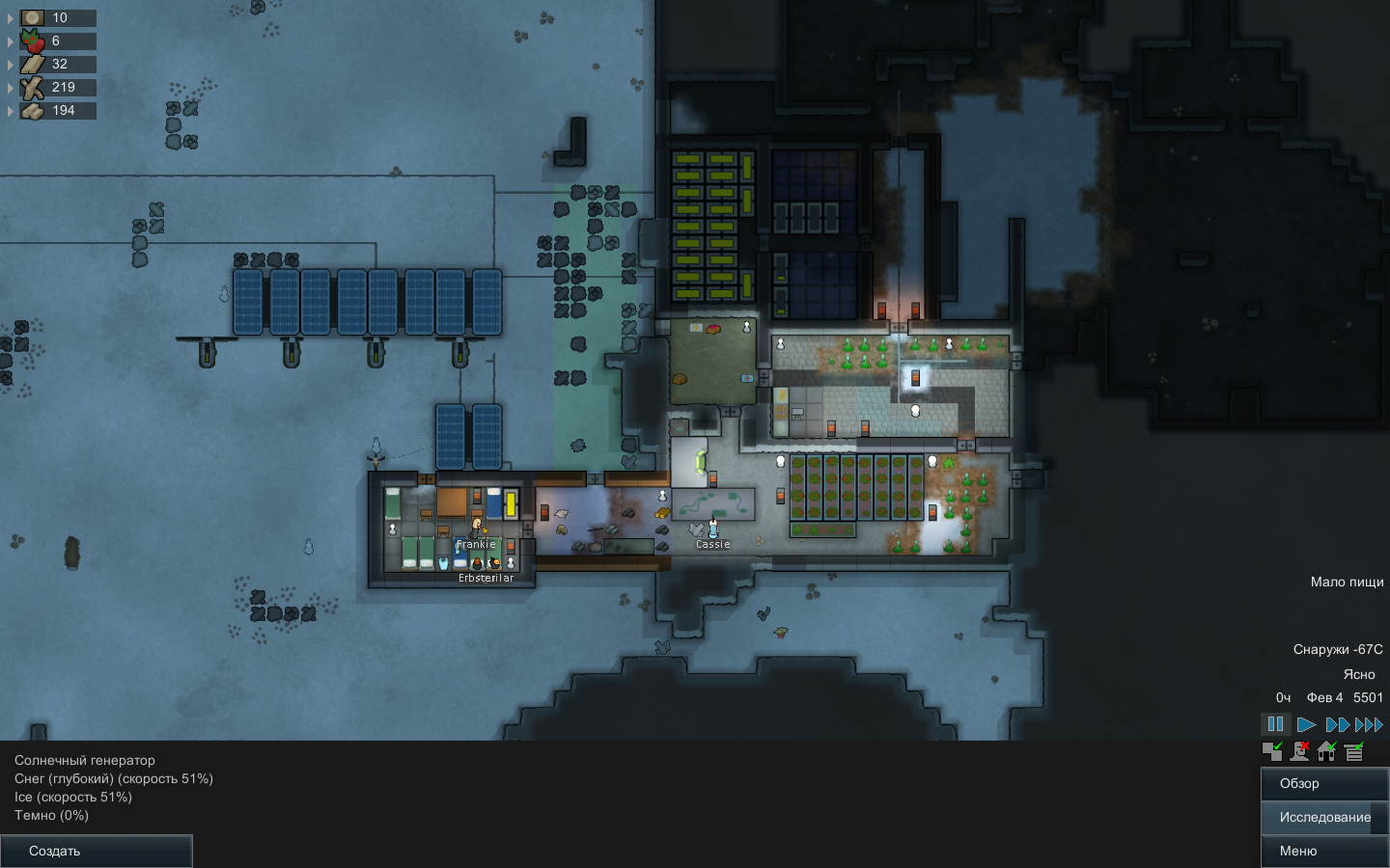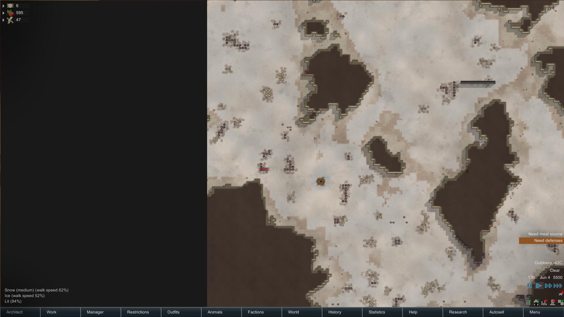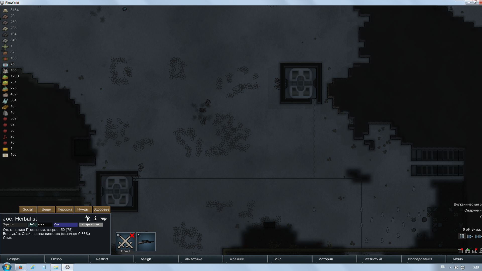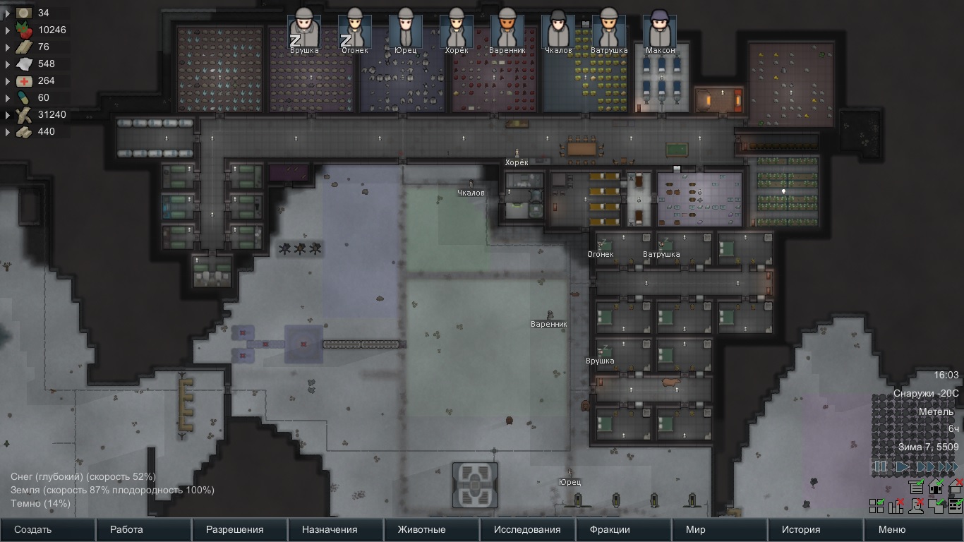 Как вам моя база в -90? Внутри от -70 до +10, все колонисты сидят в одной комнатке, отогреваются. Ещё и модов накачал уровня зомби апокалипсиса и усложнения крафта, так что вообще едва выживаю тут, даже с одним уберменшем и стартовыми ресурсами вроде двух сотен урана. Зато все противники в декабре-январе замерзают до прибытия на базу. Выходи-бери трупы на разделку и пленников-баррикадируйся обратно. И животных с деревьями нет совсем. Пятый месяц людей жрут.