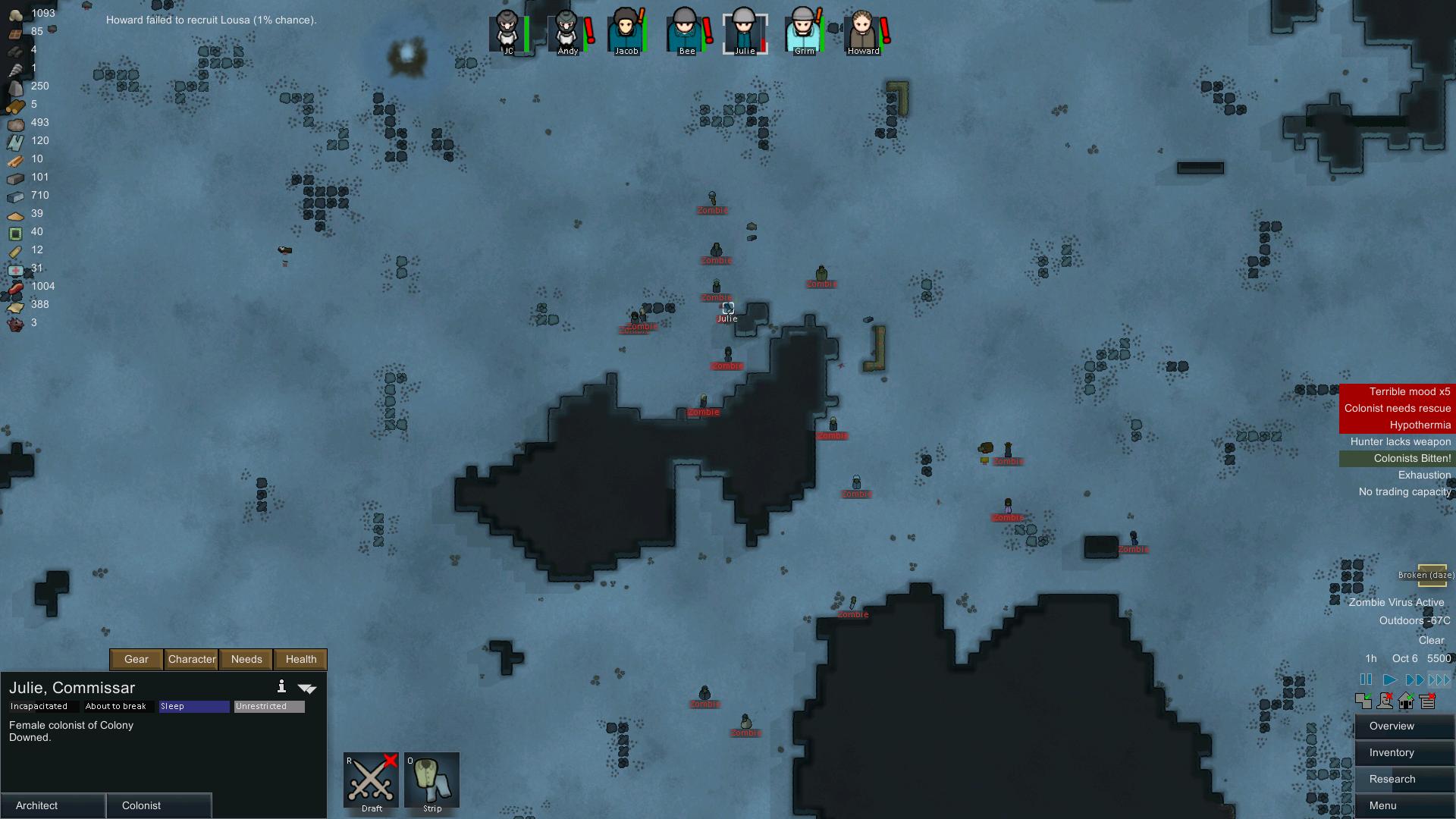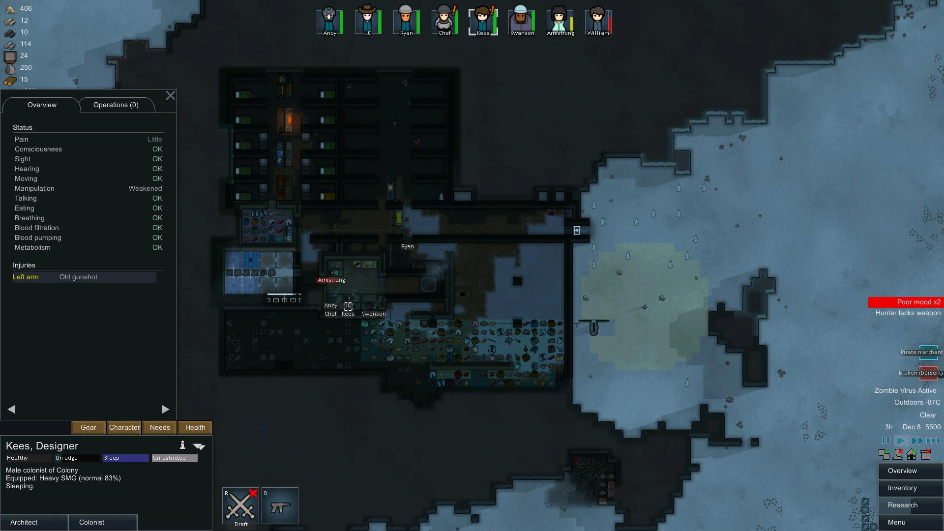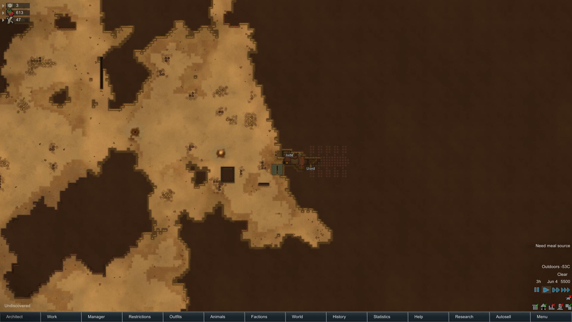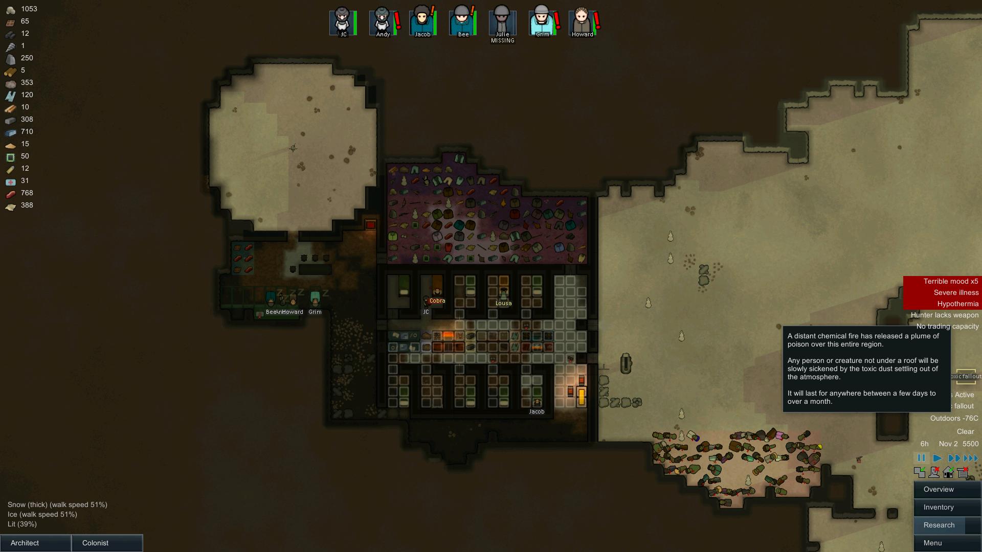 Как вам моя база в -90? Внутри от -70 до +10, все колонисты сидят в одной комнатке, отогреваются. Ещё и модов накачал уровня зомби апокалипсиса и усложнения крафта, так что вообще едва выживаю тут, даже с одним уберменшем и стартовыми ресурсами вроде двух сотен урана. Зато все противники в декабре-январе замерзают до прибытия на базу. Выходи-бери трупы на разделку и пленников-баррикадируйся обратно. И животных с деревьями нет совсем. Пятый месяц людей жрут.