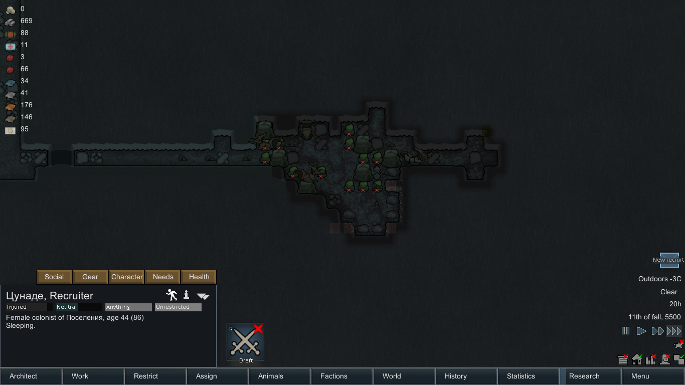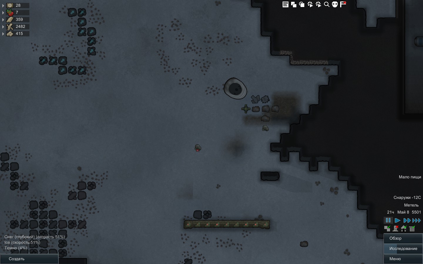 Тем временем мне стало немного скучно и я перезапустил с поднятием уровня сложности на максимальный. Один колонист под плохим настроением прогуляться вышел.