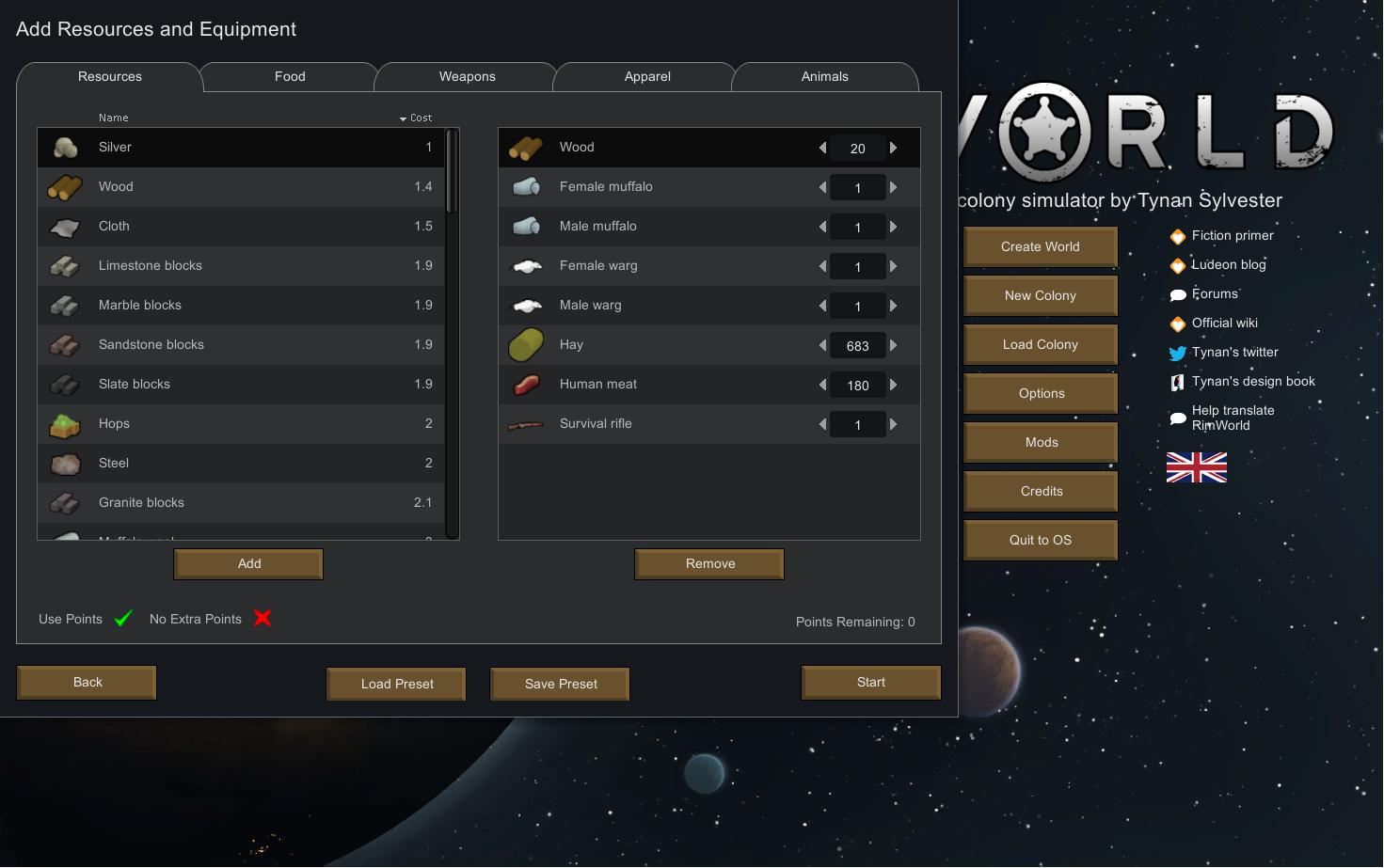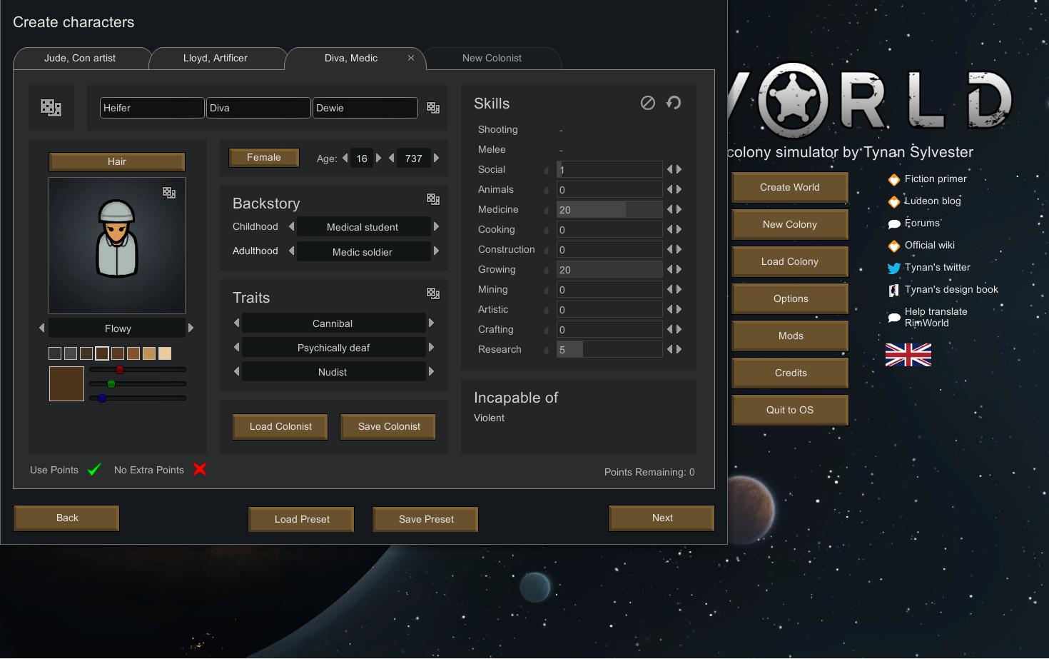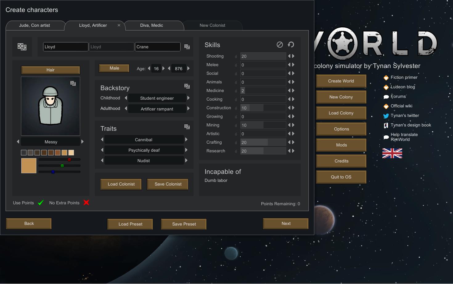 Ну хорошо, попробую расшевелить вашу берлогу. Вкратце — будет очень хардкорно. Randy Random на extreme уровне сложности, максимальный размер карты. Начинаю с июня для более лёгкого старта и запаса времени для отстройки, позже это будет сложнее. На скриншотах безумный выбор навыков и прочего с prepare carefully. Каннибализм ради выживания при недостатке еды, психическая глухота ради защиты части людей от случайных или намеренных воздействий и нудизм для дополнительного хардкора — придётся решать вопрос с базой и отоплением в кратчайшие сроки. Навыки, вещи, почти всё выбрано в рассчёте на долгий срок, когда все эти персонажи будут бегать с голой задницей по базе и не выходить оттуда.