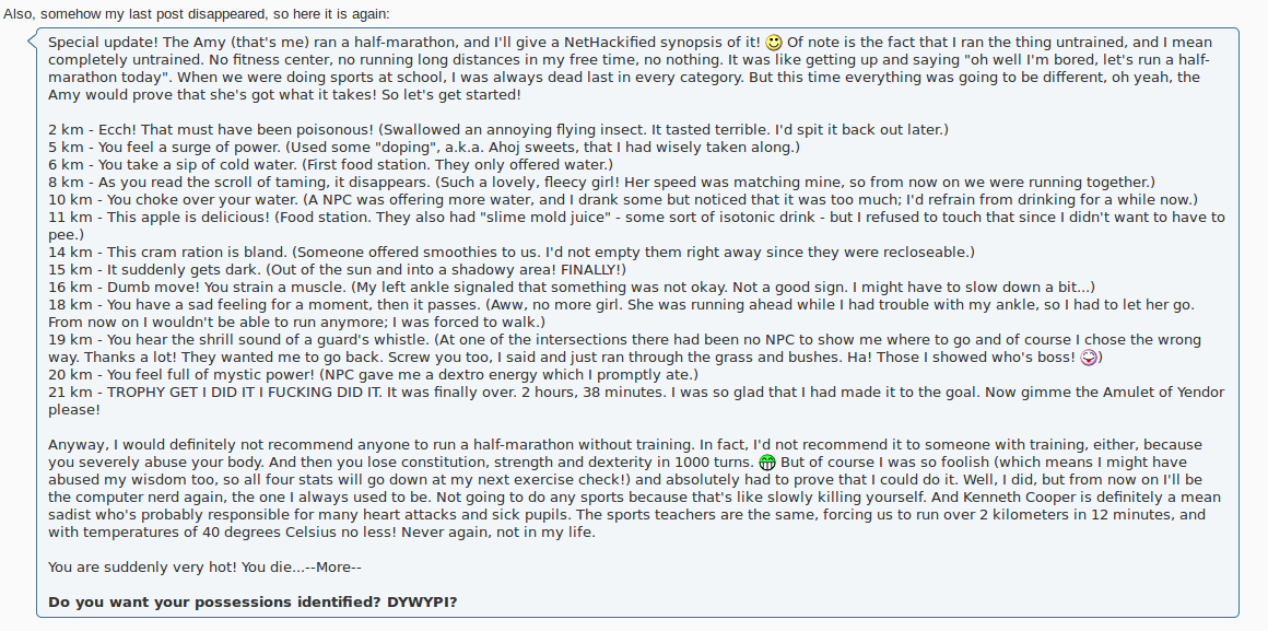Кажется, я помню этого анона в более здоровом состоянии, он играл в ангбанд, жил в многоэтажке, сопротивлялся нашествию безумных орд нетхака, а потом сам попробовал, и вот результат.