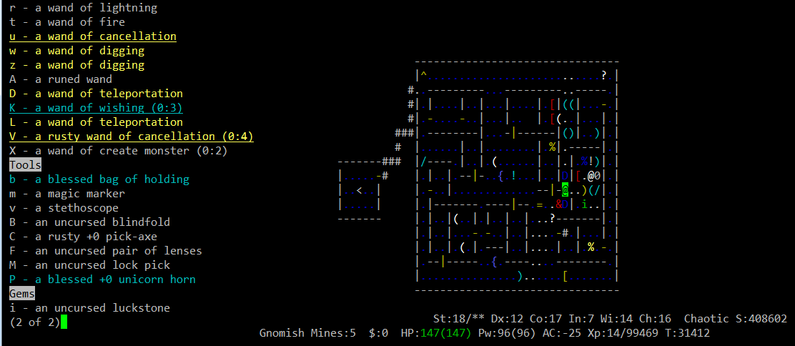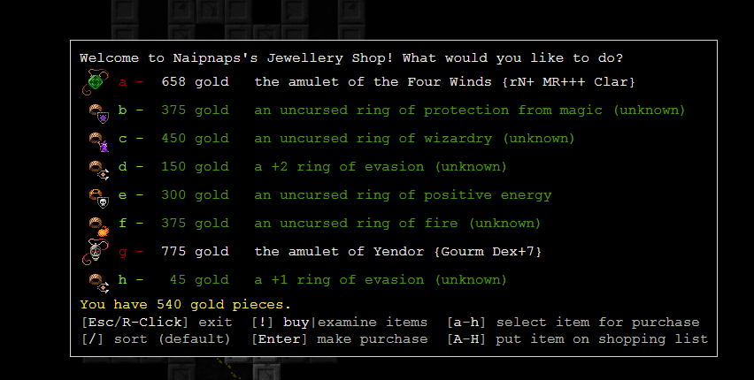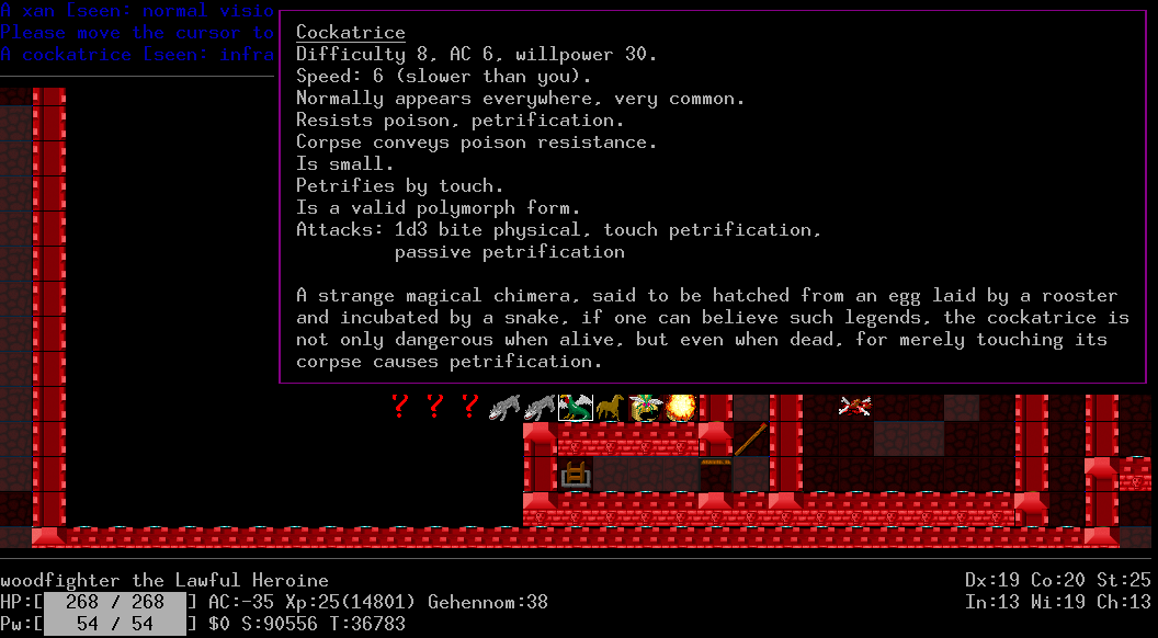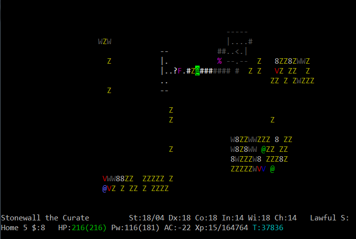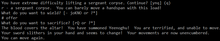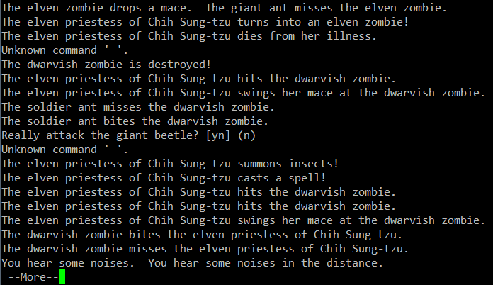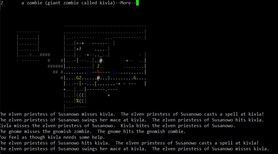 >>25913 Слава Сету великому богу пустыни, я ему помолился и он вызволили меня из толщ земли, а то бы так и сдох там заживо погребённый. Однако, теперь, голодаю, ем крыс, собак, ворон. Не могу не отметить, что последний релиз очень приятен, появилось описание заклинаний, способностей и защитных знаков, можно теперь не лазить в вики по каждому поводу, удобно! Новые расцветочки в моём ssh-плагине смотрятся на ура. Зомби теперь обозначаются символами изначальной расы и отмечаются специальной фоновой подсветкой. Дружественные NPC с которыми можно поболтать и выпить также подсвечиваются. Короче, всё круто.