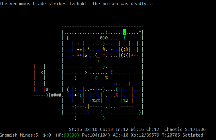 >>27155 Кстати, а ведь монстры в нетхаке едят, в отличие от других рогаликов, поэтому мне видится такой хитрый план: 1) изучаем диету монстра по вики, 2) подкидываем ему отравленный труп, 3) он съедает труп, 4) слава нам.