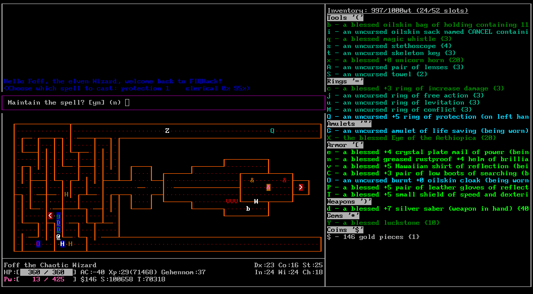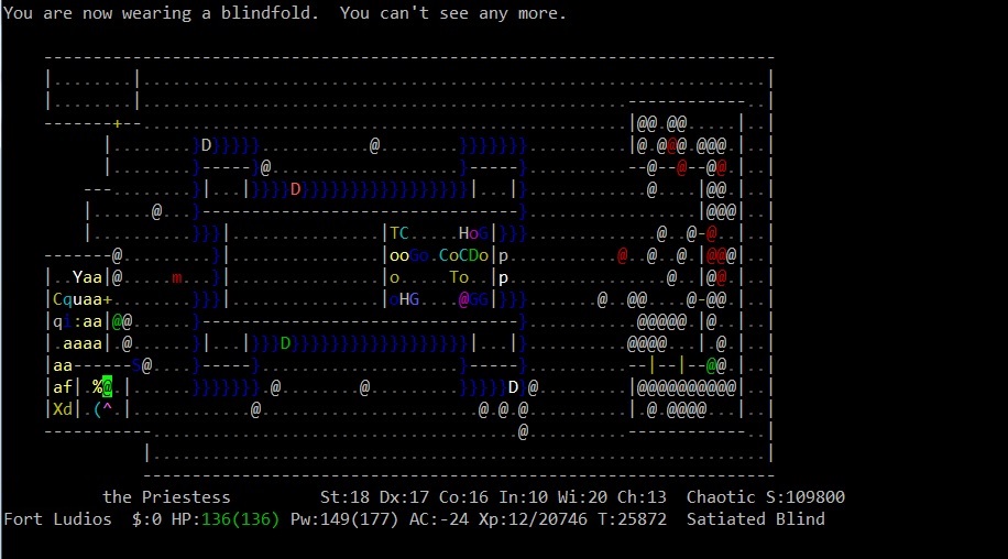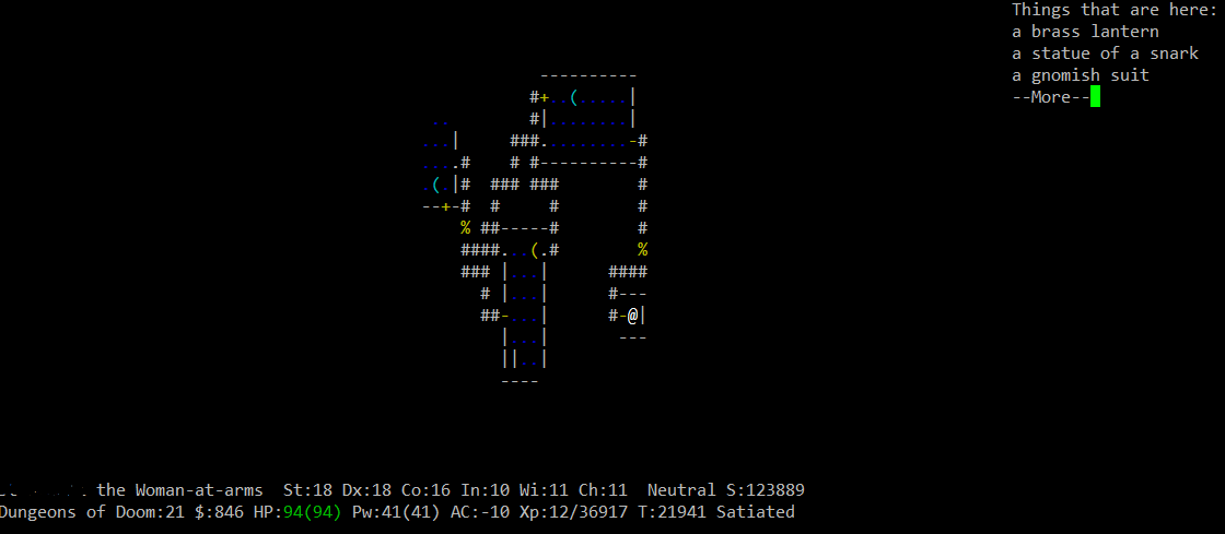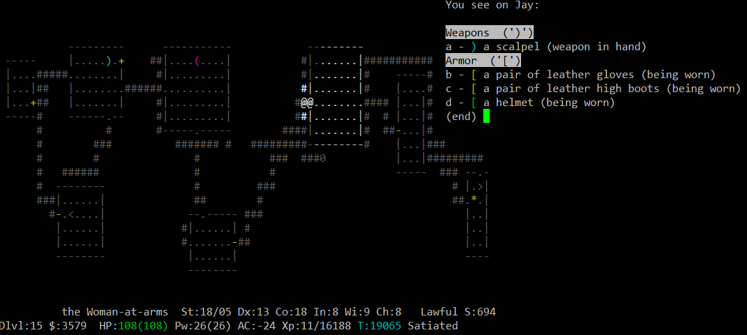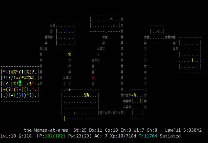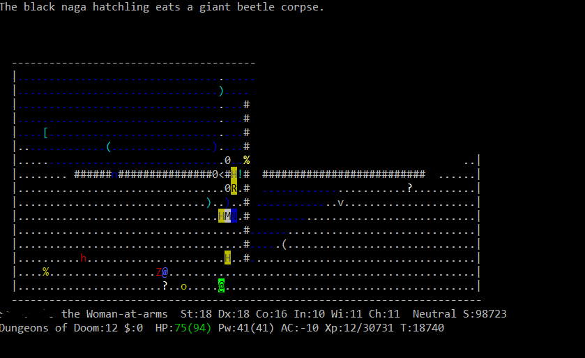 Вот это открытие. В этом варианте генерируются случайные образы игроков с рандомными именами. Уже убил визарда, хилера, самого Maud-а (не помню кем он был). На 21 этаже ждет рога с надетым амулетом спасения жизни, как бы так снять его с нее. Не знаю, правда, зачем с них сыпется так много лута, хотя встречи интересные.