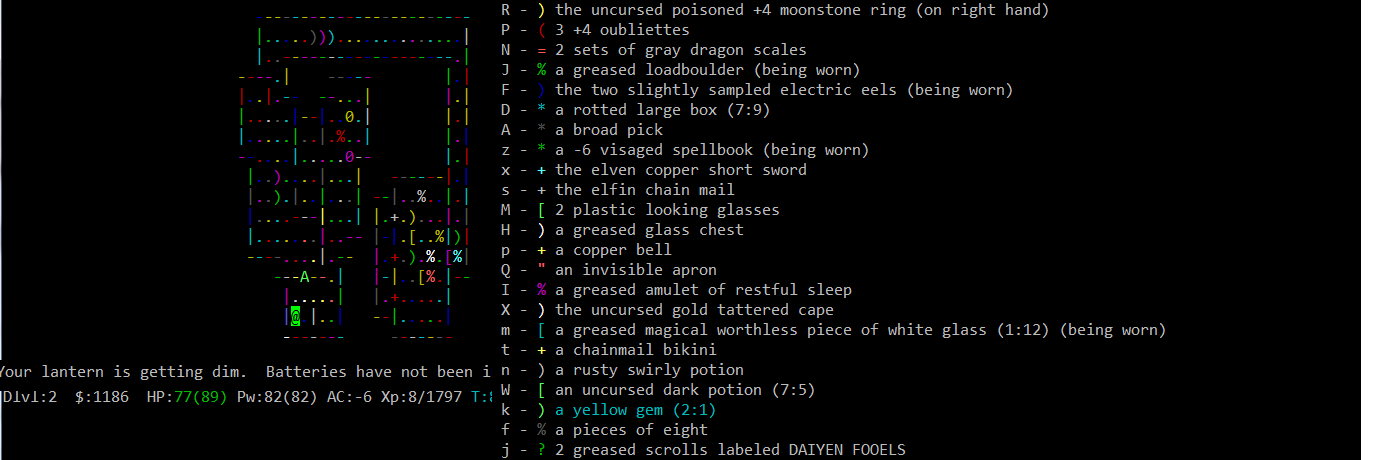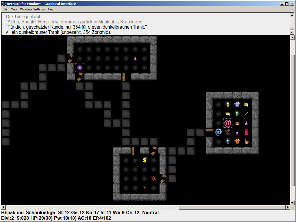 >>26552 С вкочением. Скорее всего ты юзаешь тайловую версию, поэтому размеры шрифтов правятся в конфиге defaults.nh, там есть 4 параметра: font_menu, font_text, font_status, font_message. Там же можно поменять тайлы, для unnethack самое годное untekhack, скочивается отсюда: http://www.mediafire.com/file/6fe7ibe2ukbfbrn/untekhack.bmp но трушнее играть в ascii, там еще и цветной бар здоровья будет, неслыханная щедрость... Инвентарь кажется нельзя обычными способами сделать постоянным.