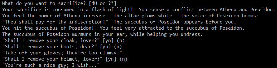 >>29989 Надо же когда-то остановиться. Нетхак полностью готовая игра, смысл что-то добавлять кардинального? Это только в кравле барин каждый месяц перетряхивает мету чтобы киберкотлеты не устали гриндить. Вся прелесть опенсорса в том, что если тебе что-то не нравится, берешь и скачиваешь все эти menucolors, msgtype и прочие патчи, пишешь свой код. То, что ты не осилил интерфейс нетхака, ни о чем не говорит. Можешь навернуть любой существующий форк васянов, которые думают о чем блядь угодно, кроме самой игры. Там тебя обмажут всеми этими автопоисками, хайлайтами, автоматическими действиями, только разве что жопу не подотрут и игру за тебя не пройдут.