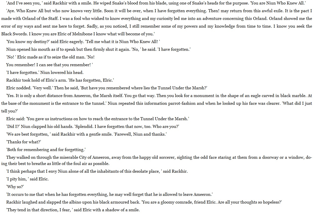 Небольшой оффтопчик (?) Прочитал первую книгу Муркока, в которой упоминается Stormbringer. Собственно, про сам рунный меч там пока практически хуй да нихуя, но сама книга просто отвал башки для неискушенного читателя типа меня. Больше всего понравилась сцена пикрилейтед.