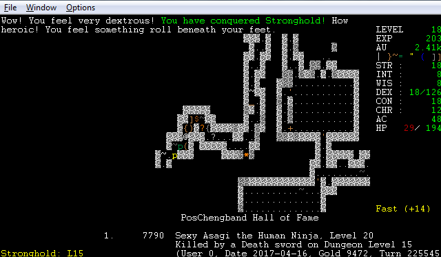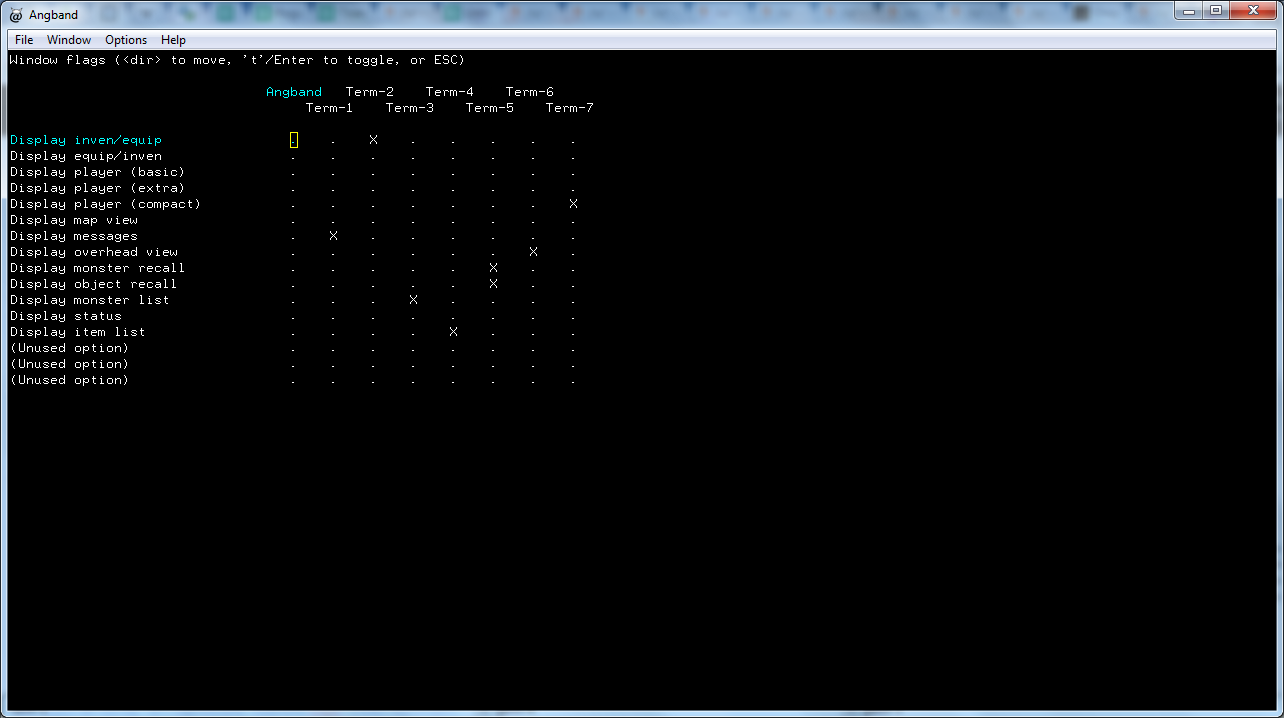 >>23277 Настройки окон - выбери видимость нужных окон в меню window, потом в игре зайди в опции "=", нажими "w" чтобы выбрать что и где отображается, настройки вроде сохраняться в сейве, а позиционирование окон и шрифты в poschengband.ini