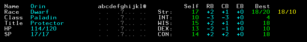 >>1811 >Играю в ваниллу, все нравится, только не разобрался как пользоваться теми таблицами в окне персонажа по [C-h]. Просто. + - это резист, v - иммунитет, буквы сверху обозначают предмет, который даёт резист