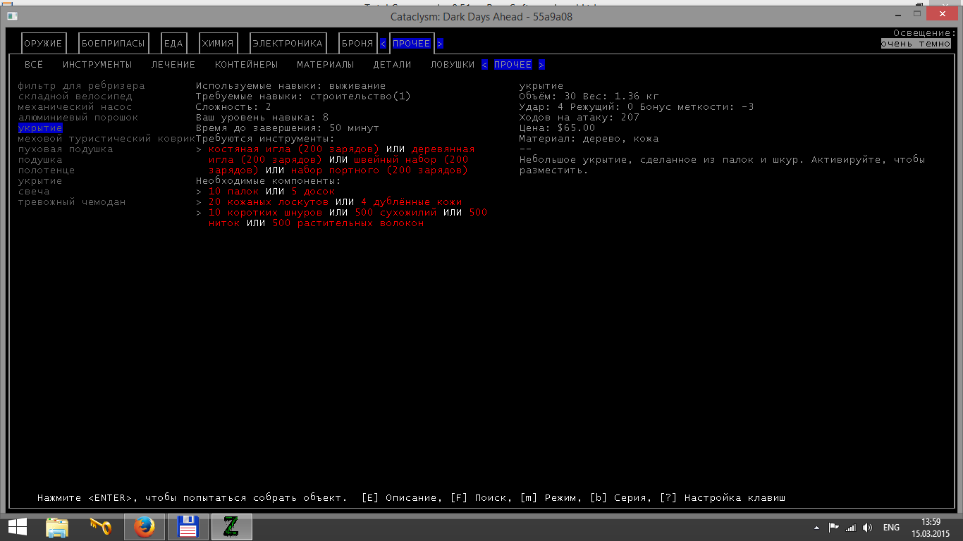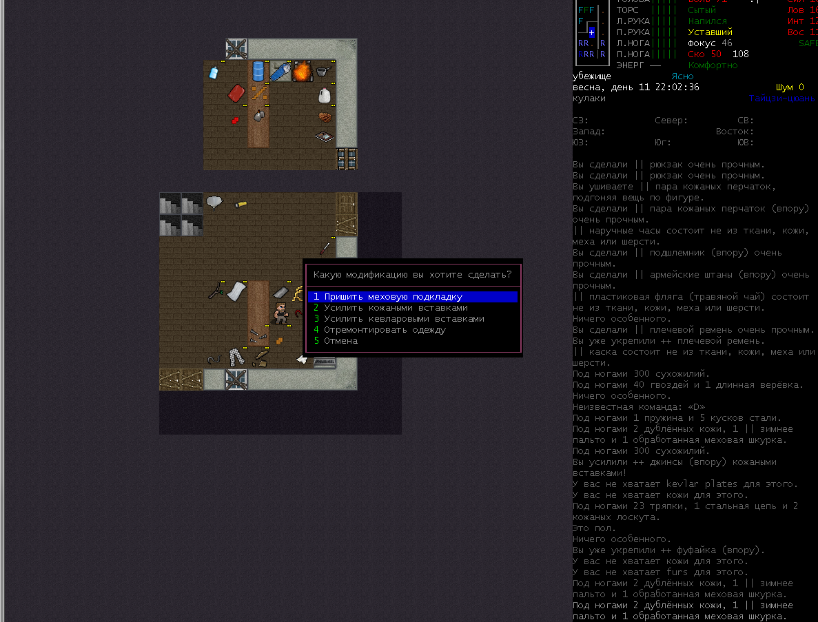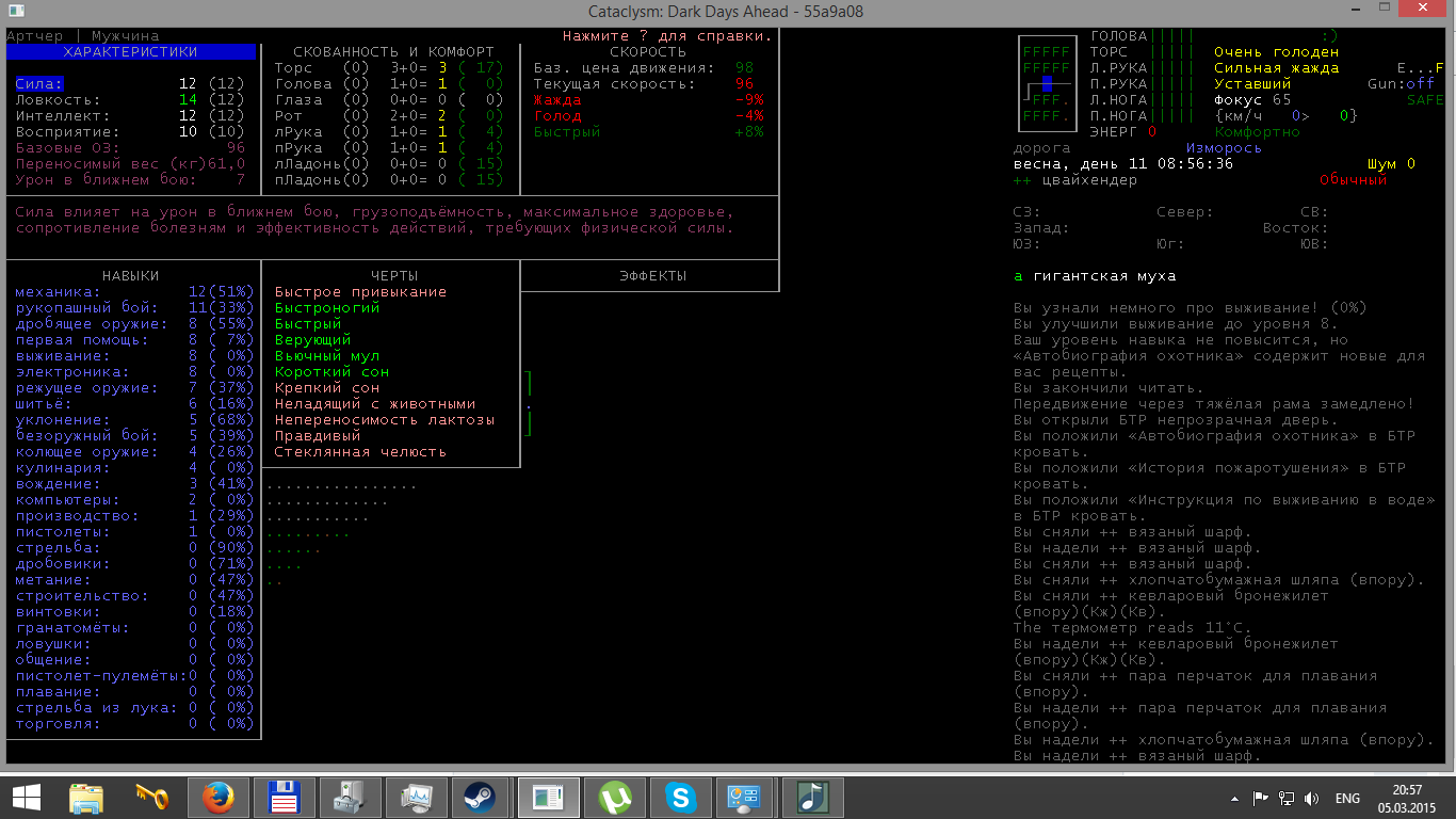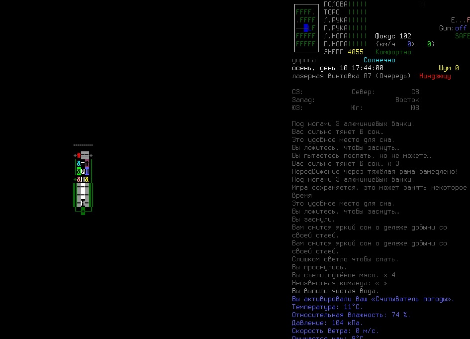 >>2796 Лосей уже убил штук пять по пути на север. Немного задержался в убежище, буквально на пол-дня чтобы подкачать базовый крафт, потом двинул дальше на север и как назло подхватил простуду — недостаточно утеплился. Пришлось пару дней перекантоваться на пашне. Без чтения книг играть просто волшебно, не нужно сидеть и тупить в проценты навыков.