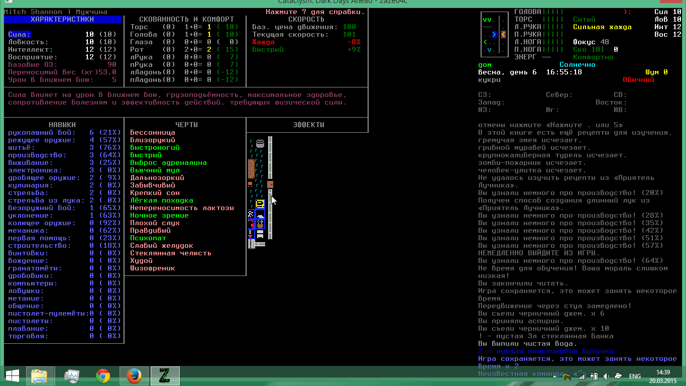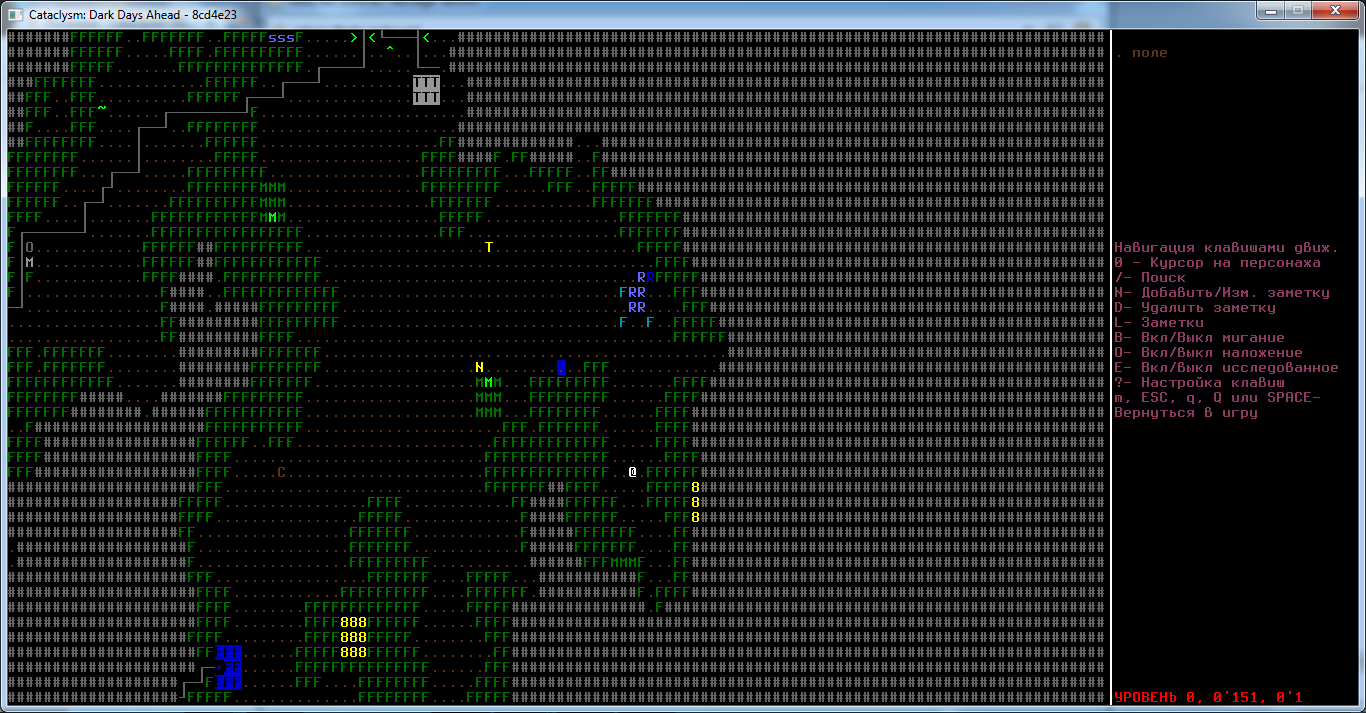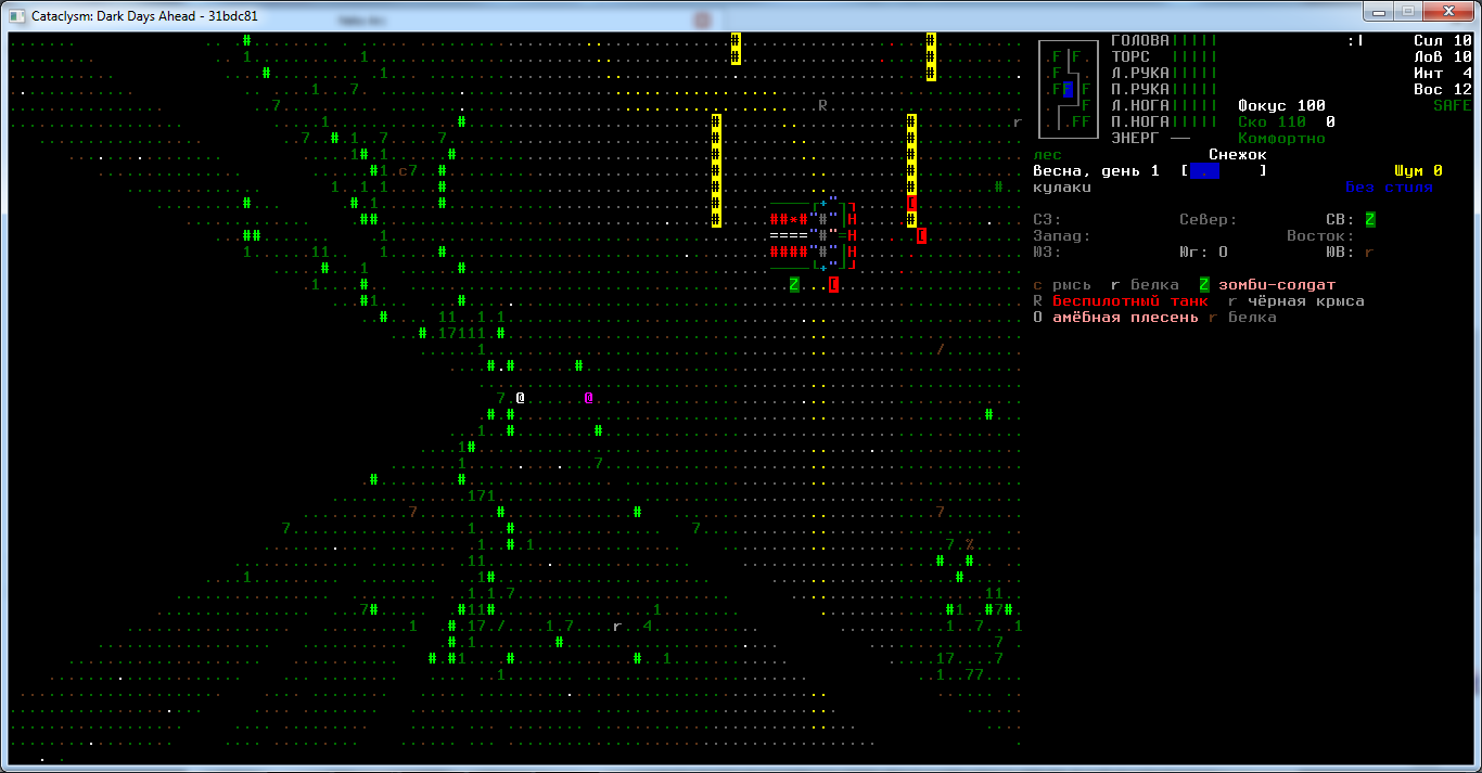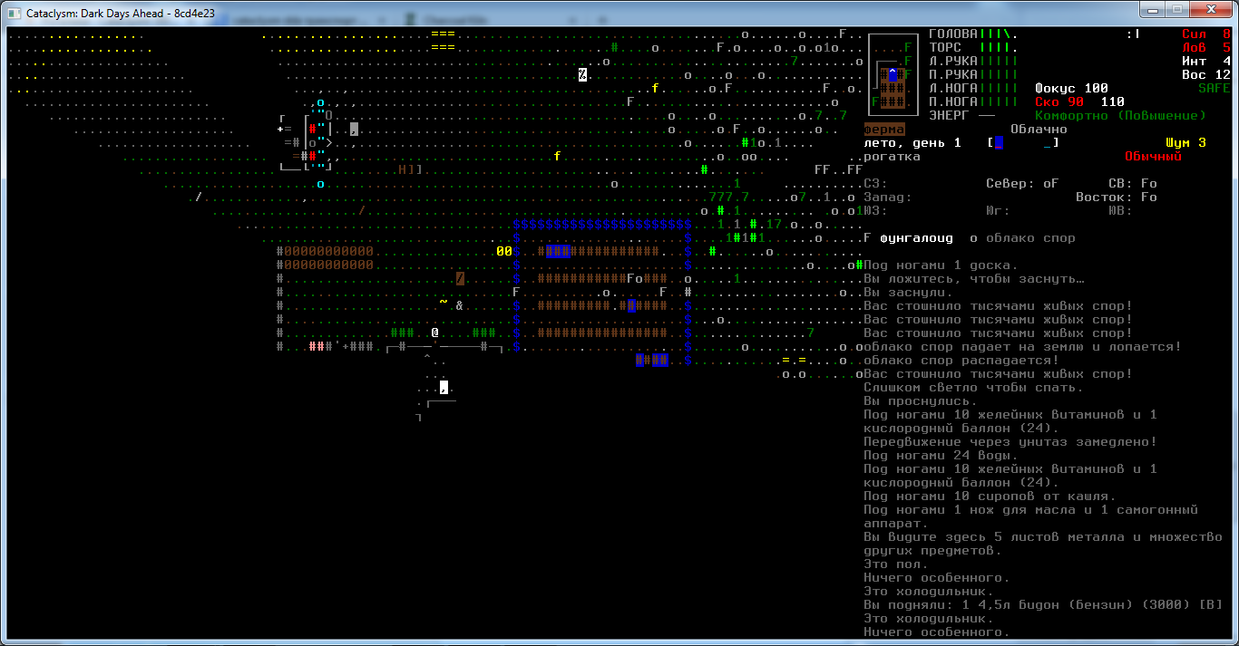 Не играл толком со времён 0.9, разве что иногда вкатывался посмотреть что и как, играл жопой, быстро умирал и удалял версию. Решил серьёзно повыживать в недавнем снапшоте. Cоздал околоминмаксерского персонажа, но с уклоном в шизу. Появился (Красный круг слева) недалеко от каого-то соцветия фунгалоидов (жёлтая Т). Подумал было что пиздос, но никаких грибов не видел и потом успокоился, ночью набижал на город, нашёл охуенный кукри, чуть было не соснул у шокера, но вовремя накритовал доской, слышал ми-го. Весь следующий день зализывал раны и подшивался, ночью спал. Хотел съебать в поместье но там грибы,хотел съебать на восток, но там тоже ебучие грибы, днём отбил домик у зомботы. Тупо было, чуть не сдох но я мёрз и был очень голоден и прокушен, поэтому рисковал. Опять зализывался и подшивался, ночью увёл револьвер из оружейки, попинал зомби, отбил том дом, что в правом кружке и, похоже начинаю охуенно жить. Оказывается чтобы поставить буржуйку из резервуара нужно строительство 5 (ЧТОБЛЯТЬ? ХУЛИ ТУТ ТАК МНОГО), а на каменную строительство 2 (ЧТОБЛЯТЬ? МЕНЬШЕ ЧЕМ НА БУРЖУЙКУ? СЕРЁЗНО!?) и ещё инструмент с копанием 2 (куда делся рецепт каменной лопаты?) Короче пришлось поставить в соседнюю комнату мангал и готовить в респираторе (он разве раньше защищал от дыма), потому что на улице дождь идёт большую часть времени. В туалете нашёл набор портного, прикольно, только кожи ест дохуя, с кевларом столько же будет брать? И есть ли лимит на количество укреплений? Пока сычую с книгами и баком воды, но кажется скоро придётся идти в бакалею, ИРП есть пока жалко, да и зима хоть и неблизко, но впереди.