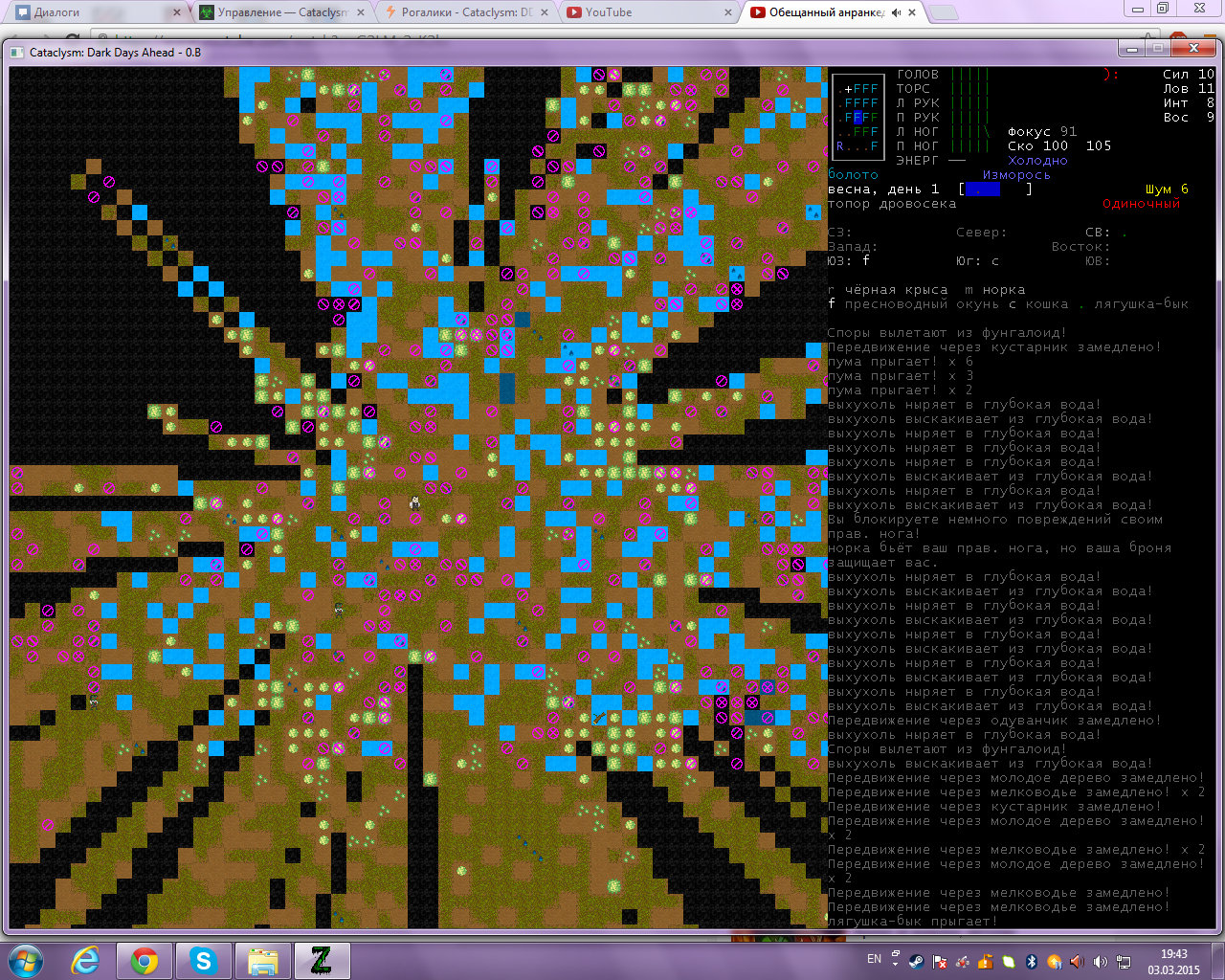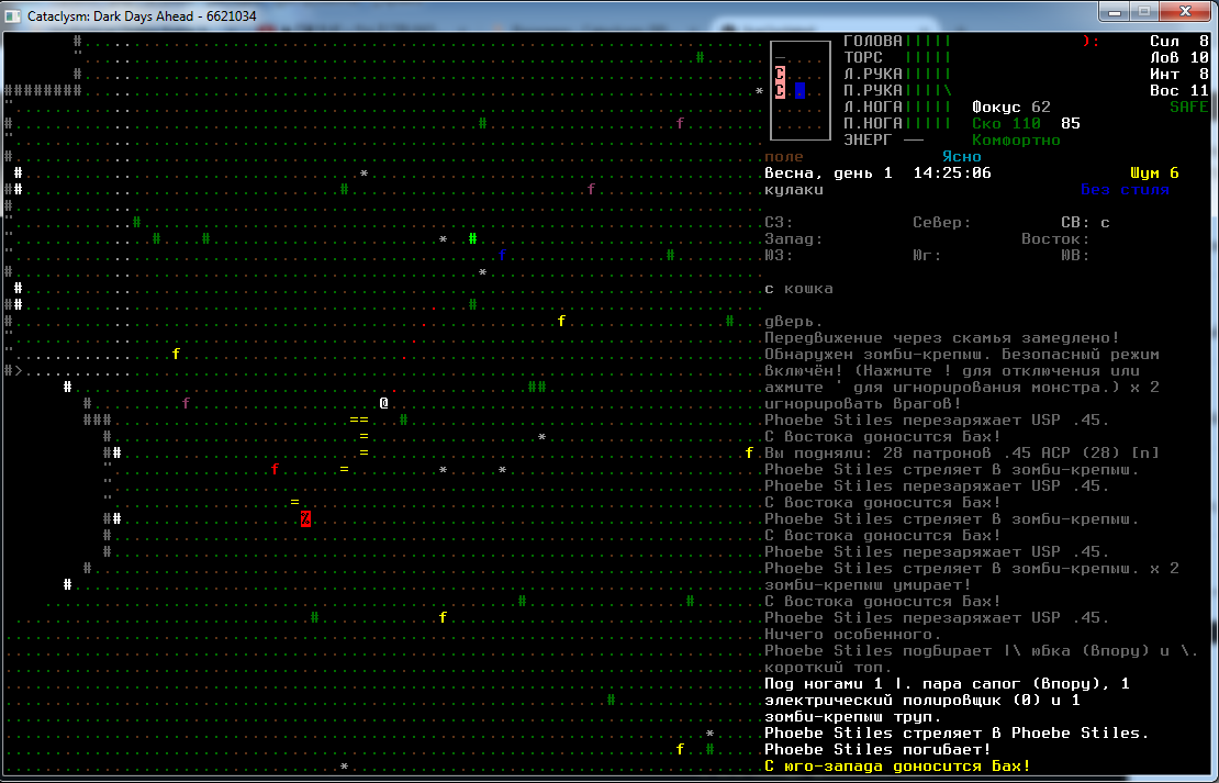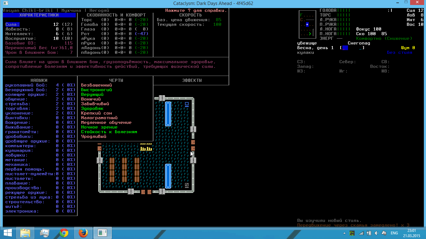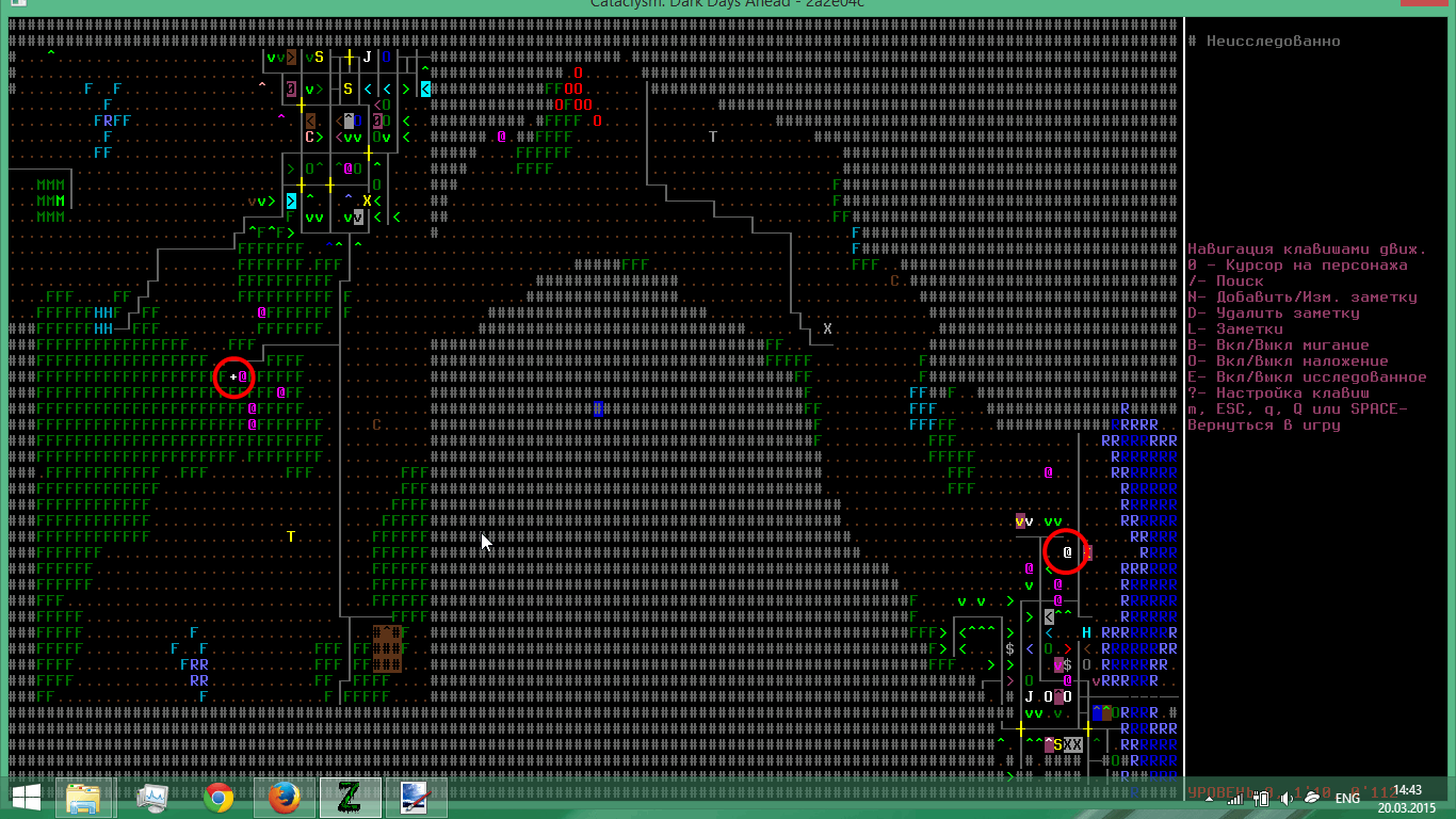 Не играл толком со времён 0.9, разве что иногда вкатывался посмотреть что и как, играл жопой, быстро умирал и удалял версию. Решил серьёзно повыживать в недавнем снапшоте. Cоздал околоминмаксерского персонажа, но с уклоном в шизу. Появился (Красный круг слева) недалеко от каого-то соцветия фунгалоидов (жёлтая Т). Подумал было что пиздос, но никаких грибов не видел и потом успокоился, ночью набижал на город, нашёл охуенный кукри, чуть было не соснул у шокера, но вовремя накритовал доской, слышал ми-го. Весь следующий день зализывал раны и подшивался, ночью спал. Хотел съебать в поместье но там грибы,хотел съебать на восток, но там тоже ебучие грибы, днём отбил домик у зомботы. Тупо было, чуть не сдох но я мёрз и был очень голоден и прокушен, поэтому рисковал. Опять зализывался и подшивался, ночью увёл револьвер из оружейки, попинал зомби, отбил том дом, что в правом кружке и, похоже начинаю охуенно жить. Оказывается чтобы поставить буржуйку из резервуара нужно строительство 5 (ЧТОБЛЯТЬ? ХУЛИ ТУТ ТАК МНОГО), а на каменную строительство 2 (ЧТОБЛЯТЬ? МЕНЬШЕ ЧЕМ НА БУРЖУЙКУ? СЕРЁЗНО!?) и ещё инструмент с копанием 2 (куда делся рецепт каменной лопаты?) Короче пришлось поставить в соседнюю комнату мангал и готовить в респираторе (он разве раньше защищал от дыма), потому что на улице дождь идёт большую часть времени. В туалете нашёл набор портного, прикольно, только кожи ест дохуя, с кевларом столько же будет брать? И есть ли лимит на количество укреплений? Пока сычую с книгами и баком воды, но кажется скоро придётся идти в бакалею, ИРП есть пока жалко, да и зима хоть и неблизко, но впереди.