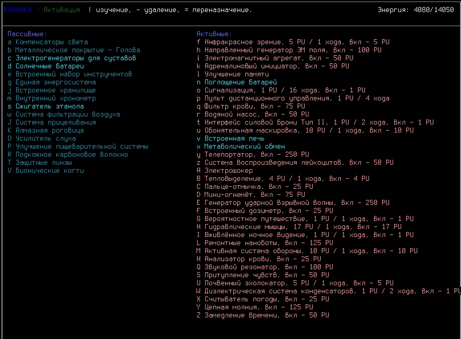 Кстати, аноны, я тут подумал над идеей для мода. Это слоты для бионики. По-моему тупо, когда ты можешь три пальца заменить на отмычки, добавить вылезающие когти, набор инструментов и огромный клинок в руку и это просто никак не скажется. Я имею ввиду, ты можешь в своё маленькой тело целый грузовик с техникой засунуть и не испытывать никаких проблем. Поэтому разумно сделать, чтобы приходилось выбирать между сжигателем этанола, встроенной печью и встроенным хранилищем. Чтобы ты не мог одновременно установить и воздушный насос, и конденсатор испарений. Сделал бы, но программирование только-только начал учить.