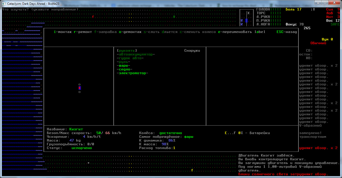 Докачал механику до 4 открыванием и закрыванием дверей, но так и не нашел как поставить генератор в свой скутер. Плюнул на все, вытащил мотор с аккумулятором, вставил велосипедную трансмиссию и - О ЧУДО - мой скакун наконец-то поехал. Ну, теперь в этой части мира меня ничего не держит, буду кочевать на восток.