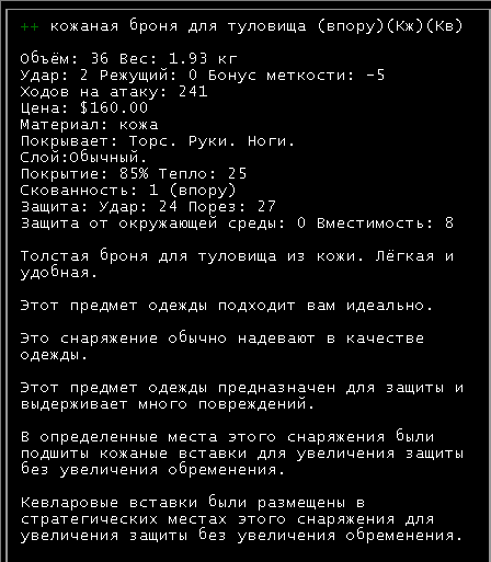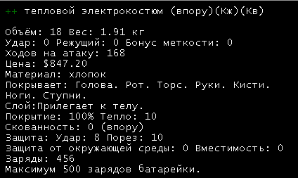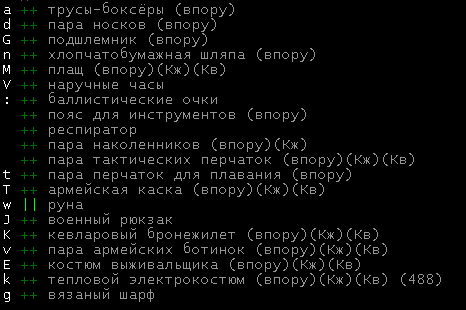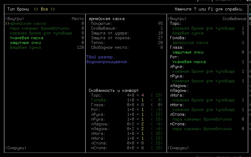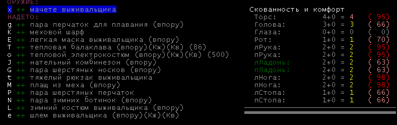 5. Цифры означают насколько твоему персонажу тепло или холодно. Скованность показывает насколько тяжело твоему персонажу выполнять действия из-за напяленной на него одежды. Читай о слоях в описаниях шмотья. Ты можешь надеть футболку, свитер и плащ и мешать тебе это не будет, но если ты наденешь два свитера, то появится скованность. Скованность головы не позволяет напяливать капюшон, скованность глаз уменшает восприятие, рта -- скорость бега, торса -- навык уворота и боевые навыки, рук -- крафт, ног -- скорость бега.