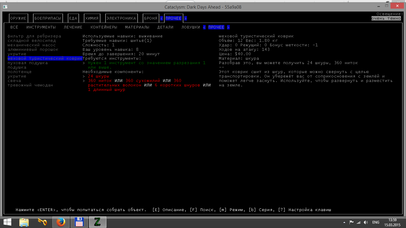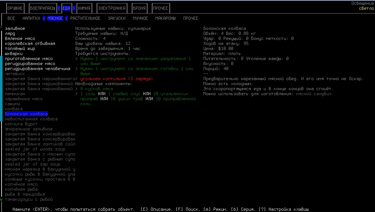 >>3363 Из одежды - 90% просто не нужно. И придется либо ремонтировать старые шмотки, либо стандартное: бандана - легкие перчатки - балаклава - шорты с карманами - платье - кожаные штаны - еще там что-то - кожаный тренч. С едой, особенности если дефицит ингридиентов, то же самое, ни кошачий ни собачий корм ну ни разу не пригодились. А если крафтить что-нибудь нужное - то большая часть просто успеет испортится пока ты будешь навык поднимать, чтобы научится делать пеммиканы какие-нибудь. Не говоря уж про производство, которое дешевле прокачать изготавливая инструменты для вязания и стрелы. И высокий навык нужен тут только для того, чтобы найти книжку с рецептом и скрафтить рапиру.