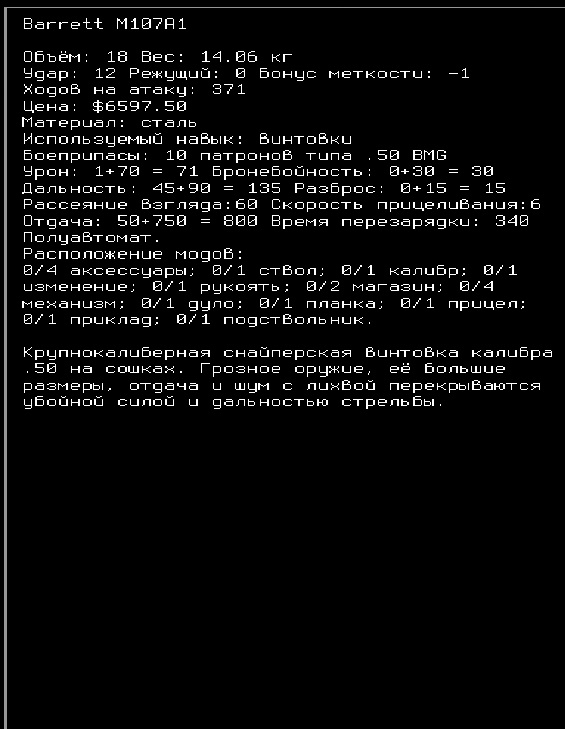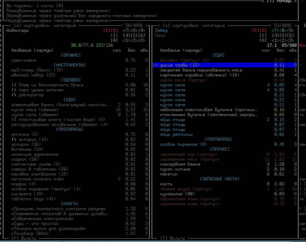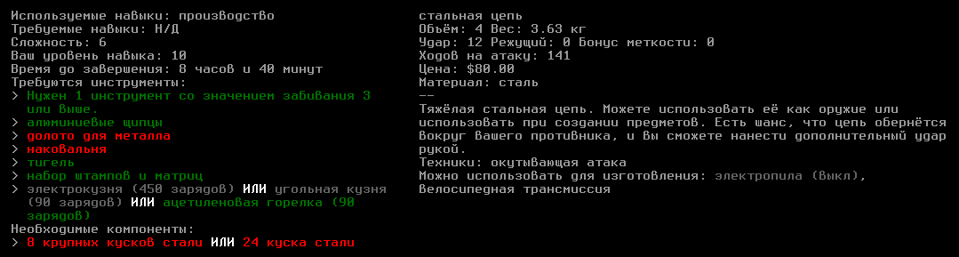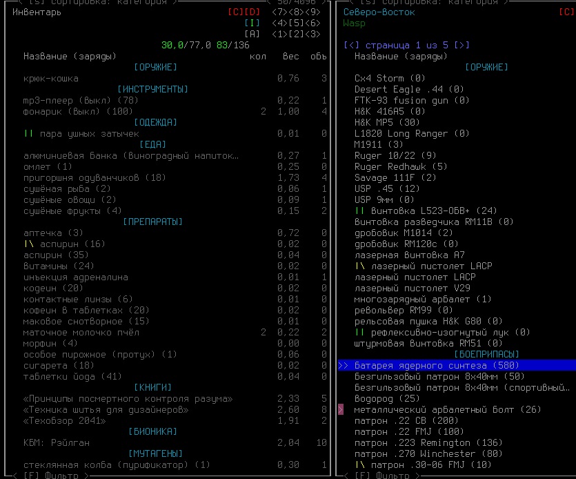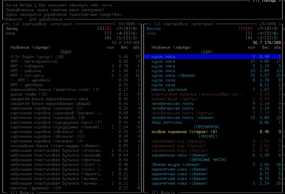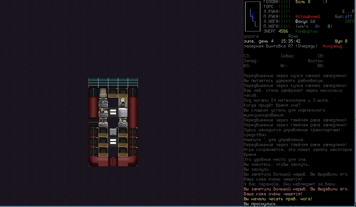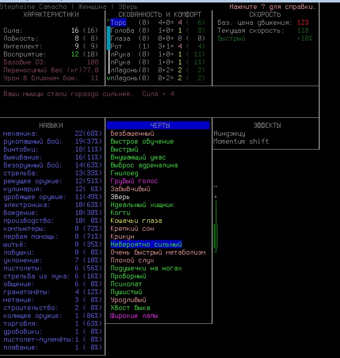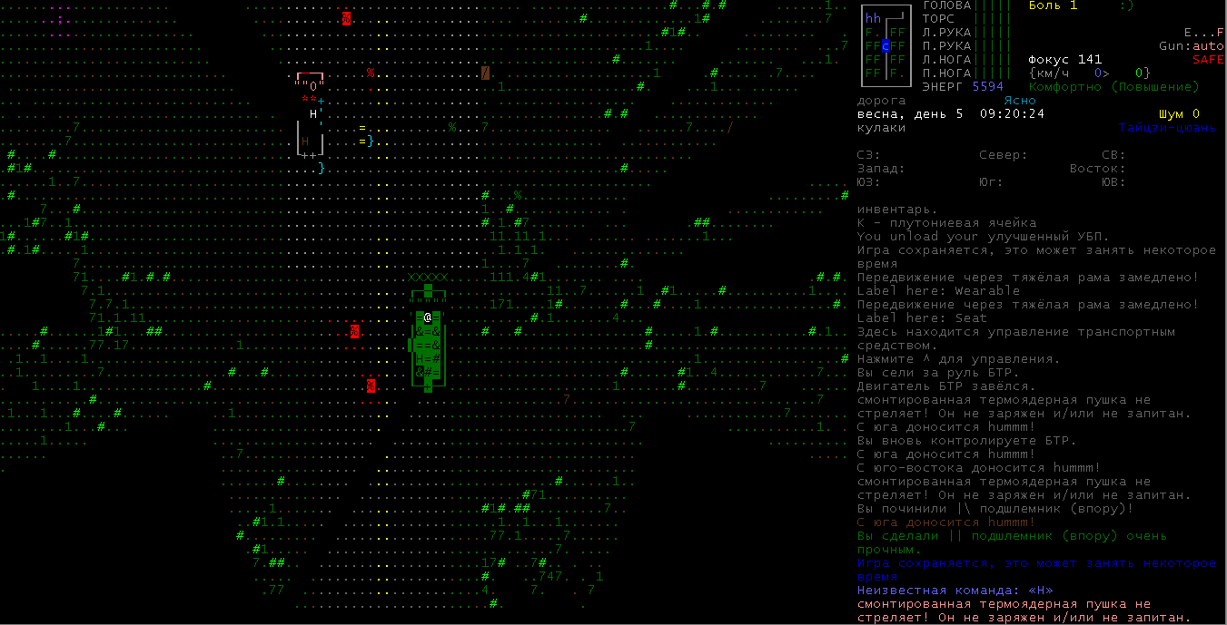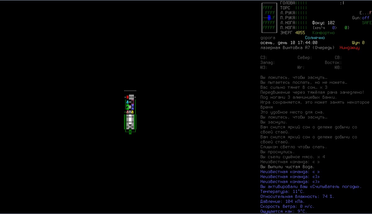 >>2949 1) Можно найти, внезапно, наручные часы. Ну и бионика есть аналогичная. 2) Да, но топовая бионика требует высоких скилов. В прочем, процесс это вероятностный - удача или сейвскам тоже прокатят. 3) Собирать все найденные подштанники, распускать\рвать на тряпки, и качать тайлоринг пока не будешь в состоянии более-менее прилично одеться. 4) В статах персонажа есть список статусов. По "@". Что-то серьезное вроде инфекций и обморожений пойдет туда. 5) Там-же, в статах, при выборе части тела увидишь как на нее влияет скованность. Еще там есть температура каждой части тела, если число краснеет - жарко, если синеет - холодно. И то и другое по разному плохо.