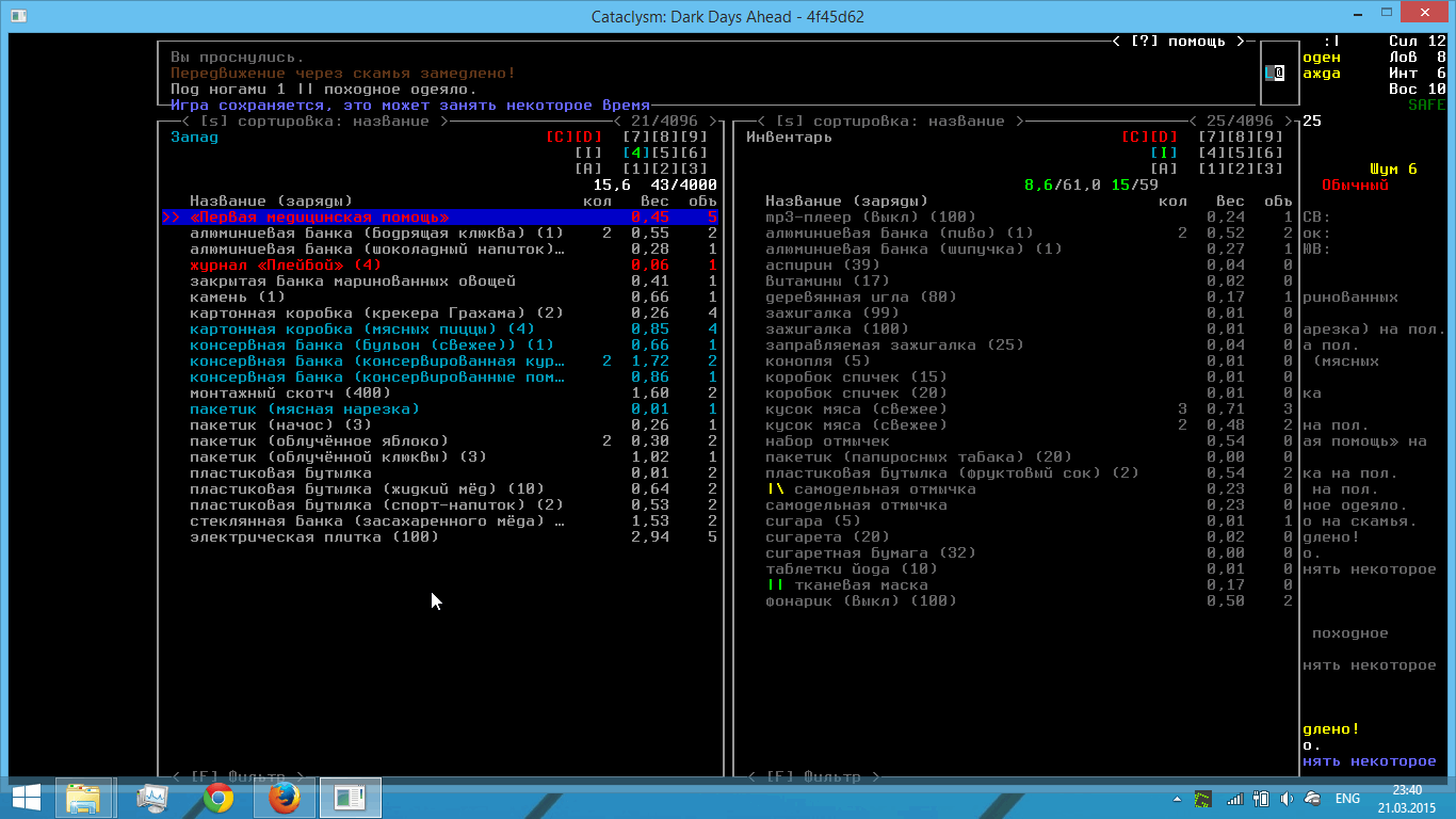 Из пары найденных в кустах бутылок была успешно сделана воронка, которая уже наполняет водой тоже найденную в кустах трехлитровую банку. Медленно, но верно прокачиваются навыки и собираются ресурсы для самодельной палатки и прочего буржуйства. Еще бы масляную лампу найти, потому как масло для нее можно будет самому делать, обеспечив себя источником света для крафта по ночам/в подвалах.