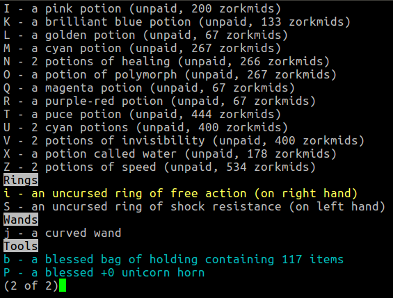 Certain classes of objects (wands, potions, and rings) have randomized appearances. For example, a "spiky wand" might always be a wand of death in one playthrough, and always a wand of cancellation in the next. However, there are certain ways that the appearance itself is meaningful, regardless of what the item actually turns out to be: