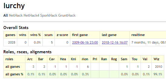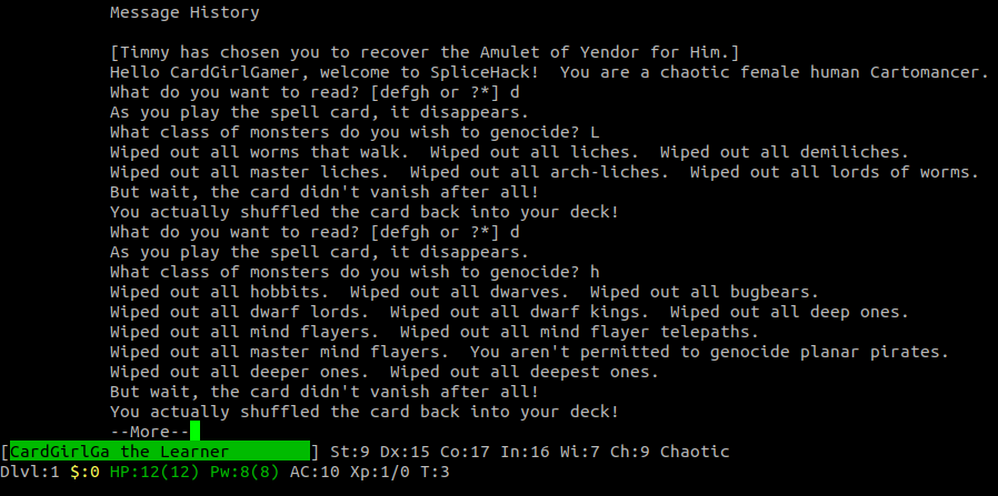 Ещё в notdnethack есть интересная роль - мистик, в dnethack мистика вроде не было. Мистик это как монах, только мистик, у него есть несколько стилей борьбы, которые работают на магии, например есть толкающий удар, есть блокирующий удар, есть удар телепортации, есть самолечение энергией Цы, и их можно переключать в зависимости от ситуации. Все они расходуют магию, но моща реально серьезная получается. Довольно интересно играется. А вот инкантифайера в notdnethack подправили и теперь он не такой йоба как раньше, и это хорошо, потому что он сосал магию и был просто мега-йобой, теперь он расходует магию постоянно для поддержания жизни, и это более логично для его расы (это раса, не роль), то есть все его существо держится на постоянном притоке ли запасе магии, точно так же как у автоматона на заряде пружины. Не сказать что большая проблема и дискомфорт, но в тонусе поддерживает, не будет время для гриндинга, нужно более оперативно ходить... Еще этот инкантифайер (по русски будет заклинатель вроде бы) умеет питать из магических ловушек, и его может порвать вклочья, если он перезарядится слишком сильно.