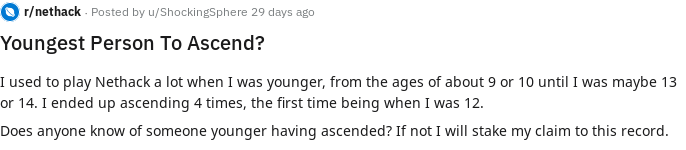 >>34791 Да пиздит он скорее всего. Нетхак слишком скучный для школьников. Маловероятно чтобы школьник играл в старые рогалики, когда есть более живые игры.