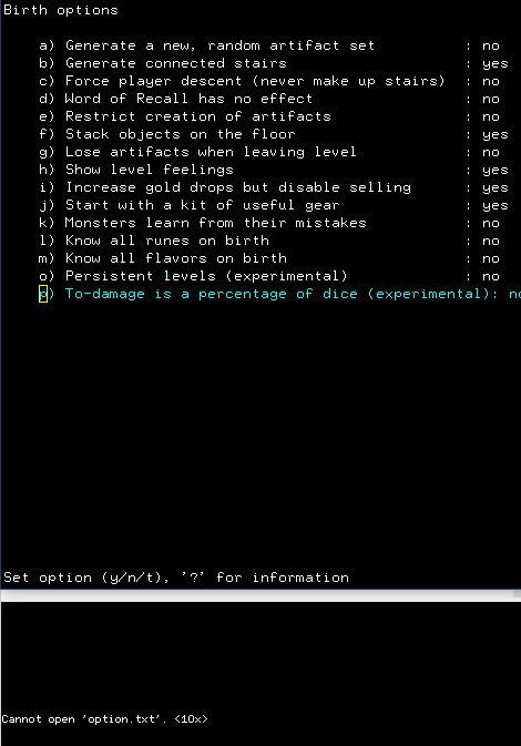 >>34949 >Теперь ингейм-справка не выводится? Ну, я пытался нажать "?", чтобы прочитать что такое "to-damage is a percentage of dice"(вообще не понял что это и как это работает). Но оно выдало ошибку открытия файла - но это только в birth options такое.