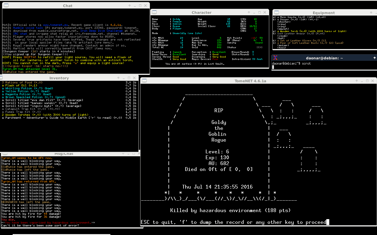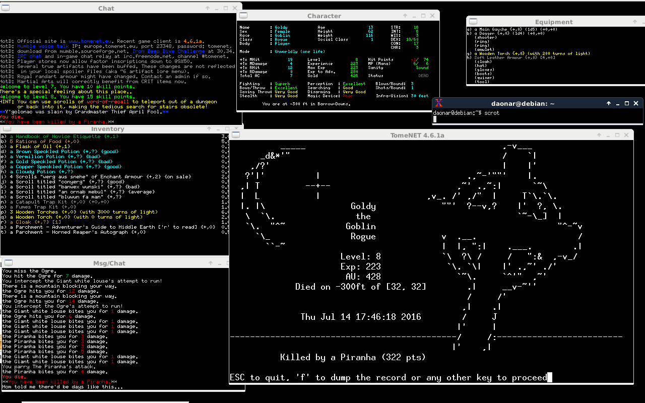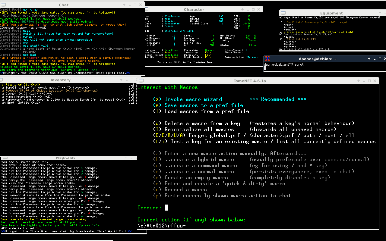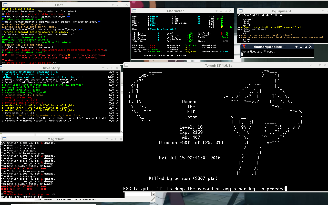 >>366 (OP) Народ, крайне тяжко вкатываться в сей моднейший "рогалик" но есть какая нибудь конфа в джаббере или ирке? Или хотя бы какая нибудь пачка русскоязычных гайдов? http://tangar.info/tomenet/ Играю с ником Azazel, по толкиену дико не теку но LOR почитал вместе с Сильмарилионом и Хоббитом, за плечами Nethack, Angband