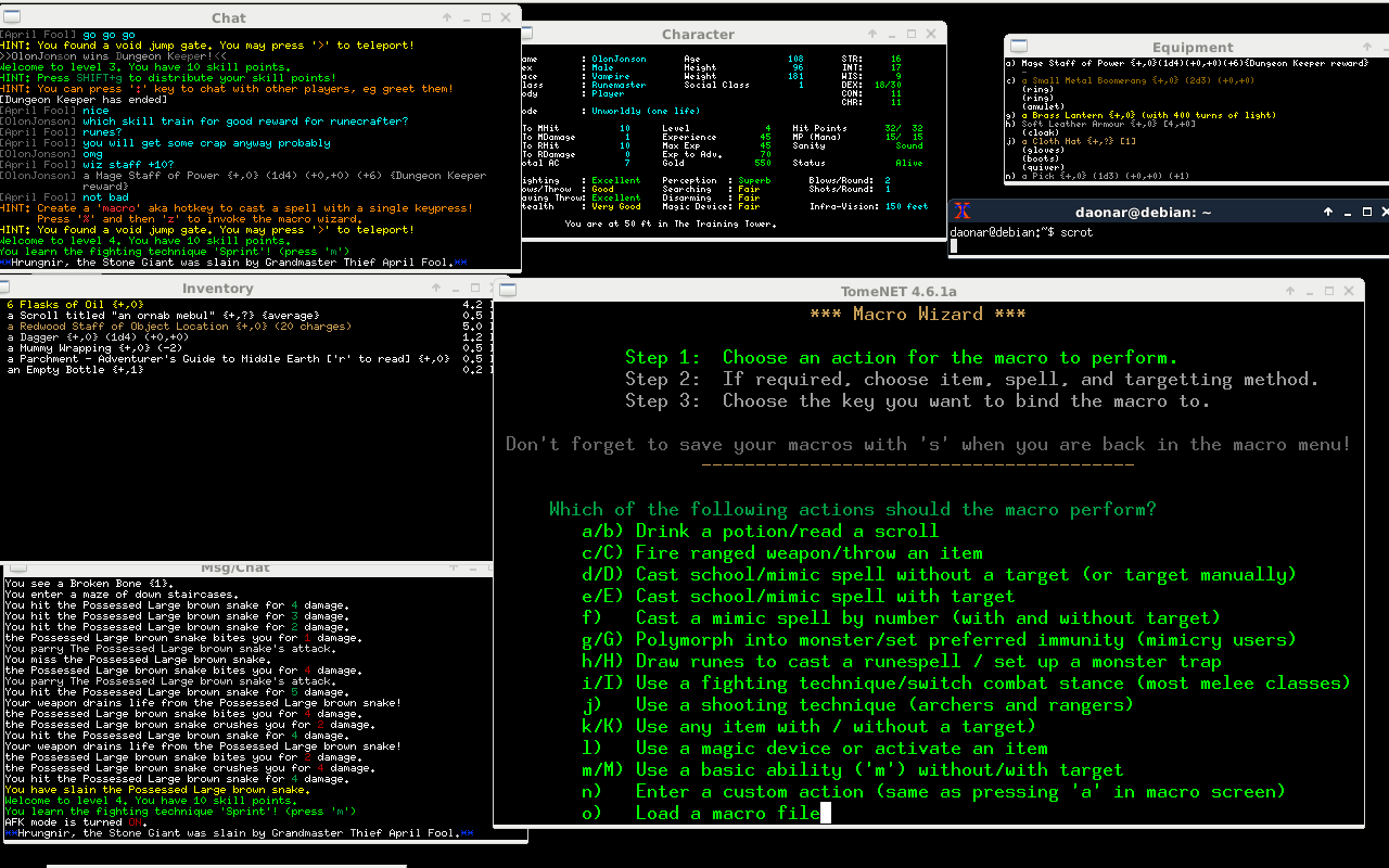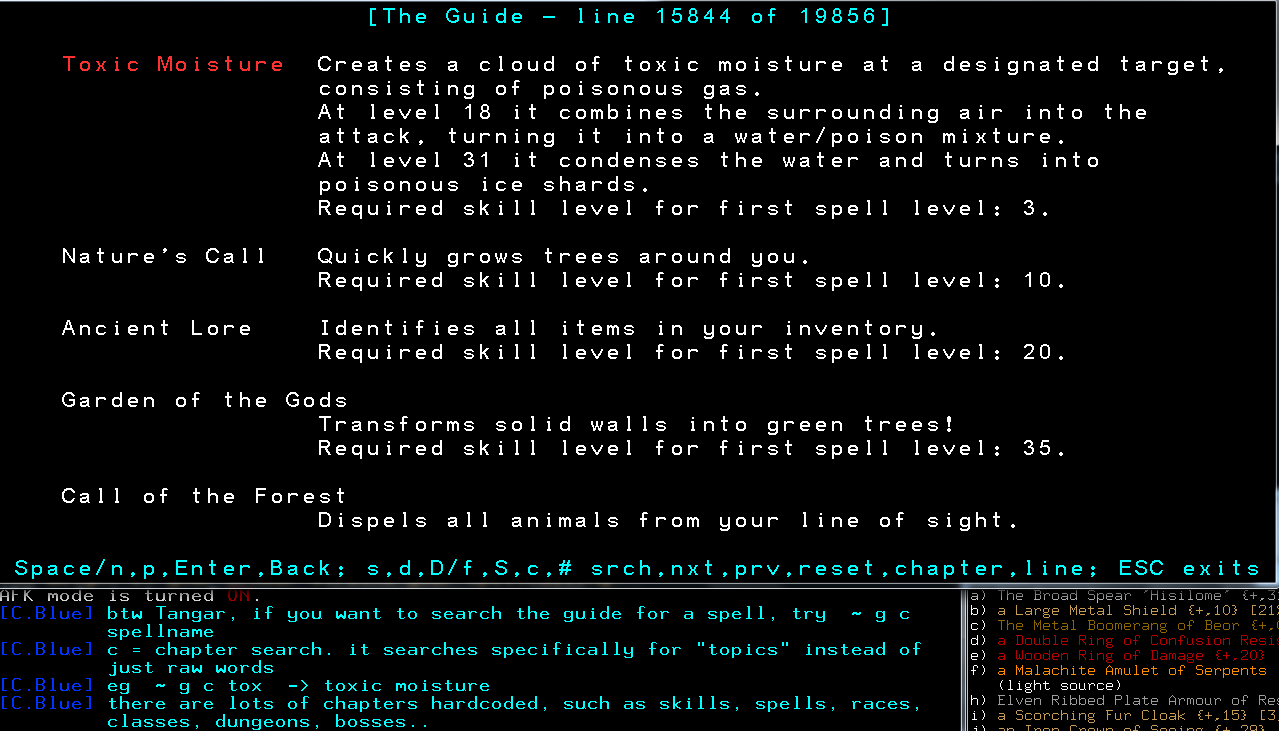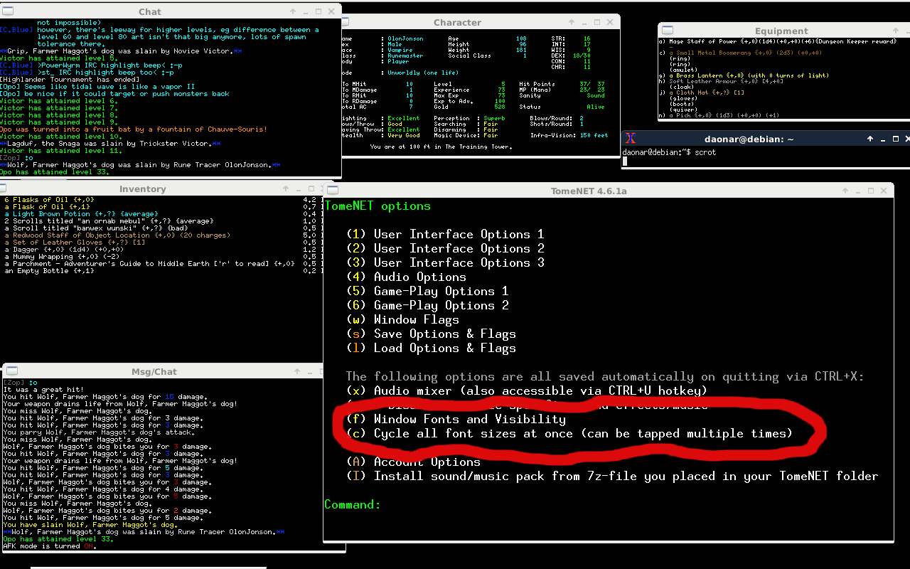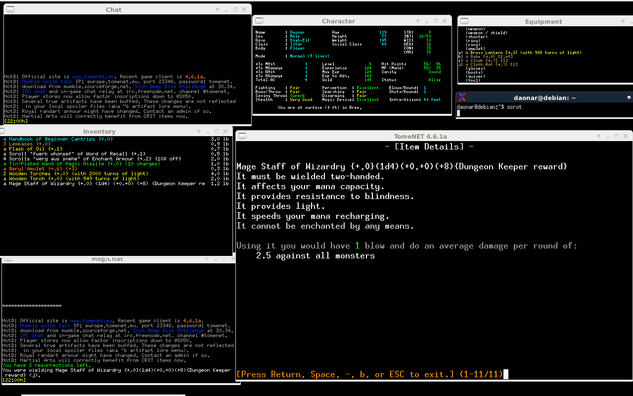 >>366 (OP) Народ, крайне тяжко вкатываться в сей моднейший "рогалик" но есть какая нибудь конфа в джаббере или ирке? Или хотя бы какая нибудь пачка русскоязычных гайдов? http://tangar.info/tomenet/ Играю с ником Azazel, по толкиену дико не теку но LOR почитал вместе с Сильмарилионом и Хоббитом, за плечами Nethack, Angband