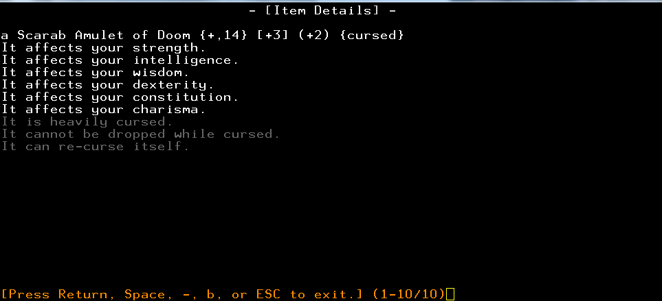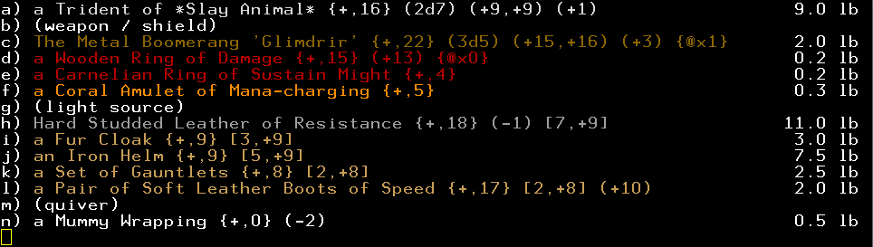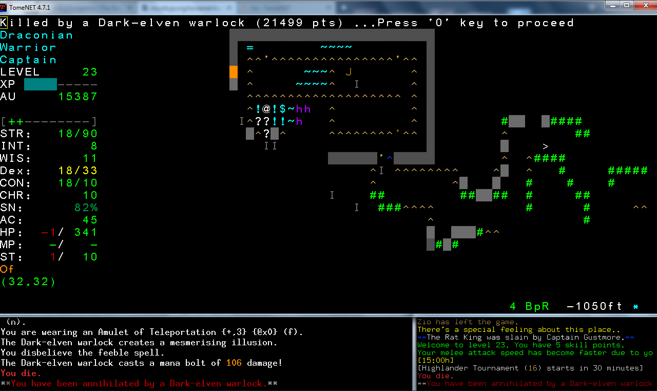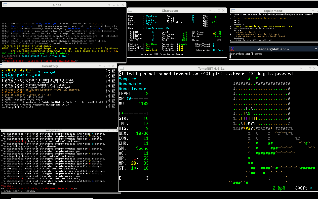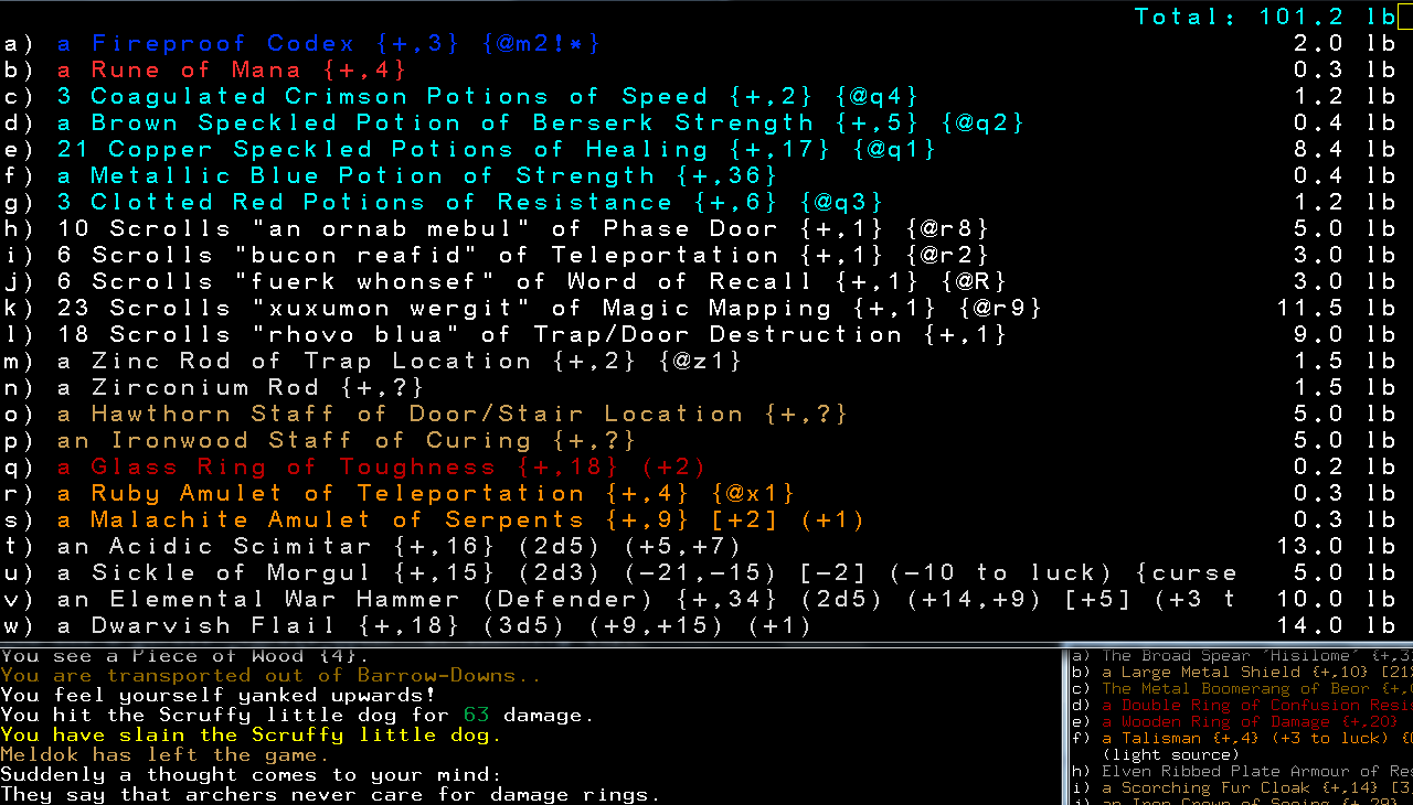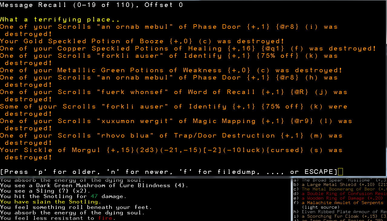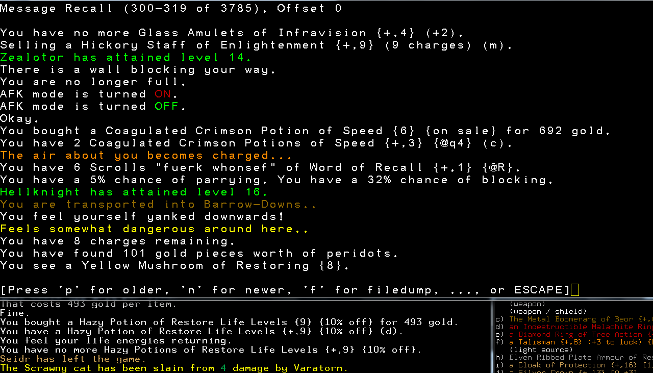 Спустился до -1500, расслабился. Перестал чекать базу монстров. Попалась годная открытая земля, но предчувствие большого испытания при этом. Когда из укрытия вывалилась шайка темных эльфов-варлоков, я решил, что вот это и есть челлендж, хотя сейчас вспоминаю, что челлендж - это монстр на пару десятков уровней выше уровня локации. Но до сих пор я игнорил места с предчувствием челленджа, ходил только на уников по своему уровню. Как итог: стоит в поле барлог, красивый фиолетовый U, стоит не двигается, вокруг мелочь копошится, а варлоков я расстрелял шэдоу болтом с предельной дальности - ну я и покусился. Еще смутило, что он был Lesser, то бишь младший барлог. И он огнем в меня плюнул на 200 ХП от моих 260. Я банку выпил, кинул пару болтов в ответ на автомате, следом получил еще -200 и умер. Мог бы сожрать резист от огня и запросто отхилялся бы на двойных резистах, но я ж на расслабоне шел. Вдобавок это ж демон, а я его черной магией, ага. YASD. В ваниле Ангбанда я такие ситуации запросто разруливал. Осталось ХП на донышке - пьешь лечилку помощнее, делов-то. Видишь заодно, что много чет огнем прилетает, пьешь второй резист, если забыл перед боем. А здесь время тикает и глупость наказуема вдвойне.