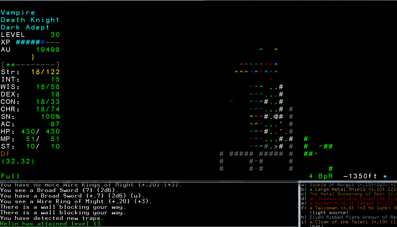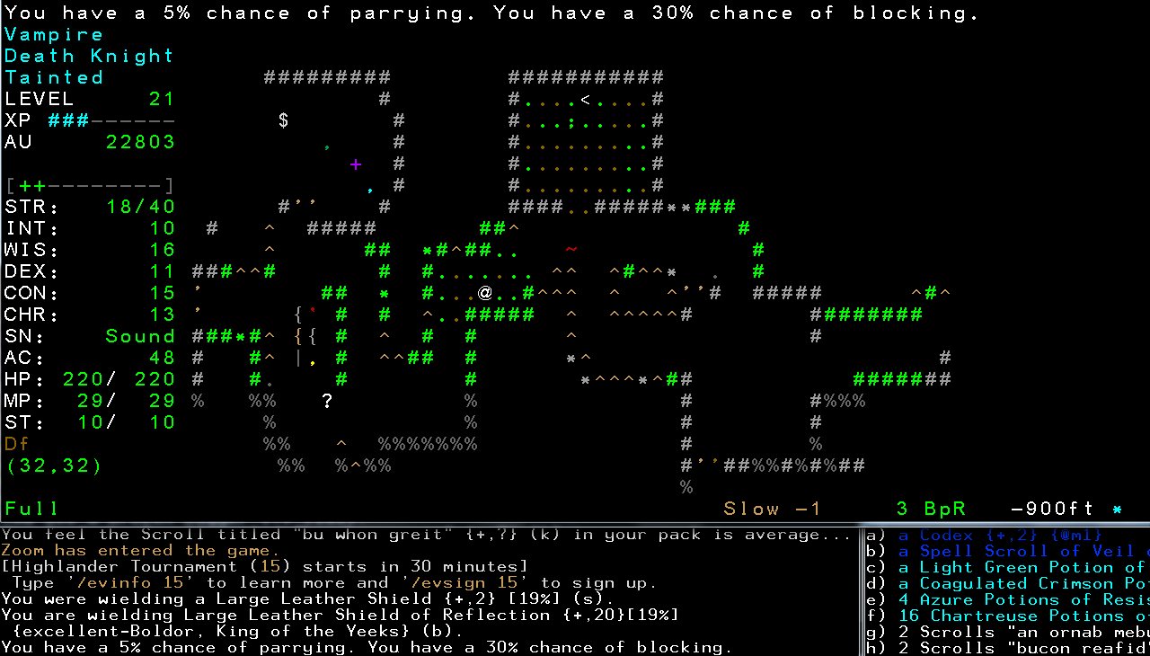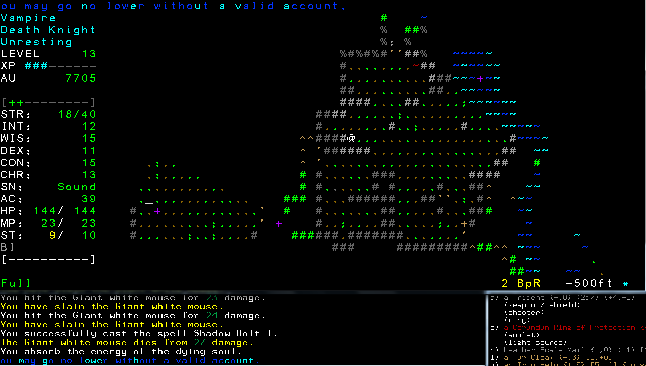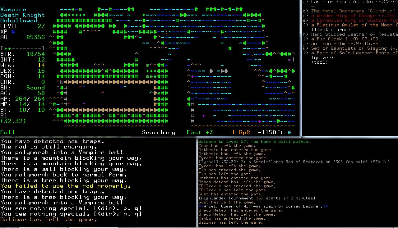 Состоялась эпическая битва с Болдором, королем йииков. Тот случай, когда уника надо избегать, но зато в сражении лучше понимаешь, что он из себя представляет. Болдор - на первый взгляд слабый уник. Не очень здоровый, не может наносить прямой урон, имеет скудный арсенал заклинаний. Но благодаря последнему и крайне быстрому повтору каста (1 в 3 тика) он абузит заклинание призыва. Кидает в тебя кучи йииков, гончих, орков, светлячков. Другие его спеллы - блинк, ослепление и замедление. Абзац для игрока-рыцаря смерти. Что такое рыцарь смерти. Это чувак, который из лука может попасть только в собственный зад, не имеет спеллов лечения, ускорения или защиты, не имеет статов воина из-за заливки в мудрость, страдает от лимита веса брони ("средняя броня"), не может брать по оружию в каждую руку, не может успешно пользоваться двуручным оружием из-за веса и нехватки STR+DEX+Mastery. В TomeNET магам сильно подкрутили любовь к блинку, поэтому если даже ты на банке ускорения и спринте подбегаешь к кастеру, он тут же блинкается из поля зрения. Можешь даже побить чуток, но одноручной рапирой со щитом много не набьешь, потом все равно блинк и быстрое восстановление босса. Многие уники ходят через "стены". Как видно из первого пика, Болдор обитает в роще. Он вместе с полчищами йииков может свободно ходить через зеленые тайлы туда-обратно, если поранился, не только блинкаться. В результате половину банок лечения я потратил, чтобы отбиться от начального легиона йииков. Потом потратил все банки скорости, но не догнал Болдора. Попутно пришлось дико вилять жопой, отбиваясь от разных гончих, элитных уруков и йииков-магов - они то и дело призывались вокруг персонажа. Укрывался за углами, маги сносили куски данжа нюками, перекатывался, кидал масс слип на уруков и шэдоуболты в магов. Всё горело и взрывалось. Вдобавок все мои резисты - на кольцах с черного рынка. На одном макросе по ТРИ предмета, плюс банки. Распробовал некоторые спеллы рыцаря. Aspect of Peril - бранд ядом, удваивает атаку против многих гуманоидных монстров, но стоит 15 маны, а длится только несколько тиков. Без прокачки магии ради манапула это слишком затратная хрень. Включил вместе со спидами, убил пару отрядов и остался без маны и эффект всё. Shadow Bolt - поскольку нормально стрелять рыцарь не может ни из чего, то это его магический арбалет. Урон слабый, но стоит всего 3 маны, можно спамить. Попутно из убитых рыцарь высасывает немного маны тауматургией, если умеет, и продолжает спамить болт. Слабо, но дальнобойно и спамится. Прекрасно убивать колдунов, которые иначе бликаются. Плохо работает против злых, например, темных эльфов - бранд тьмы. Veil of Night - слип и масс слип на II ранге. Работает против гуманоидных, не кастеров. Часто бывает, что некуда спрятаться - выбор между широкими коридорами или залами. Вуаль - и побежал в другое место или резать по одному спящих. Атакуемые просыпаются сразу, а соседние могут проснуться от звука ударов. Особенно когда бьешься с нагой, эхо на весь данж. В итоге Болдора закидал болтами, оттеснил в гранитный угол и он перестал блинкаться. Тут ему и пизда. Нюкер мог бы его поди с 1-2 плюх вырубить. Рога бы точно с одной стабнул. Снял с него щит на рефлект, опять без стихийных резистов.