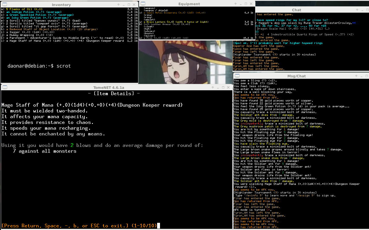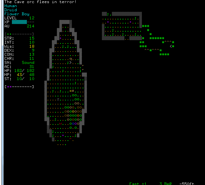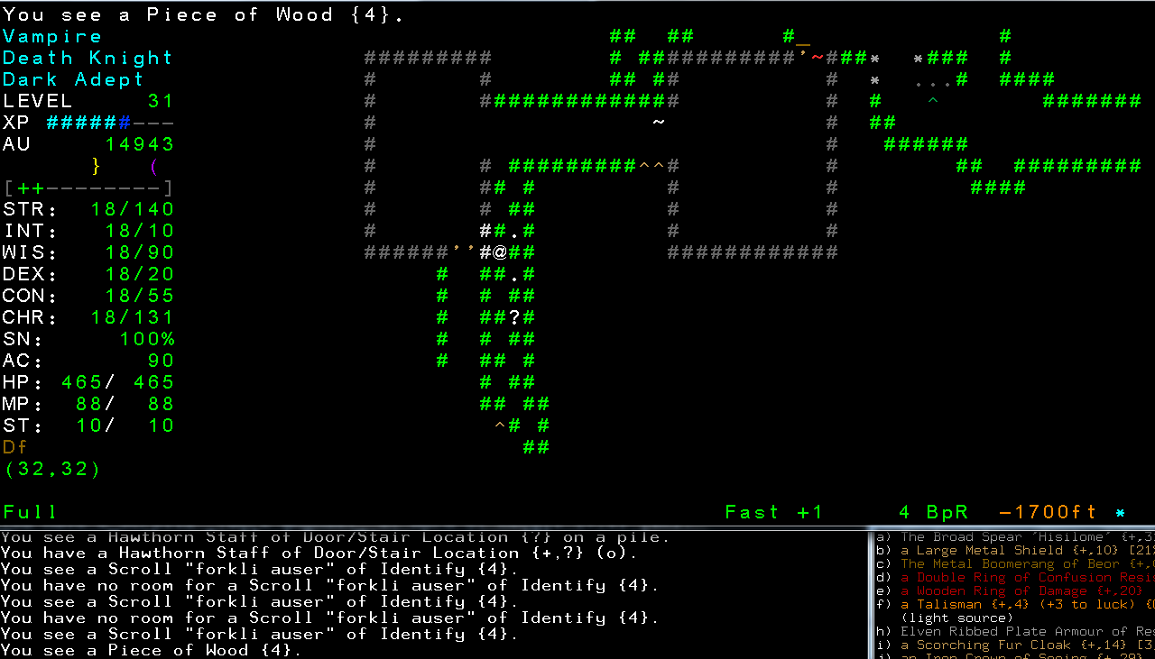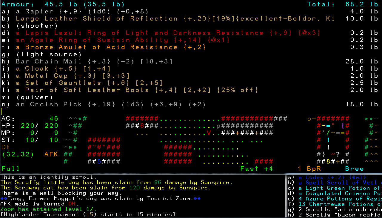 Состоялась эпическая битва с Болдором, королем йииков. Тот случай, когда уника надо избегать, но зато в сражении лучше понимаешь, что он из себя представляет. Болдор - на первый взгляд слабый уник. Не очень здоровый, не может наносить прямой урон, имеет скудный арсенал заклинаний. Но благодаря последнему и крайне быстрому повтору каста (1 в 3 тика) он абузит заклинание призыва. Кидает в тебя кучи йииков, гончих, орков, светлячков. Другие его спеллы - блинк, ослепление и замедление. Абзац для игрока-рыцаря смерти. Что такое рыцарь смерти. Это чувак, который из лука может попасть только в собственный зад, не имеет спеллов лечения, ускорения или защиты, не имеет статов воина из-за заливки в мудрость, страдает от лимита веса брони ("средняя броня"), не может брать по оружию в каждую руку, не может успешно пользоваться двуручным оружием из-за веса и нехватки STR+DEX+Mastery. В TomeNET магам сильно подкрутили любовь к блинку, поэтому если даже ты на банке ускорения и спринте подбегаешь к кастеру, он тут же блинкается из поля зрения. Можешь даже побить чуток, но одноручной рапирой со щитом много не набьешь, потом все равно блинк и быстрое восстановление босса. Многие уники ходят через "стены". Как видно из первого пика, Болдор обитает в роще. Он вместе с полчищами йииков может свободно ходить через зеленые тайлы туда-обратно, если поранился, не только блинкаться. В результате половину банок лечения я потратил, чтобы отбиться от начального легиона йииков. Потом потратил все банки скорости, но не догнал Болдора. Попутно пришлось дико вилять жопой, отбиваясь от разных гончих, элитных уруков и йииков-магов - они то и дело призывались вокруг персонажа. Укрывался за углами, маги сносили куски данжа нюками, перекатывался, кидал масс слип на уруков и шэдоуболты в магов. Всё горело и взрывалось. Вдобавок все мои резисты - на кольцах с черного рынка. На одном макросе по ТРИ предмета, плюс банки. Распробовал некоторые спеллы рыцаря. Aspect of Peril - бранд ядом, удваивает атаку против многих гуманоидных монстров, но стоит 15 маны, а длится только несколько тиков. Без прокачки магии ради манапула это слишком затратная хрень. Включил вместе со спидами, убил пару отрядов и остался без маны и эффект всё. Shadow Bolt - поскольку нормально стрелять рыцарь не может ни из чего, то это его магический арбалет. Урон слабый, но стоит всего 3 маны, можно спамить. Попутно из убитых рыцарь высасывает немного маны тауматургией, если умеет, и продолжает спамить болт. Слабо, но дальнобойно и спамится. Прекрасно убивать колдунов, которые иначе бликаются. Плохо работает против злых, например, темных эльфов - бранд тьмы. Veil of Night - слип и масс слип на II ранге. Работает против гуманоидных, не кастеров. Часто бывает, что некуда спрятаться - выбор между широкими коридорами или залами. Вуаль - и побежал в другое место или резать по одному спящих. Атакуемые просыпаются сразу, а соседние могут проснуться от звука ударов. Особенно когда бьешься с нагой, эхо на весь данж. В итоге Болдора закидал болтами, оттеснил в гранитный угол и он перестал блинкаться. Тут ему и пизда. Нюкер мог бы его поди с 1-2 плюх вырубить. Рога бы точно с одной стабнул. Снял с него щит на рефлект, опять без стихийных резистов.