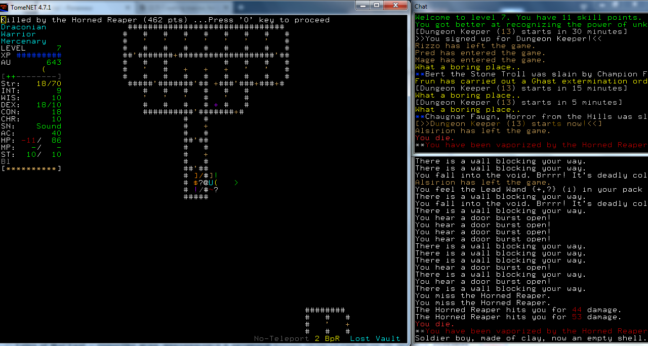 В TomeNET чертовски запутанная ролевая система. Пока разобрался, несправедливо считал многие вещи бесполезными. Монстры надерганы из разных бандов http://muuttuja.org/tomenet/monsters/ Резисты перекрывают друга друга. Флаги монстров перекрывают друг друга. Есть комплексные флаги, которые в мануале толком не раскрыты - по сути это целая куча флагов в одном наименовании типа ДРАКОН или КОНСТРУКТ. При этом только обрывочная инфа, какие резисты склеены в таком флаге. Даже в файлах клиента ты не увидишь четкой таблицы. Кроме того, частью риалтайма являются временные карманы. Чем ниже ты спускаешься, тем больше на тебя вешается базового замедления. Это значит, что без вещей на скорость ты увидишь, как мобы настигают тебя со скоростью гепарда и бьют 9 раз подряд. Это нужно, чтобы преодолеть лимиты движка на фреймы и ты мог и сам наносить кучу ударов подряд. Однако предметы на скорость в TomeNET - самые редкие. Поэтому ты охуеешь от гриндана. Вот и получается, почему выгодно играть в команде. Чистые банды или их склейки типа TomeNET очень математичны и это игры на запоминание. Если ты помнишь флаги моба, то можешь эффективно его опиздюлить. Если ты знаешь скорость моба, то выпьешь батиных трав заранее или заюзаешь палку телепорта на моба. Еще одно серьезное и неприятное отличие от Ангбанда - в детекте ловушек. Если ты не разбойник, то пользуешься заклинаниями или магическими предметами. Вот только в Ангбанде ты получаешь временный статус на детект и видишь ловушки везде, где проходишь, а в TomeNET - вскрываешь их единожды в небольшом радиусе от каждого каста. Если кастовать все время, заряды в палке кончатся быстро. А ловушки пиздец опасные. Ваншотают нахуй. Еще прямиком из ктулхачей система безумия - и ловушки с разными галлюцинациями. Сойдешь с ума - проиграешь.
