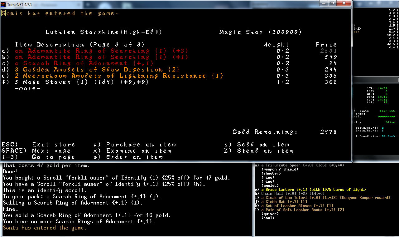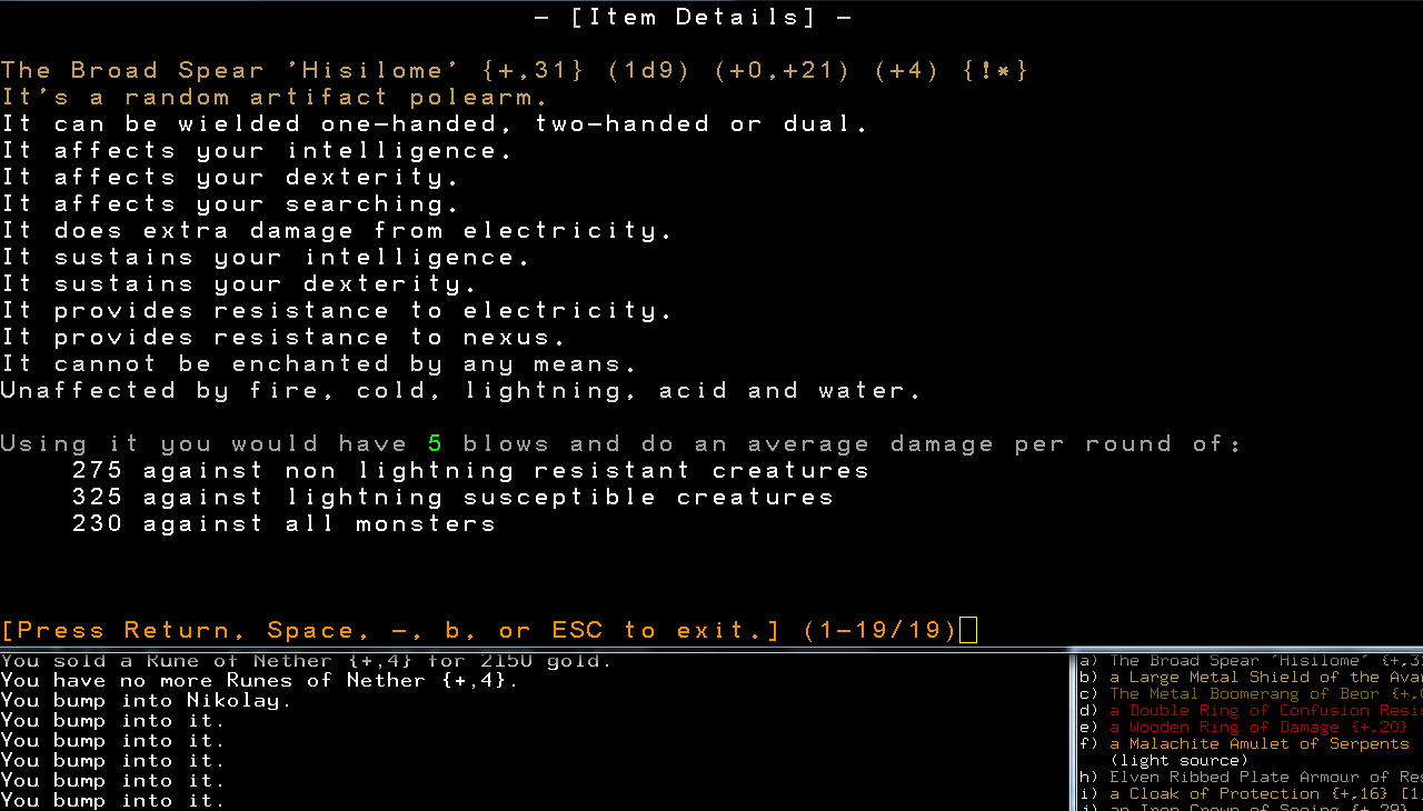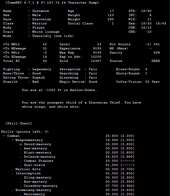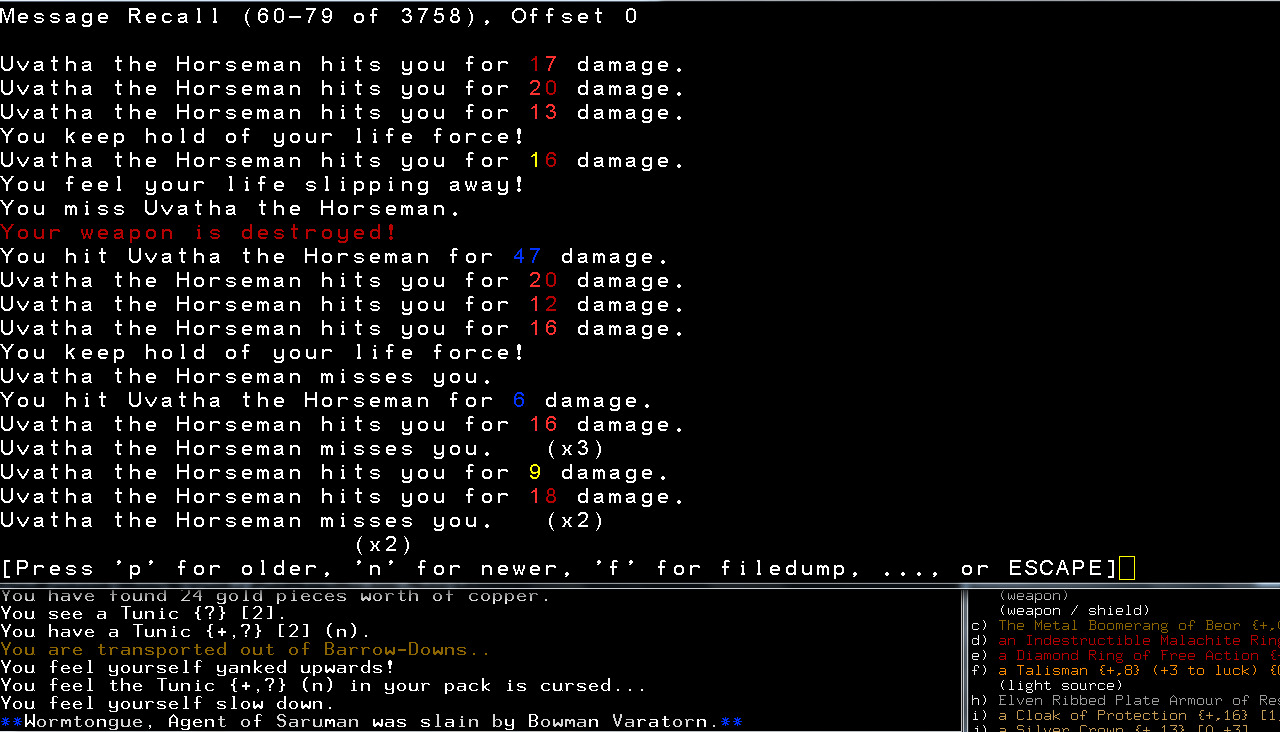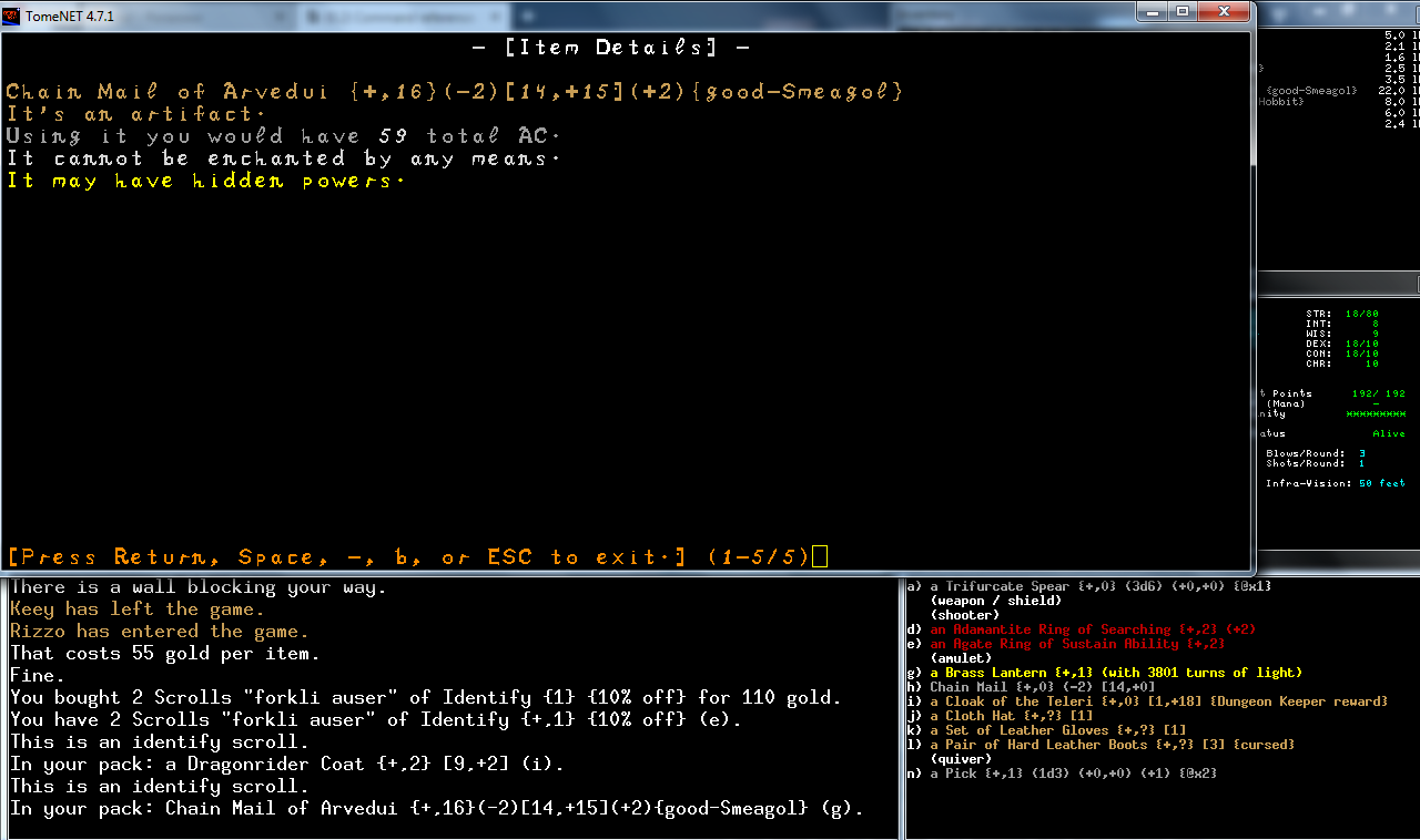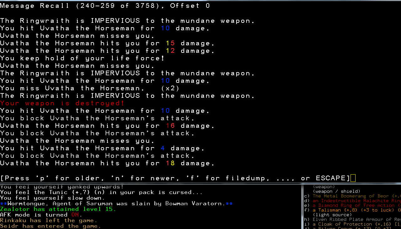 В общем всё закончилось вполне ожидаемо. Разработчик не почесался, чтобы написать в мануале, какие подземелья можно покинуть только со дна. По меньшей мере это 32:31 "канализация", Мория и Эребор. По мерке данжа нельзя выйти раньше -1000 футов, нет рекола, лестницы пропадают за спиной. Ты можешь спуститься, а там содом, но назад не вернуться. Мне стало скучно в Кирит Унголе, потому что полно личей и бехолдеров, которые сводят с ума. Довели до постоянных флешбеков, и только смерть какого-то лавкрафтовского уника принесла лекарство. Плюс паутина, которая горит от дыхания вместе со свитками, не укрывает от гончих. И пришел я в Морию. Оказалось, что дно ето я - 50 уровень примерно. Против моего 35-го. Спустился на -950 футов. Следующий этаж - и вышел бы. Но РАЗУМЕЕТСЯ примерно с -800 за мной стали гоняться назгулы. Назгул тебя везде видит и ходит насквозь, а ты должен искать лестницу. Причем подземелье извилистое, коридоры забиты отрядами демонов, но ты как-то должен держать дистанцию. На -950 я лестницу не нашел, потратил все свитки, и назгул меня достал. Толпа зажала после вынужденного телепорта и кто-то спиздил копье, а остальное оружие посыпалось, как песок. Так что я тупо допивал банки и бил морды кулаками. Но поскольку я не кунг-фу панда, а рыцарь, это была худшая минута ожидания смерти. Так-то с 670 HP и банками можно держать любого уника, но когда не наносишь урона, это всё. Как выяснилось, назгула вояке не убить оружием без Slay/Kill Undead. Это помимо того, что неартефактное просто рассыпется от пары ударов. То есть нужен и артефакт, и Slay/Kill Undead. Обычно это благословенное оружие, которые хуярит вампира. К тому же, слишком дорогое. По тяжелой броне назгулы наносят ничтожный дамаг. Магией по резисту от Nether - 150-250 урона. Если есть возможность, то уже уровне на 30 желательно заиметь подходящий кусок металла и упокоить пару призраков, чтобы кровь не портили. Еще одна проблема - все играют или на бессмертии или с тремя жизнями, что в итоге завалило дома и магазины барахлом. В твоей лавке ничего не купят. Продавай NPC за бесценок. Трудно денег насосать на что-нибудь. К тому же, можно увидеть, как возле черных рынков трутся толпы игровых твинков-воров, которые воруют мэйнам нужные вещи вместо покупки.