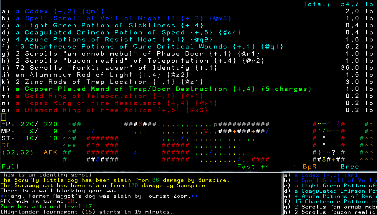 Ошиваюсь на -1700. Следующий этаж принадлежит Призраку Могильников, но я не спускаюсь, потому что не знаю, что решить с защитой от страха. Слишком затратно покупать кольчугу с резистом. И слишком нудно фармить банки смелости на первых этажах. В храме продаются зелья героизма, но они не дают временный резист, а лишь снимают страх. Вообще не очень, что некоторая нежить в TomeNET испытывает страх. Базовые ожившие трупы и вампиры, например. В форме летучей мыши я страху не подвержен, но в этой форме всего 1 атака холодным оружием. Колдовать нормально, но не колоть. Еще что касается вампиров, у меня какой-то бзик и я путаю холодный вихрь (v) с обычным вампиром (V). Мне всё время кажется, что передо мной БОЛЬШОЙ вихрь. Ненавижу вихри, ведь они портят вещи. Такой же номер с виверной (d) и назгулами (W). Мне всё кажется, что виверна должна быть W, а так и подохнуть можно. Ну и эпичный замес на -1700: Почувствовал, что на этаже уник. Пошел искать. Напал на яму с черными ограми. Зарубился и ожидал, что уник вылезет. Вылезли маги и куилдахи (Quylthulg) - саммонящие кошмарики. Стал прыгать за угол и тут же макросом по ближнему выбивать саммонеров, а то пока прицелишься в толпе. Когда бац, не успел разом добить куилдаха и оказался посреди стаи кислотных гончих. Гончие понятно сразу дышат - сгорает половина свитков и кодекс с ударными спеллами. Я еще никогда не чувствовал себя таким беспомощным. Рыцарь смерти не может догнать мага, не может пользоваться стрелковым оружием - только преследовать и огребать. Прочитал телепорт и обмозговал. Там где-то осталась комната с кучей барахла с огров. В нем наверняка полно вкусняшек. Пришлось осваивать тактические тоннели. По-хорошему, это надо делать палочкой камень-в-грязь, но палочки очень уязвимы к магии и постоянно рассыпаются в сумке. Поскольку персонаж силен, то даже копьем быстро рубит лес. Топором, конечно, лучше. В Могильниках неприятный ландшафт, потому что многие монстры легко ходят через лес, воду, горы, а тут их много, но вот повезло и мне. Стал вырубать лес змейкой и заманивать туда кастеров. Из змейки кастеры выбегать почему-то не успевали. Кажется, обычно монстры меняются местами, а тут вот не могут. Задний подпирает переднего и убегает, а передний не успевает. Последних магов преследовал уже в яме на спринте, который сжирает всю стамину. С криками "нуууу, сссука, нуууу, давввааай". Спринт дает +10 скорость, что как раз помогает догнать глубинных монстров с их улучшенными спидами. Пару раз пришлось пить банки скорости, которые я берегу для боя, а не беготни. Когда стал сортировать барахло, не знал, куда деваться от "рарок". Но через минуту подвалил огромнейший отряд темных эльфов-варлоков и отогнал меня мана болтами. Выкопал еще кусок леса (это всё для вас, сраные эльфы) и перебил варлоков. Нападало банок пермастатов, супер. Дальше прикол. Хотел же найти уника. Делаю шаг в новый коридор, а там просто тьма варлоков, причем передние уже возле меня. Я на автобое пробиваю одного - ваншот. Из него падает пермабанка силы. Я сразу шаг назад. "Варлок не успел закончить заклинание, прежде чем вы вышли из поля зрения". Да, вот так можно. Ну, я жадный и снова шаг туда, хватаю банку, ловлю спелл щитом, шаг назад. Выкопал еще кусок леса, но устал и мисскликнул - попал по реколу, вернулся в город.