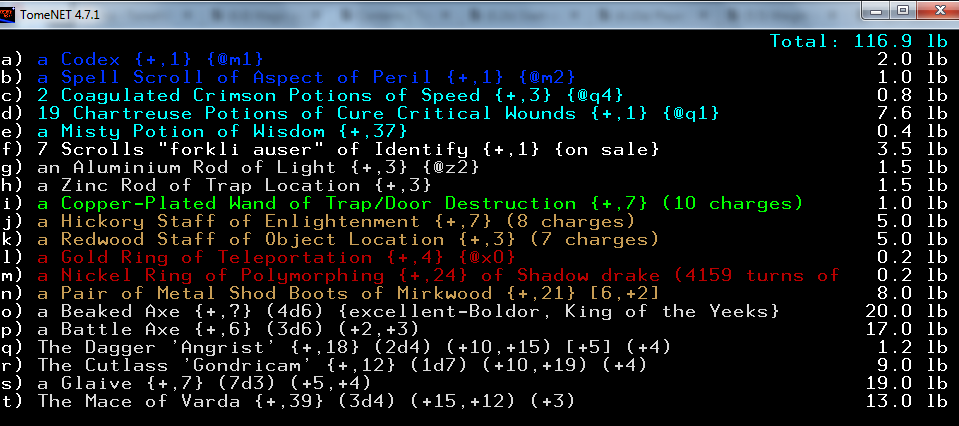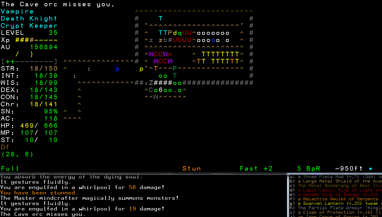 Зачистил одну великую сокровищницу и из одной сбежал, едва не обделавшись от драконов на 25 лвлов выше. В той, которую зачистил, заколол великого кристального дряка. У него дыхание осколками на 80% моего ХП. Просто повезло, что он не дышал ни разу - я даже резист не взял. Но мне и не так везло - один дракон оставил мне столько ХП, что вместо символа персонажа светился ноль, когда я портанулся. В общем глупости делал. На пике типичный грейт ваулт. Копаешь клетку, а оттуда неизвестно что выскакивает и всю морду отрывает. Без злой телепатии лезть не стоит. Если копать палочкой с расстояния, то в TomeNET монстр, который тебя заметил, будет плеваться магией туда, где ты спрятался. То есть это даже опаснее, чем если дракон сразу выйдет в упор на тебя. Иначе ты спрячешься за камень, а он просто плюнет АОЕ в то место и тебя накроет. Но вот что еще получилось. Великая сокровищница определяется предчувствием "What a terrifying place..". Сразу ясно, что там уники с этажей на 20-40 глубже. Другое предчувствие - "Feels somewhat dangerous around here..". Означает яму, гнездо или обычный ваулт. Так написано. Спускаюсь я такой, получаю это сообщение, а на меня назгул 52 лвла дропается. Вот это поворот. И главное он опять что-то бубнит про слабое земное оружие, хотя у меня артефакт. И бью я им по 20 всего-то. Может, надо истинным артефактом, а не рандартом колотить, не знаю. Не рассыпался - и на том спасибо. Проклятые назгулы, мам. Не дают проходу.