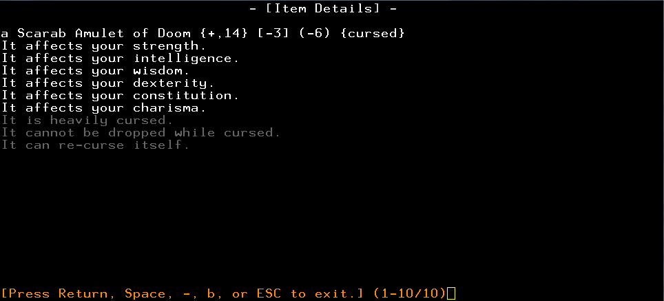>>24368 Я сейчас понял, что просто сдался и забыл про амулет телепортации. Конечно, я бы мог огрести после тп в кучу врагов, но мог бы и выход увидеть. Мог портануться в форме тумана с высоким стелсом. Глупо, очень глупо. И ведь я с таким трудом получил броню с предчувствием зла и научился ее носить, хотя она поджаривала вампира. А копье, скорее всего, один из демонов соблазнил. У меня от жадности инвентарь был забит под завязку, поэтому когда я снял копье, он упало на пол. Суккубов вроде не трогал, но назгул демонов призывал своих, хай лвл. В бандах так много всего надо учитывать постоянно. Какой-нибудь Cave of Qud даже казуальным кажется на их фоне. А в Dungeon Crawl я почти с первого раз прошел 5-рунку, просто полистав форум перед этим. Ну и риалтайм в конце концов.