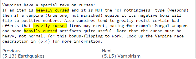 >>23779 Разобрался. В магазинах NPC все предметы автоматически определены, даже если ты их никогда не видел, но не в магазинах игроков. Поэтому смотришь по базе на сайте, покупаешь по названию и идентифицируешь. Кольцо дает вампиру + в резист от света и можно не заматываться в бинты. Природный - от света также остается. Получается ни резист, ни уязвимость. По мануалу, дыхание светом HP/6 < 400. Чтобы подышать на 400, нужно, чтобы у гончей было 2400 HP лол. Поэтому даже когда у меня не было кольца и на меня дышали низкоуровневые гончие, урон был не ахти. Повезло правда, что подышать успела только одна. А то обычная ситуация, когда ты сбегаешь с помощью свитка и попадаешь прямо в стаю гончих, они тут же пыхают и всё.