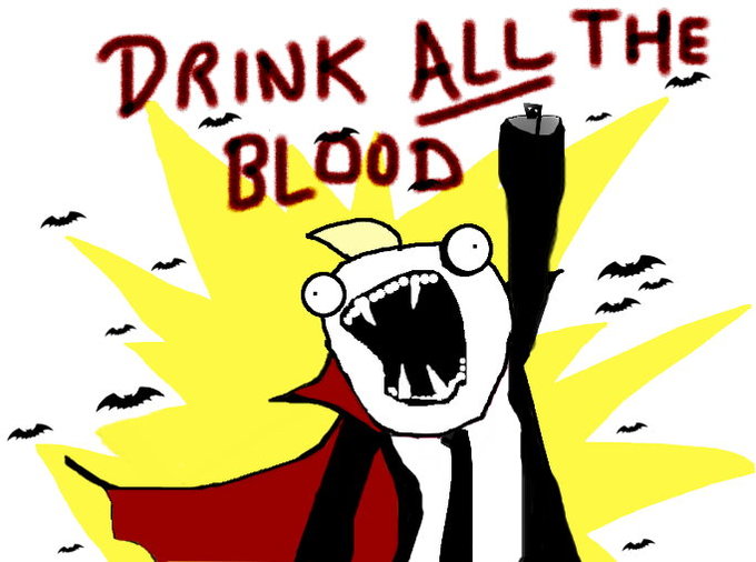 Вкачал вампиру топоры - самое трудное для него из оружия ближнего боя. И купил артефактный топор, хотя на нем божественное расположение. Купил нежити небесный артефакт. У меня еще есть кольцо защиты от света, но похоже, оно либо вовсе не спасает, либо слабо в сравнении с артефактом и плохо нивелирует пожирание топором моих ХП. Но у меня еще есть некромантия, хотя для уровня она развита в два раза слабее, чем можно. Некромантией можно автоматически пожирать павших и перегонять в ХП. Плюс природный вампиризм дает отжираться в бою. Внимание вопрос. Смогу ли я в бою выкачивать из врагов жизнь быстрее, чем топор из меня? До недавнего времени этот вампир еще и почти безумный был, потому что прошелся по ловушкам, влияющим на разум. Поехавший засранец с топором.