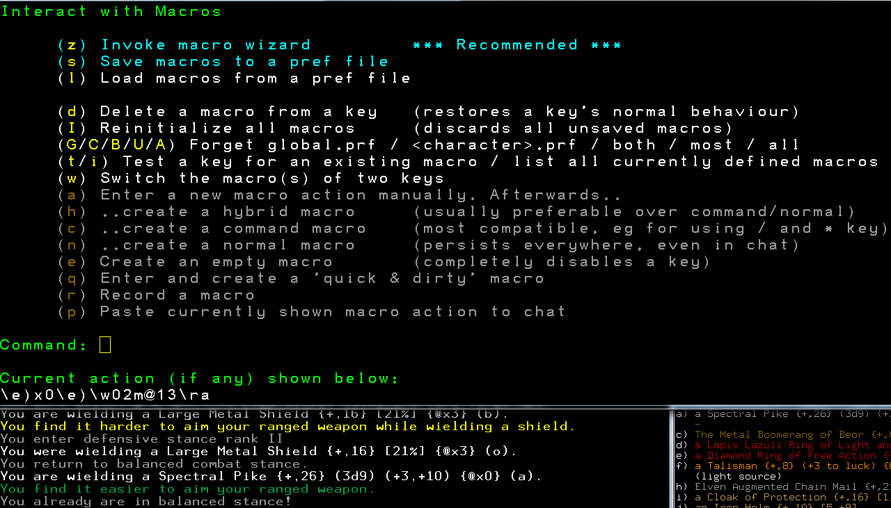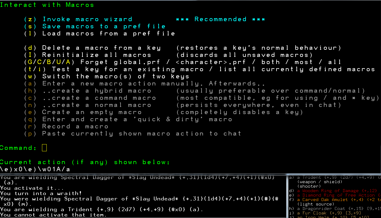 Написал макрос-мутант на выхватывание спектрального ножа и активацию с него призрачной формы. А всё с его началось - спиздил в таверне амулет удачи и нашел спектральный нож в хранилище. Оценил еще свитки магической карт. Во-первых, они абсолютно заменяют свитки поиска дверей, потому что подсвечивают и двери. Во-вторых, с ними легко искать хранилища. Меньшие сокровищницы даже без пермостен, только гранит, поэтому копаются стандартной киркой из лавки с любой стороны. Но долго. Минут 5-10 копал. Почуял "air of danger" на этаже, пропрыгал анкёрснутым амулетом телепорта, подсветил свитками карты - две сокровищницы увидел. Во второй нашел нож спектральный, который перезаряжается на форму призрака, а она позволят ходить сквозь стены. Хотя у хождения сквозь и минус свой - если монстры уже проснулись, набросятся разом, а так дыру прокопал и чистишь по одному. Однако если монстры сидят в клетках с тайными стенами, то свиток карты подсвечивает, если стены открылись.