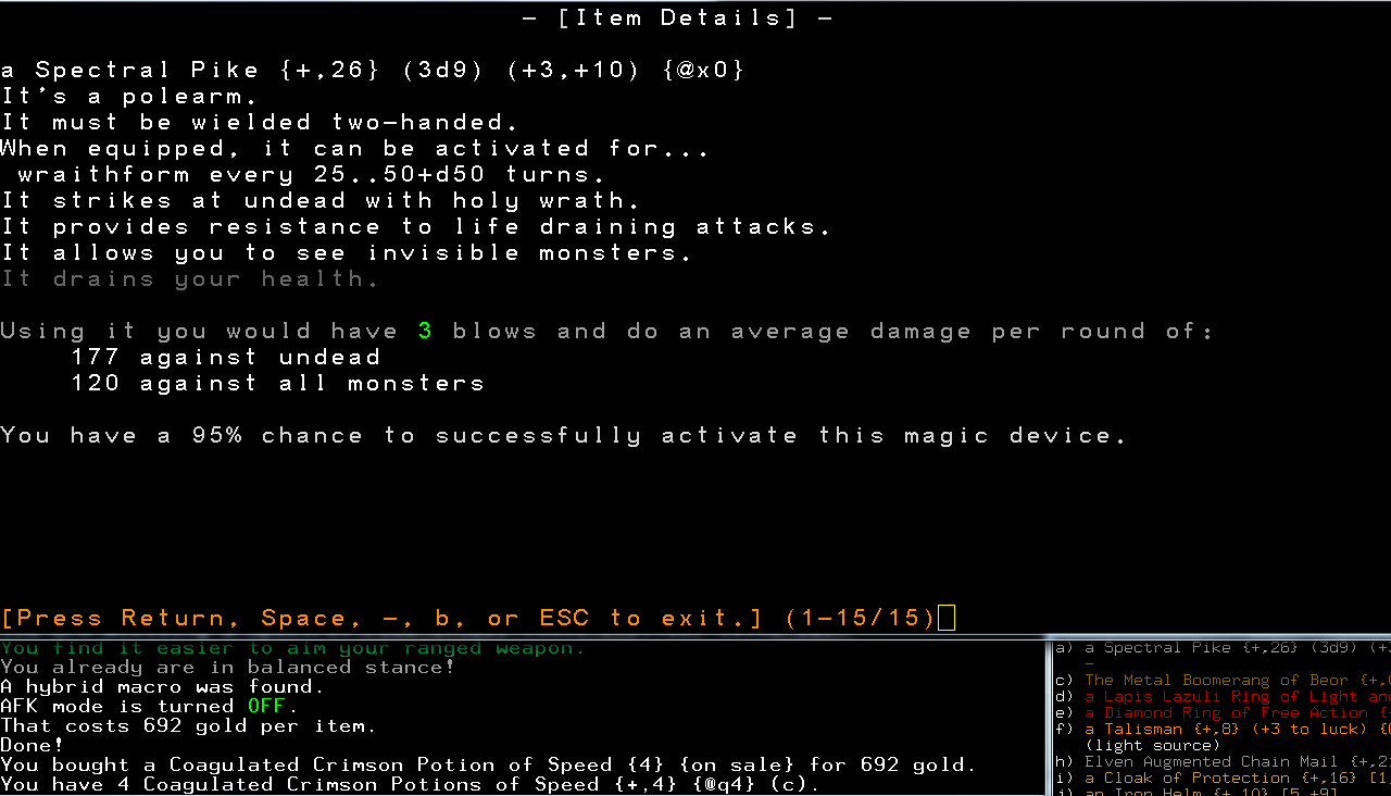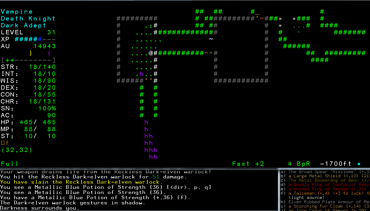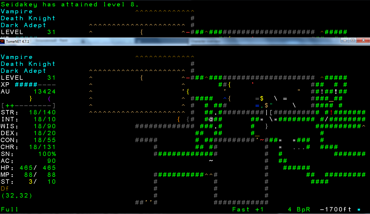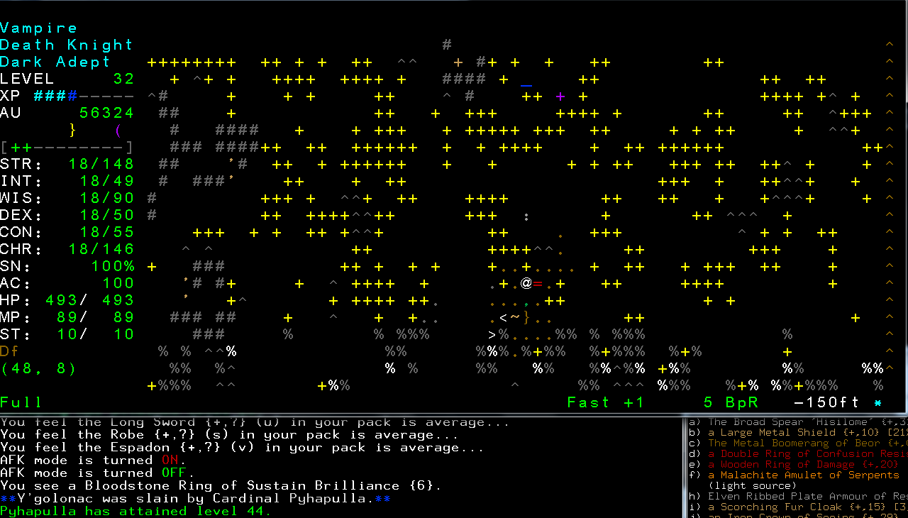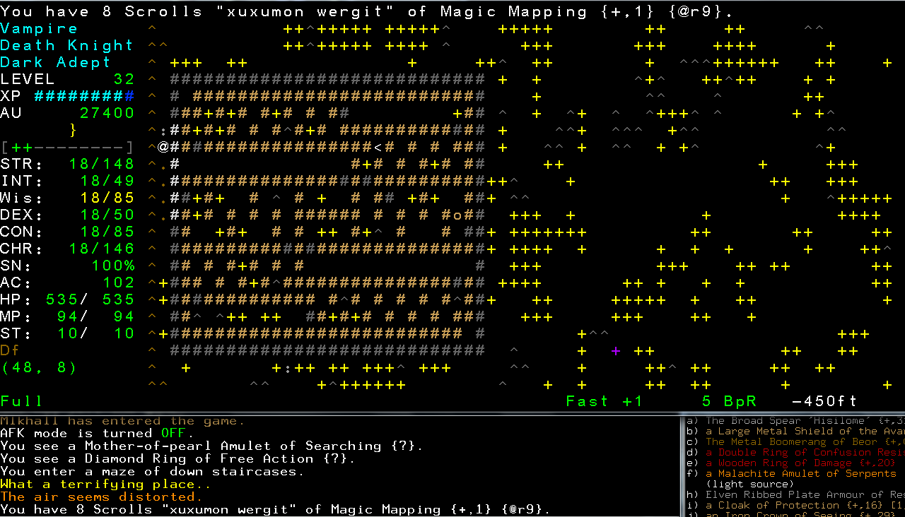 >>23660 Естественно это на 90% вылитый ангбанд. Всё что работает там работает и тут. Но да, ты правильно подметил. Навыки здесь нужны немного иные. Если в банде ты мог остановиться подумать, то тут надо шпилить на макросах как боженька, постоянно прожимая детект, хил, маппинг, заклинания, посохи, жезлы, абилки и т.д и т.п. А еще нужно знать большинство монстров на память. И не так как в банде (ой, что это за серая О, посмотрю-ка в монстер мемори), а на уровне рефлексов: "О, это серая О, срочно пить резисты". В общем экспириенс больше напоминает мады чем рогалики.